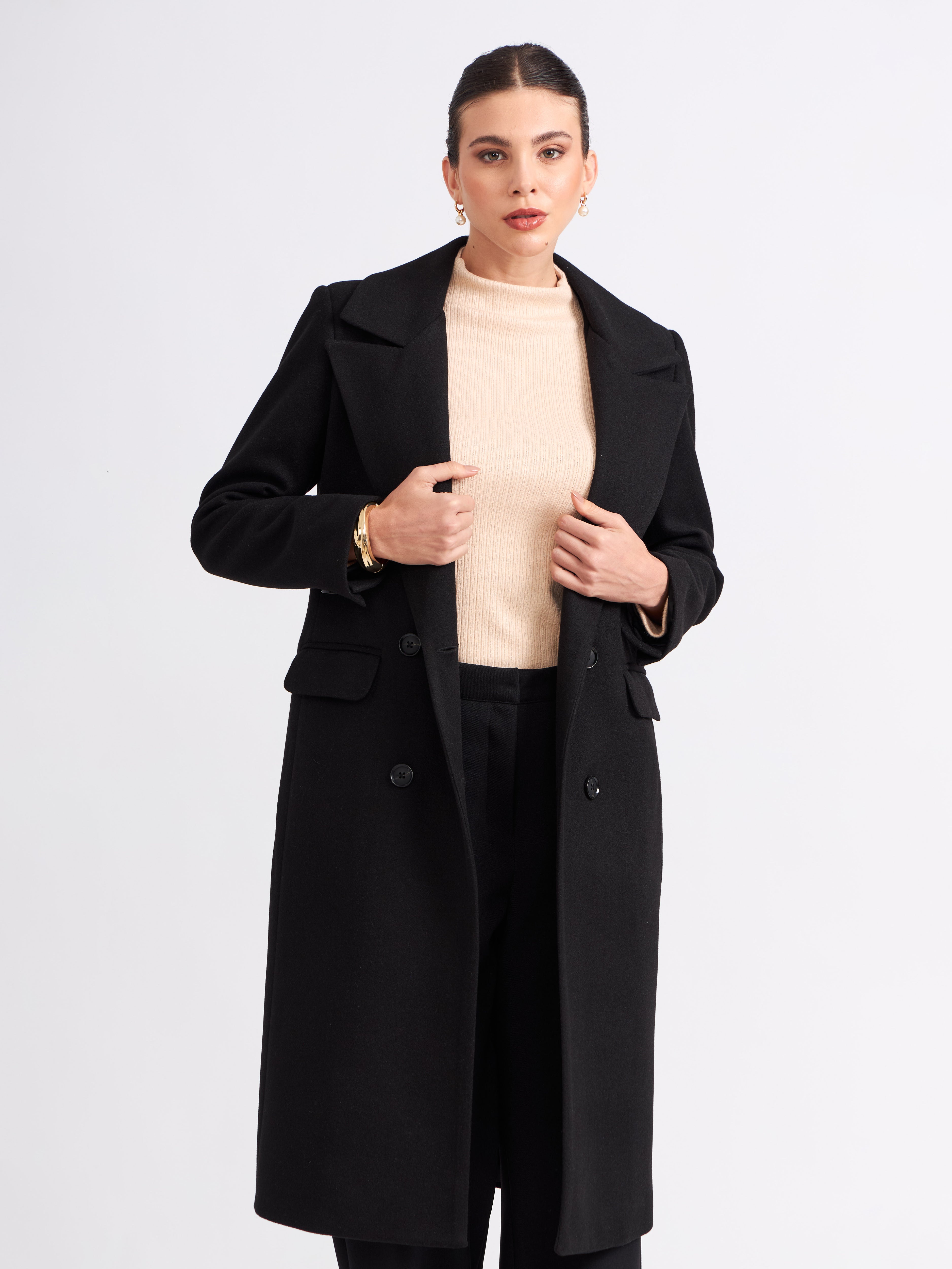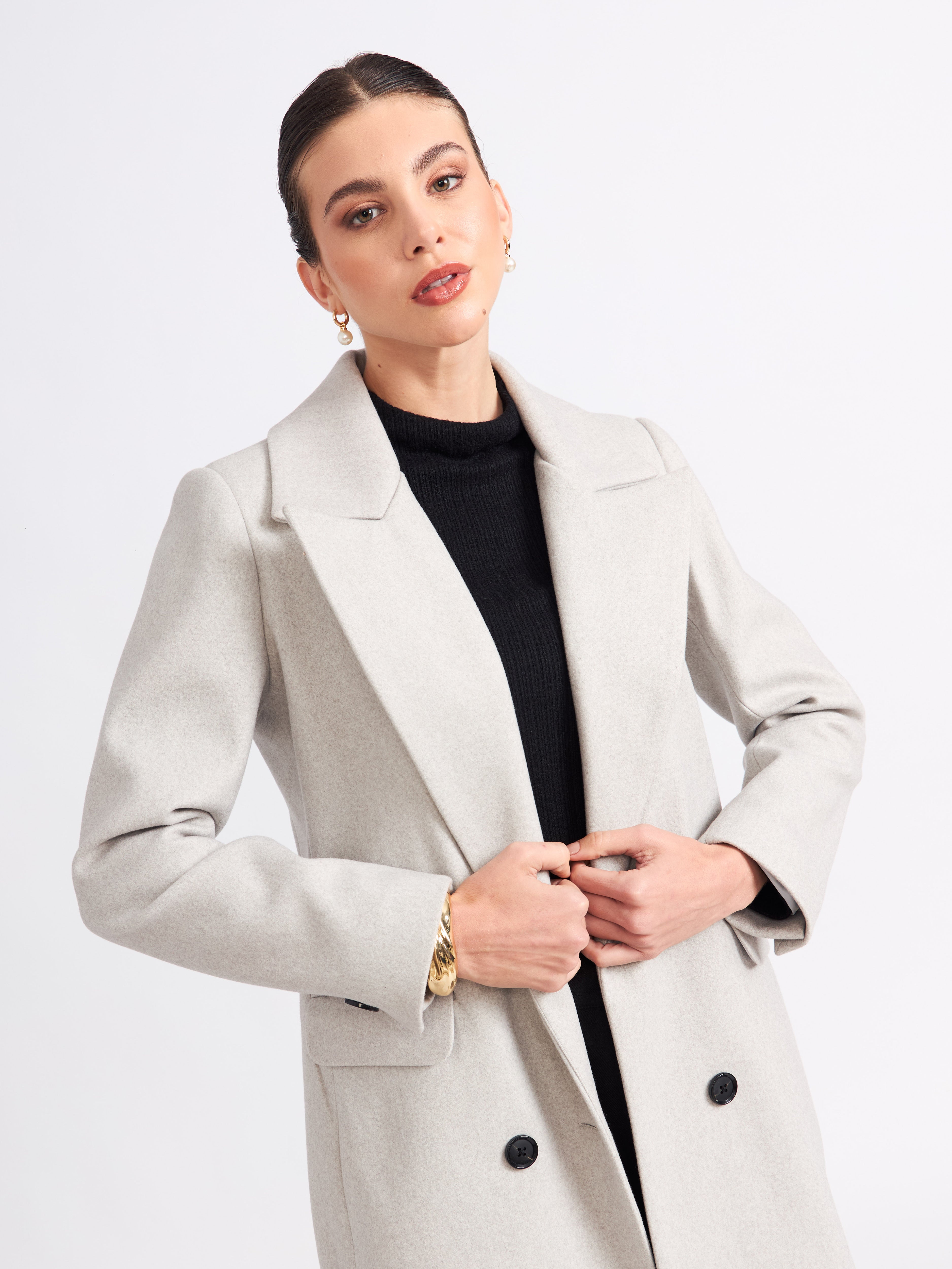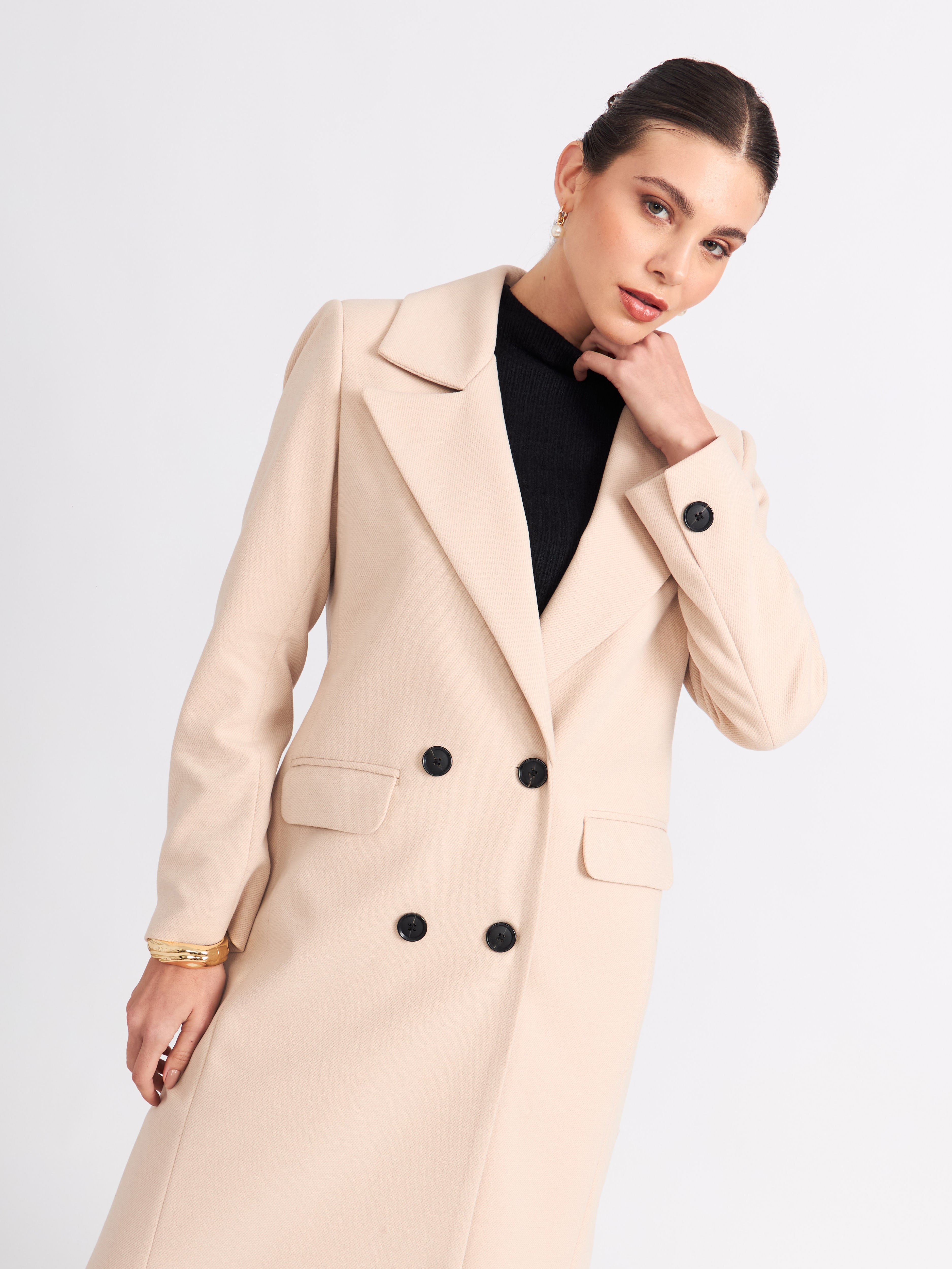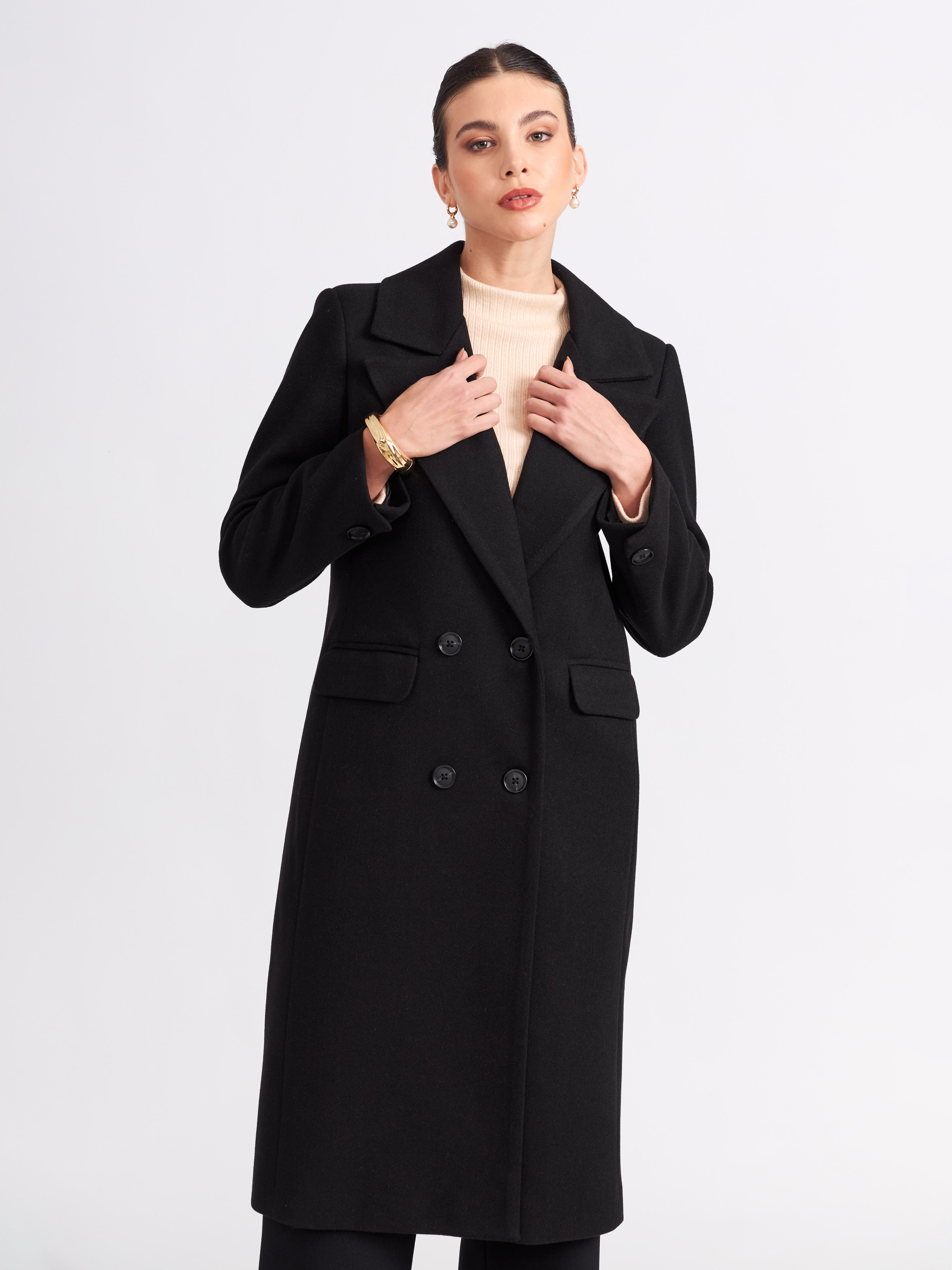 Abrigo largo cruzado fit regular. Con doble botonadura y bolsillos delanteros con solapa. Ideal para elevar todos tus looks.