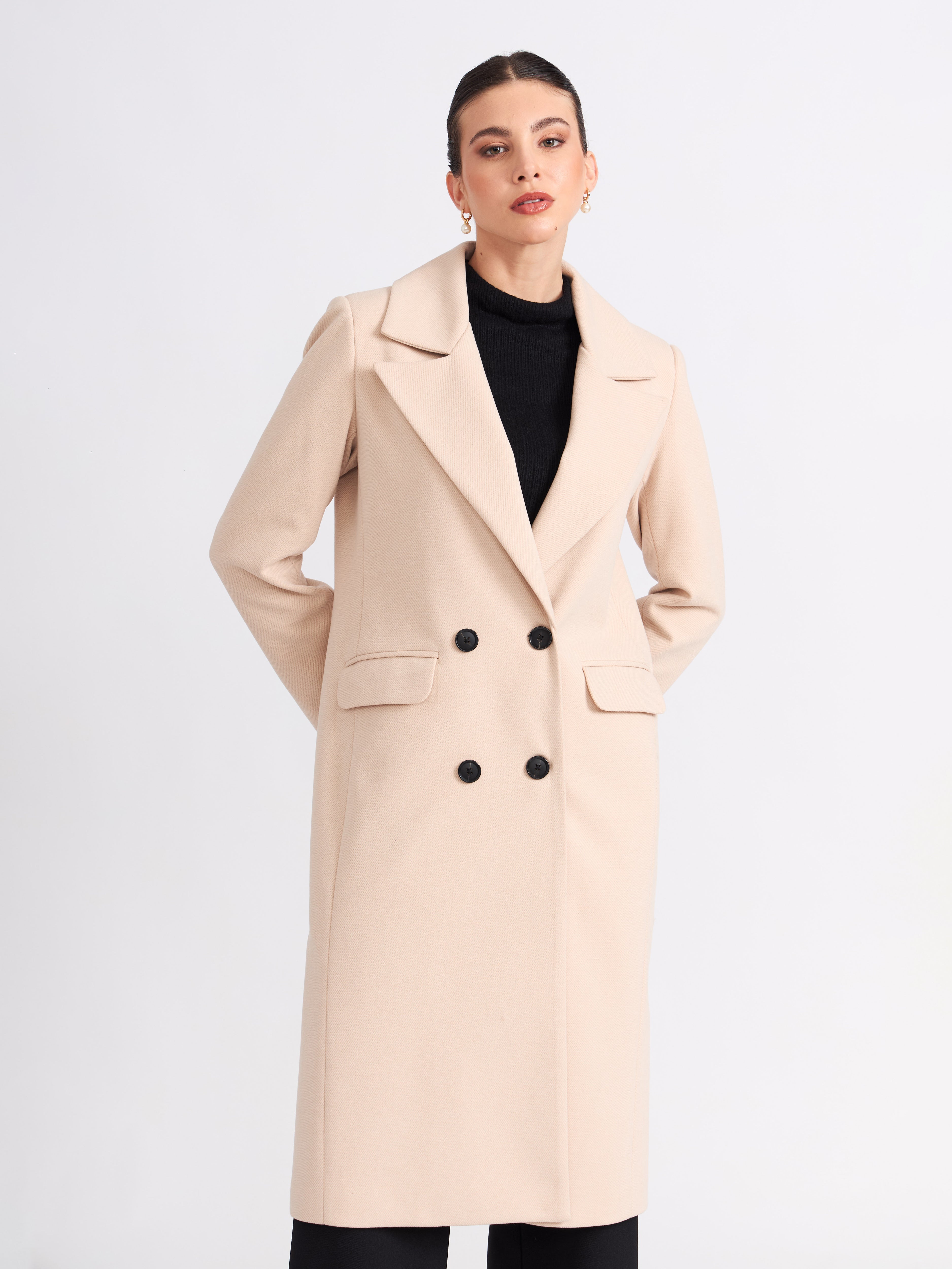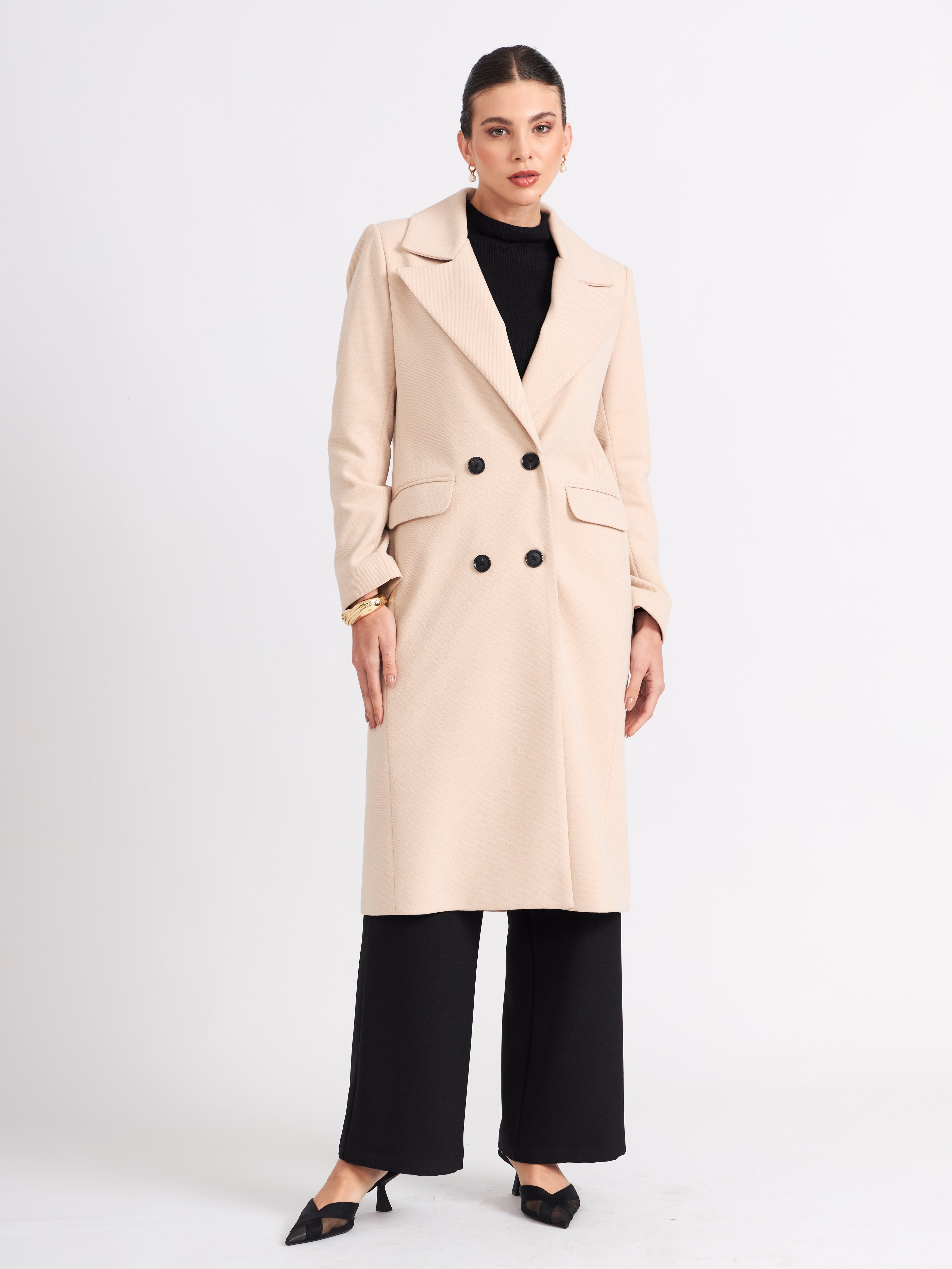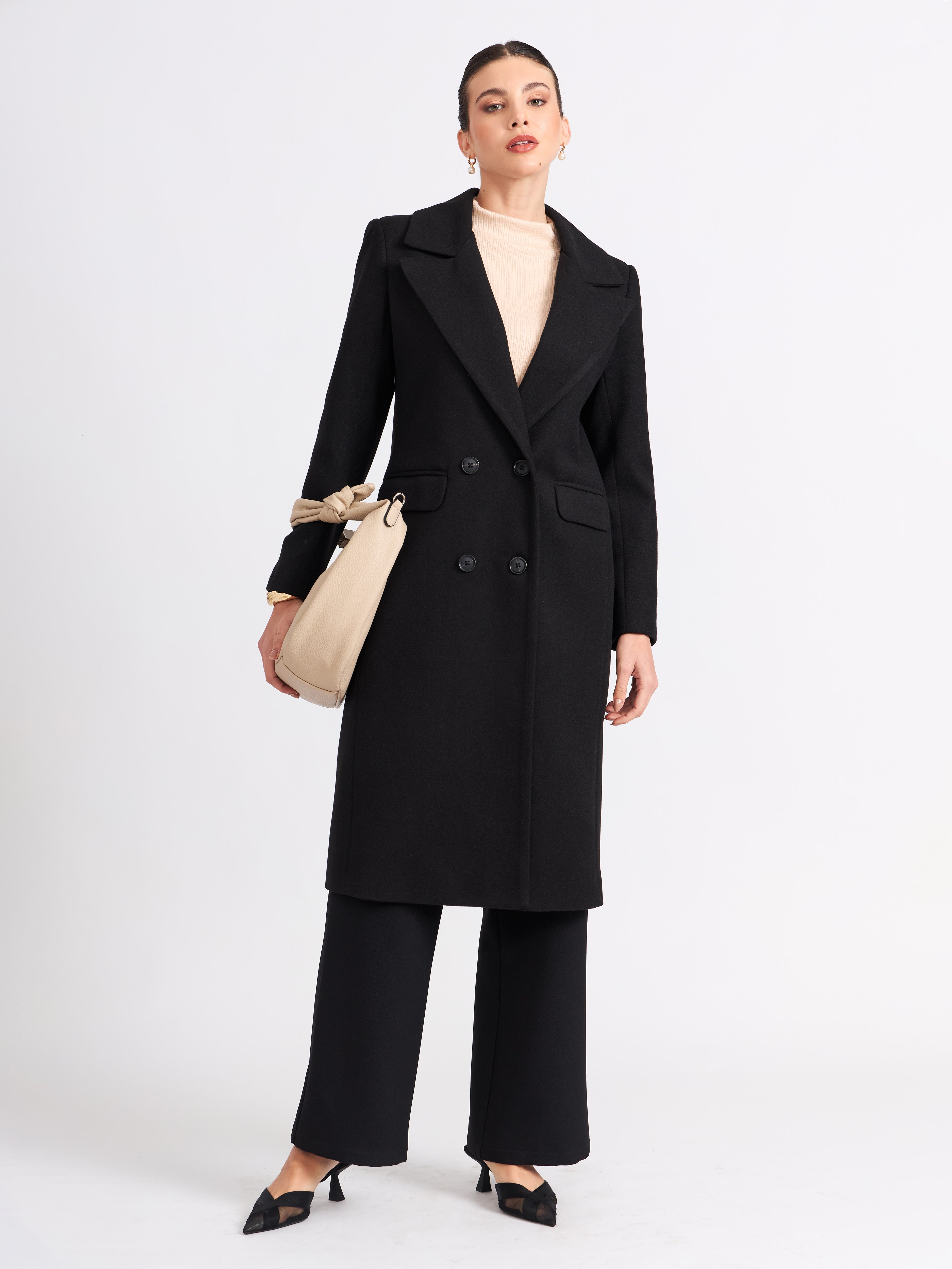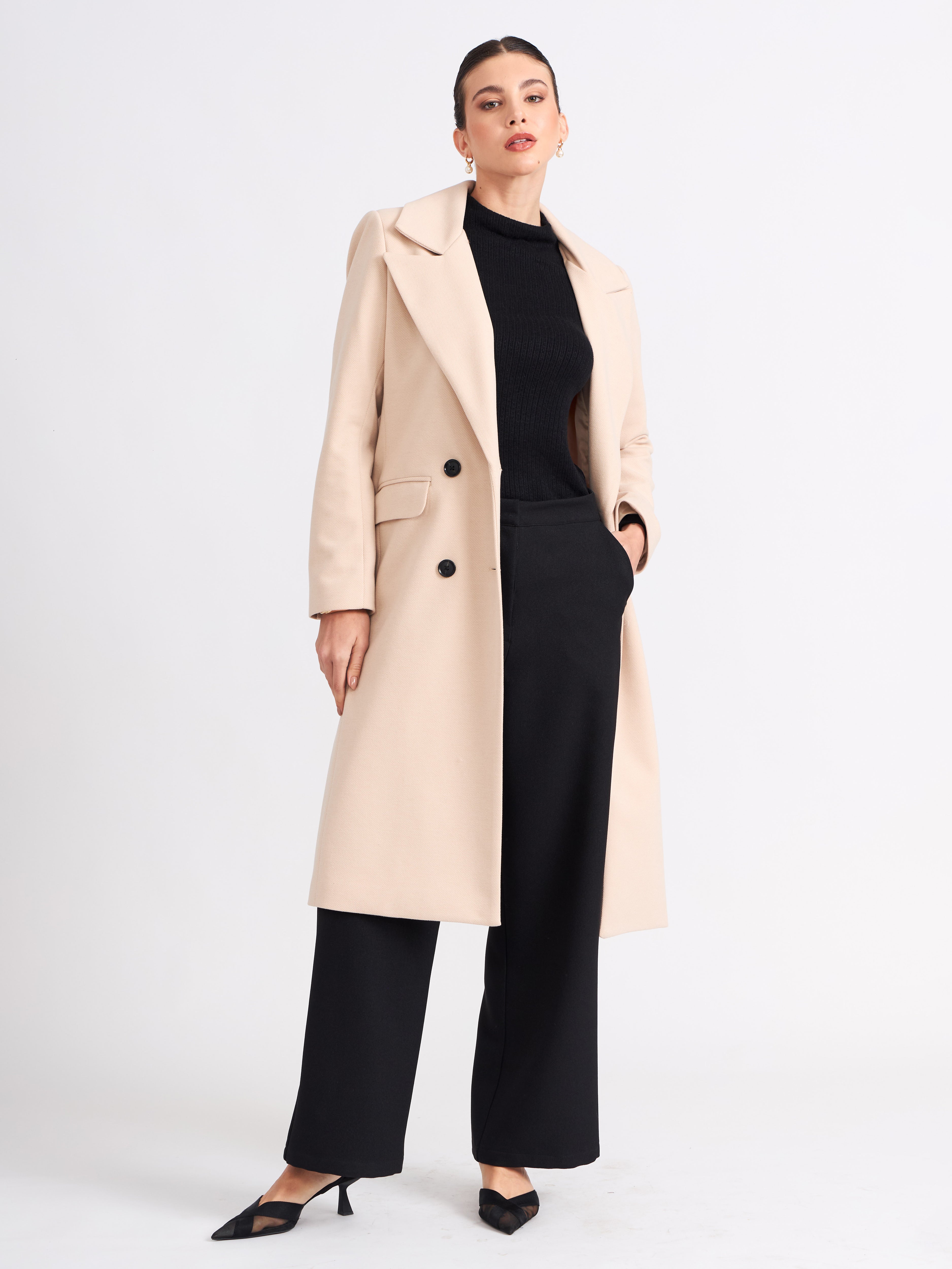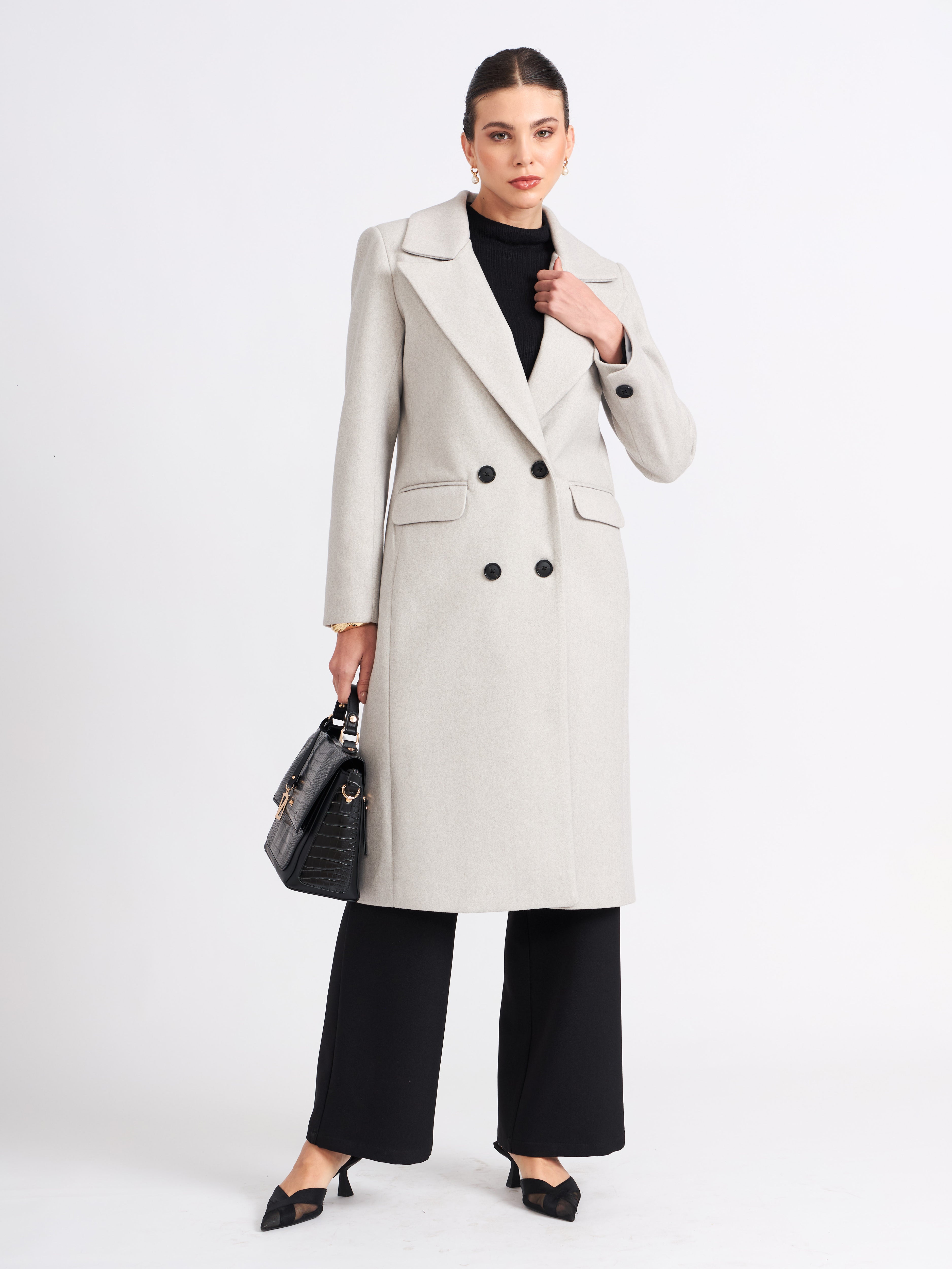 Abrigo largo cruzado fit regular. Con doble botonadura y bolsillos delanteros con solapa. Ideal para elevar todos tus looks.