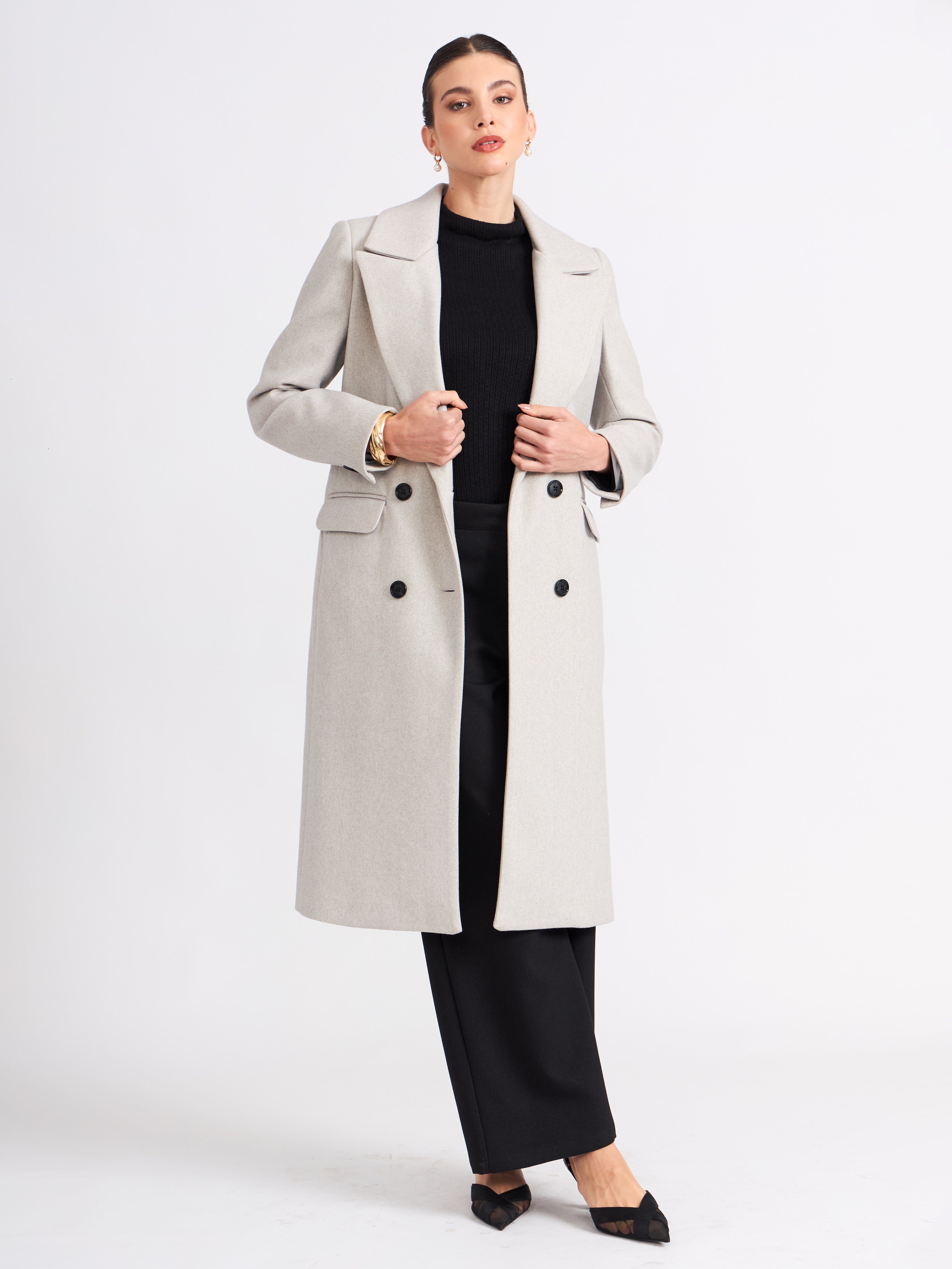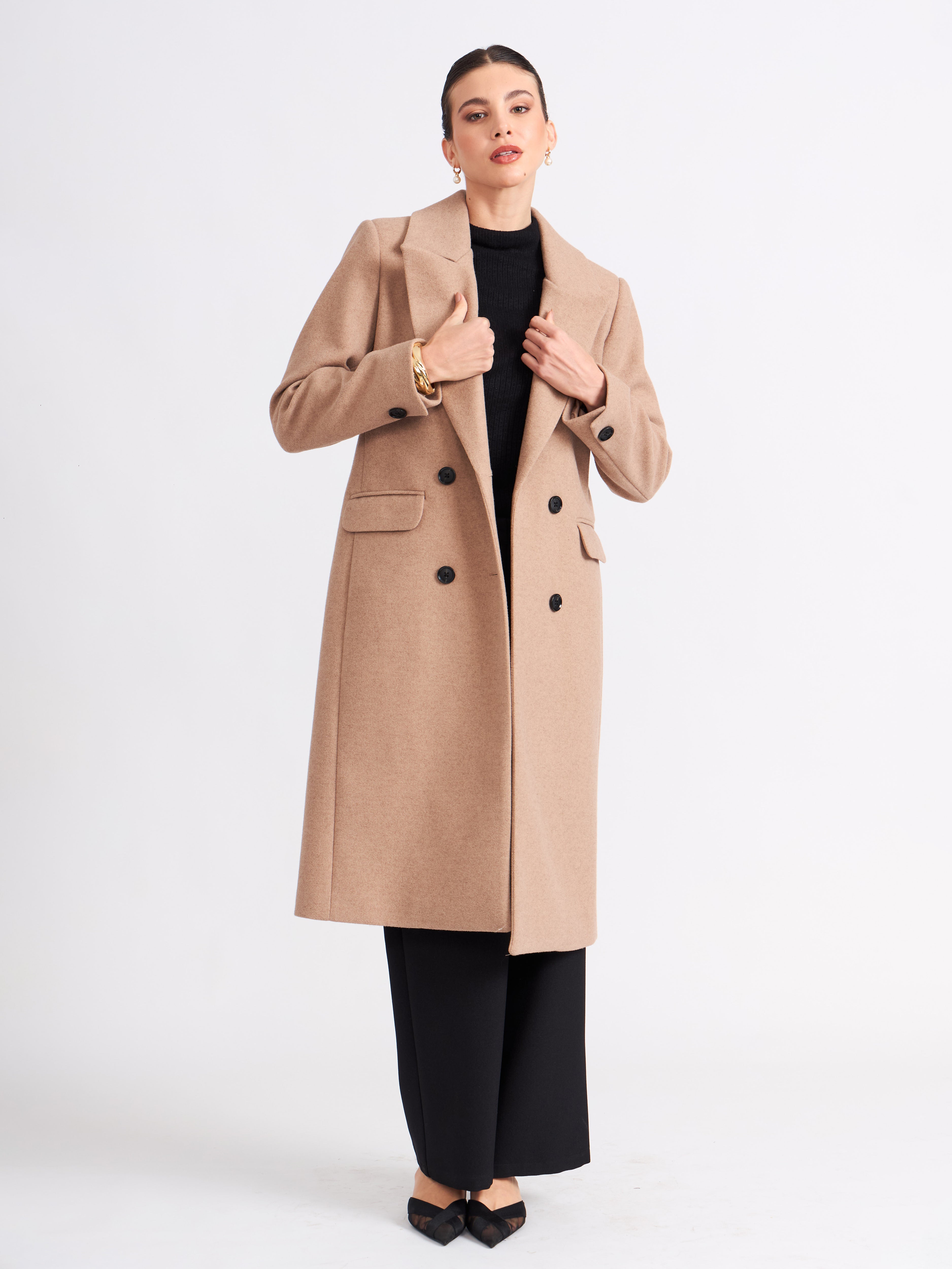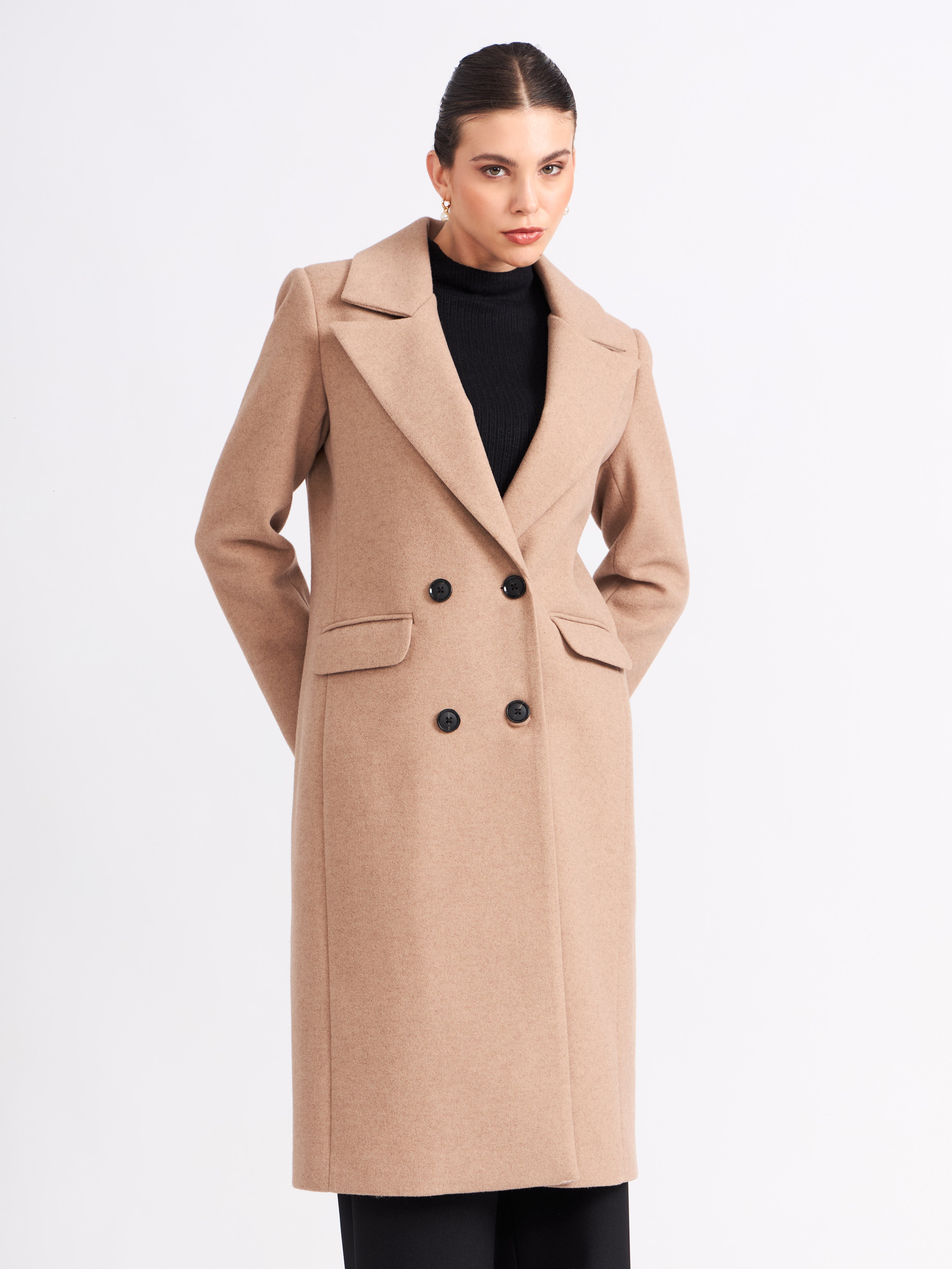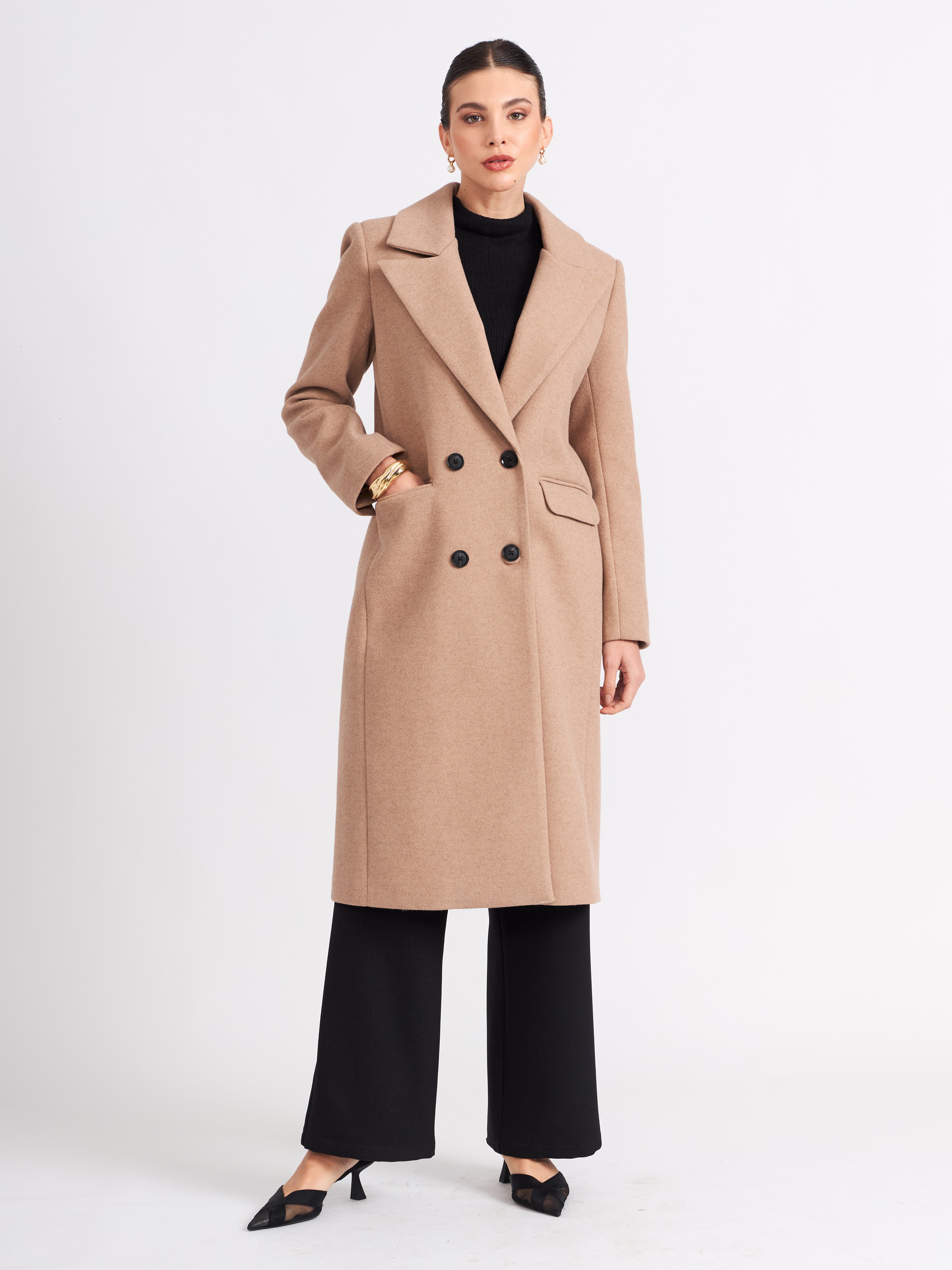 Abrigo largo cruzado fit regular. Con doble botonadura y bolsillos delanteros con solapa. Ideal para elevar todos tus looks.