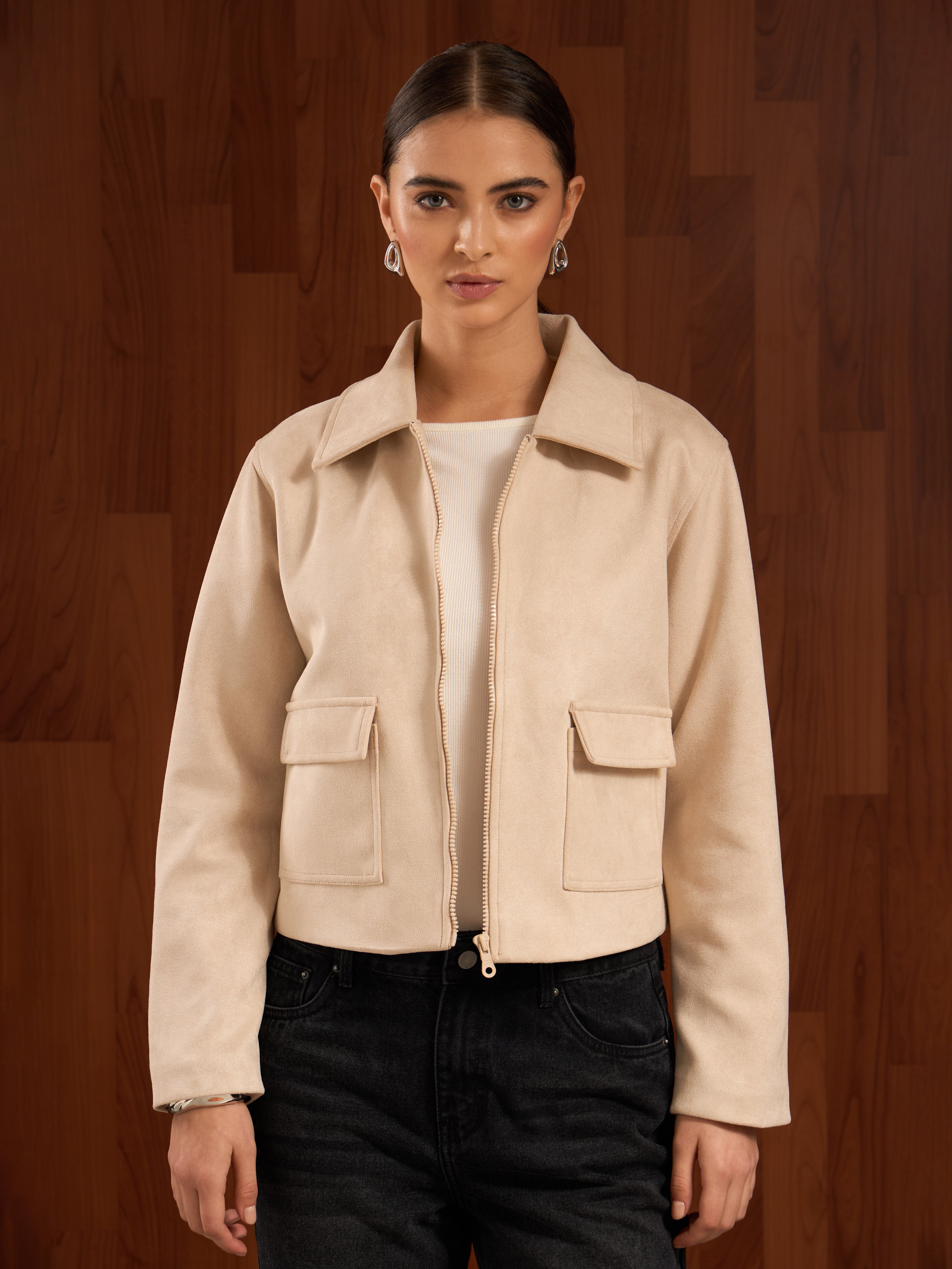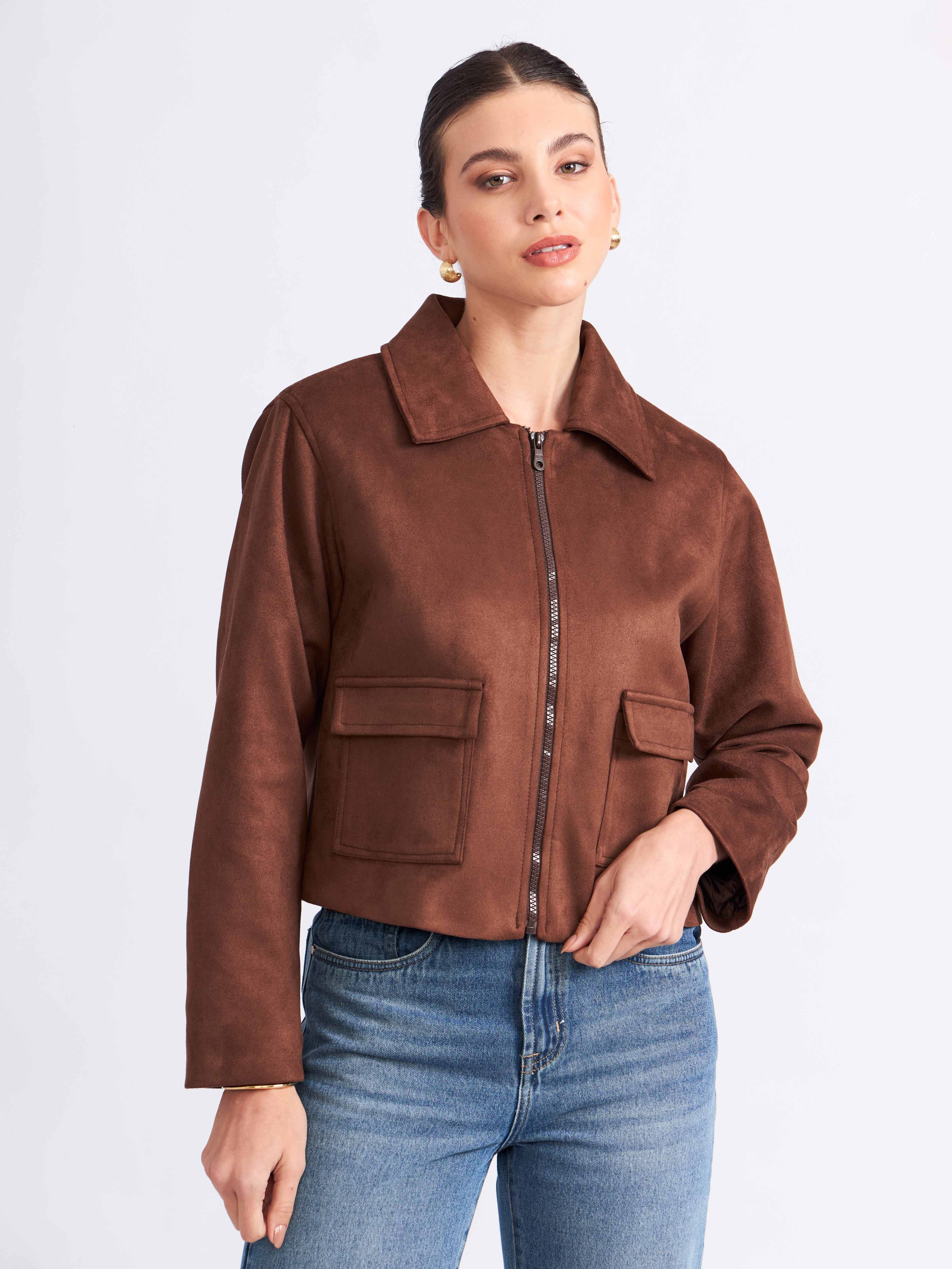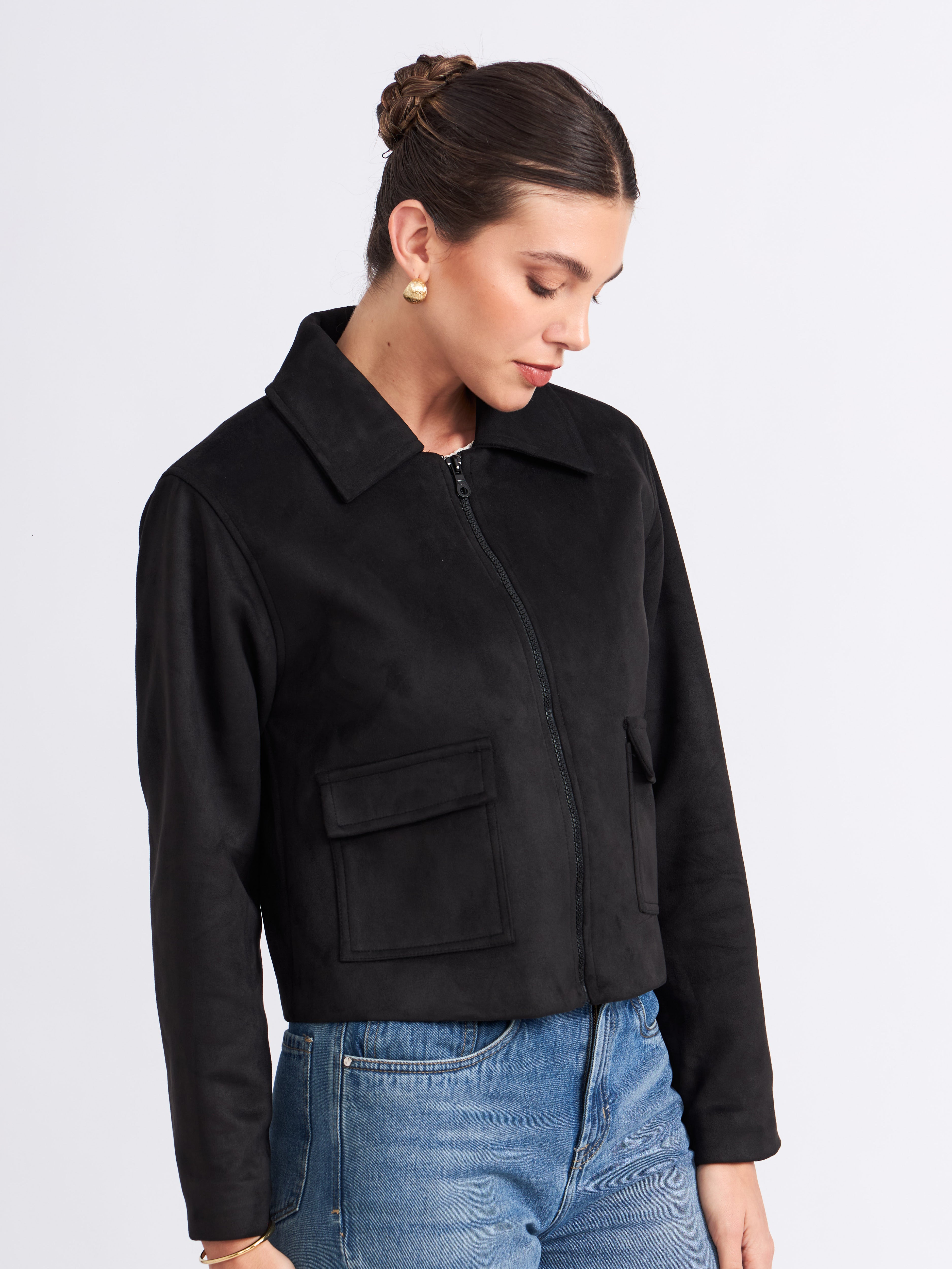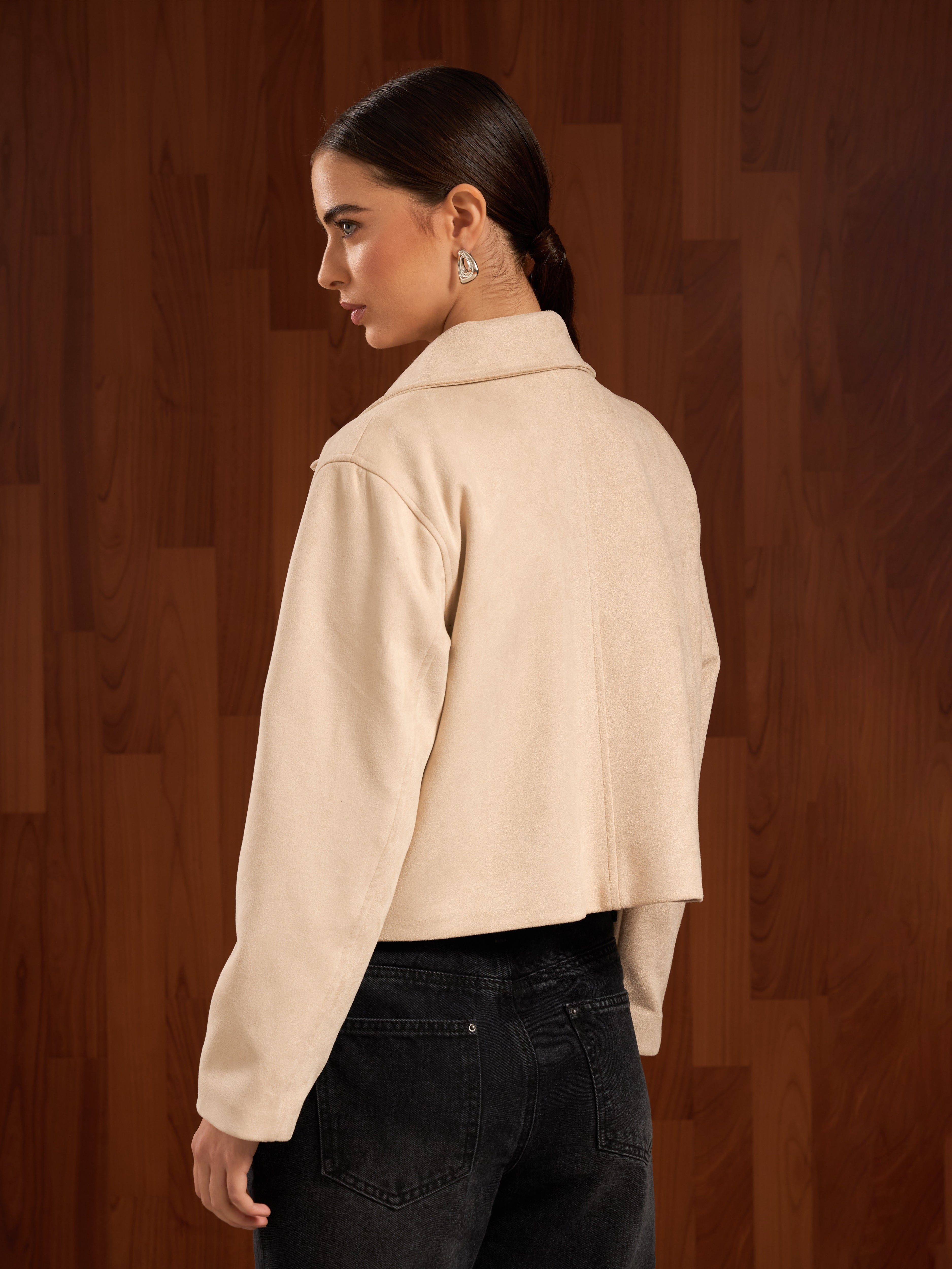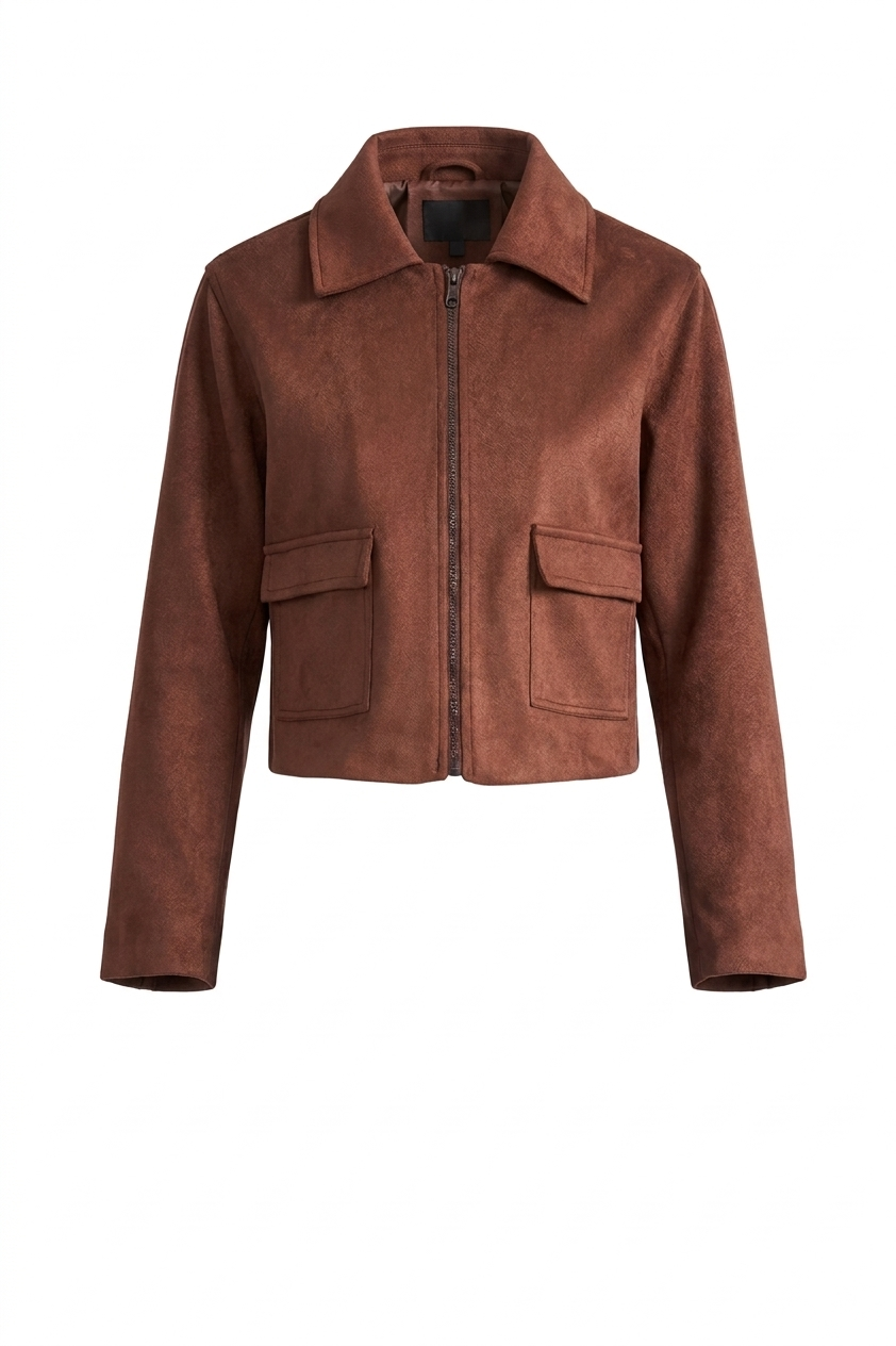 Chaqueta boxy de piel con corte estructurado. Presenta un cuello camisero con un cierre frontal y bolsillos con solapa a los lados, agregando funcionalidad y un acabado sofisticado. La prenda es versátil y atemporal, ideal para complementar looks formales o casuales con un toque refinado.