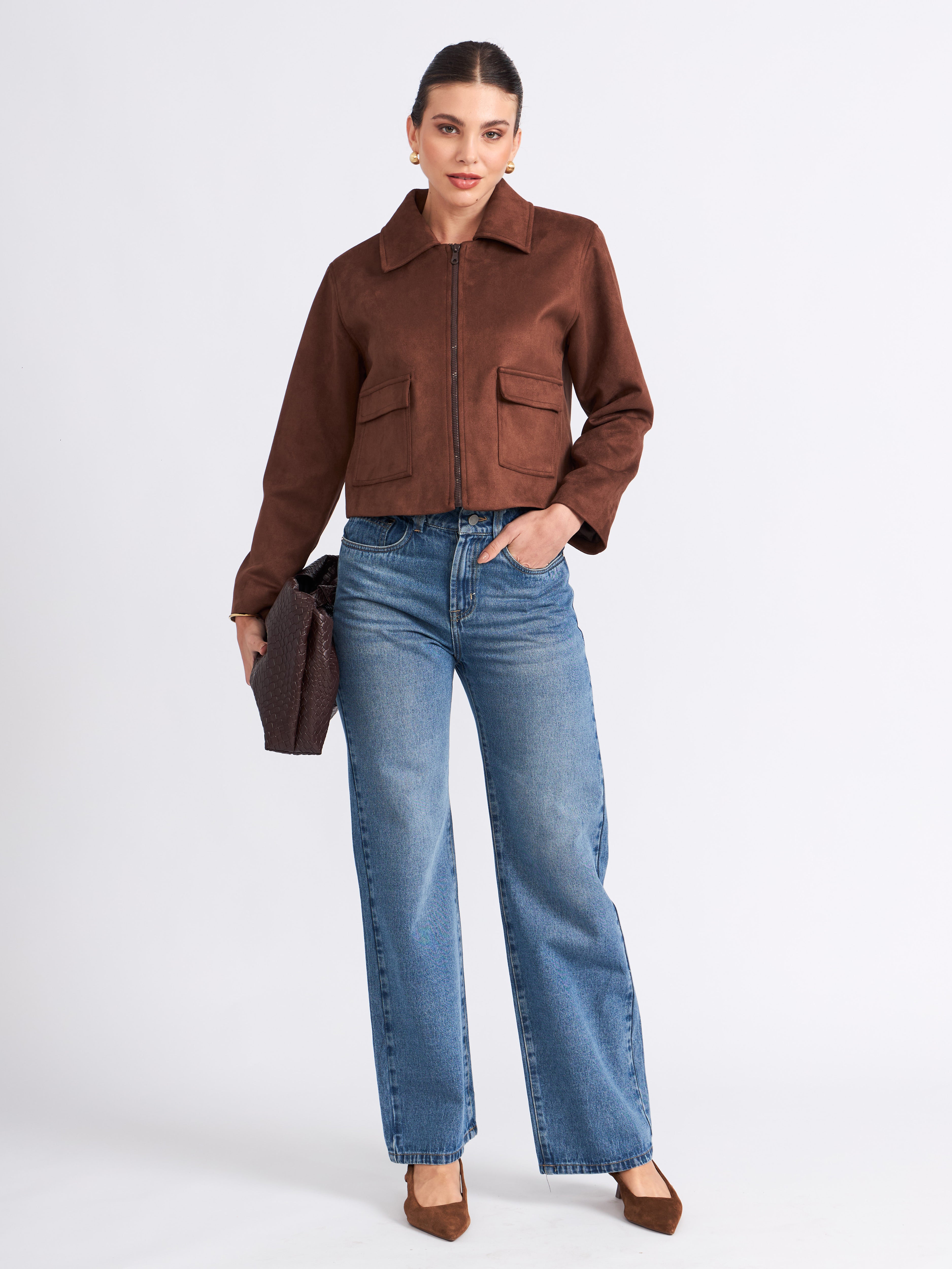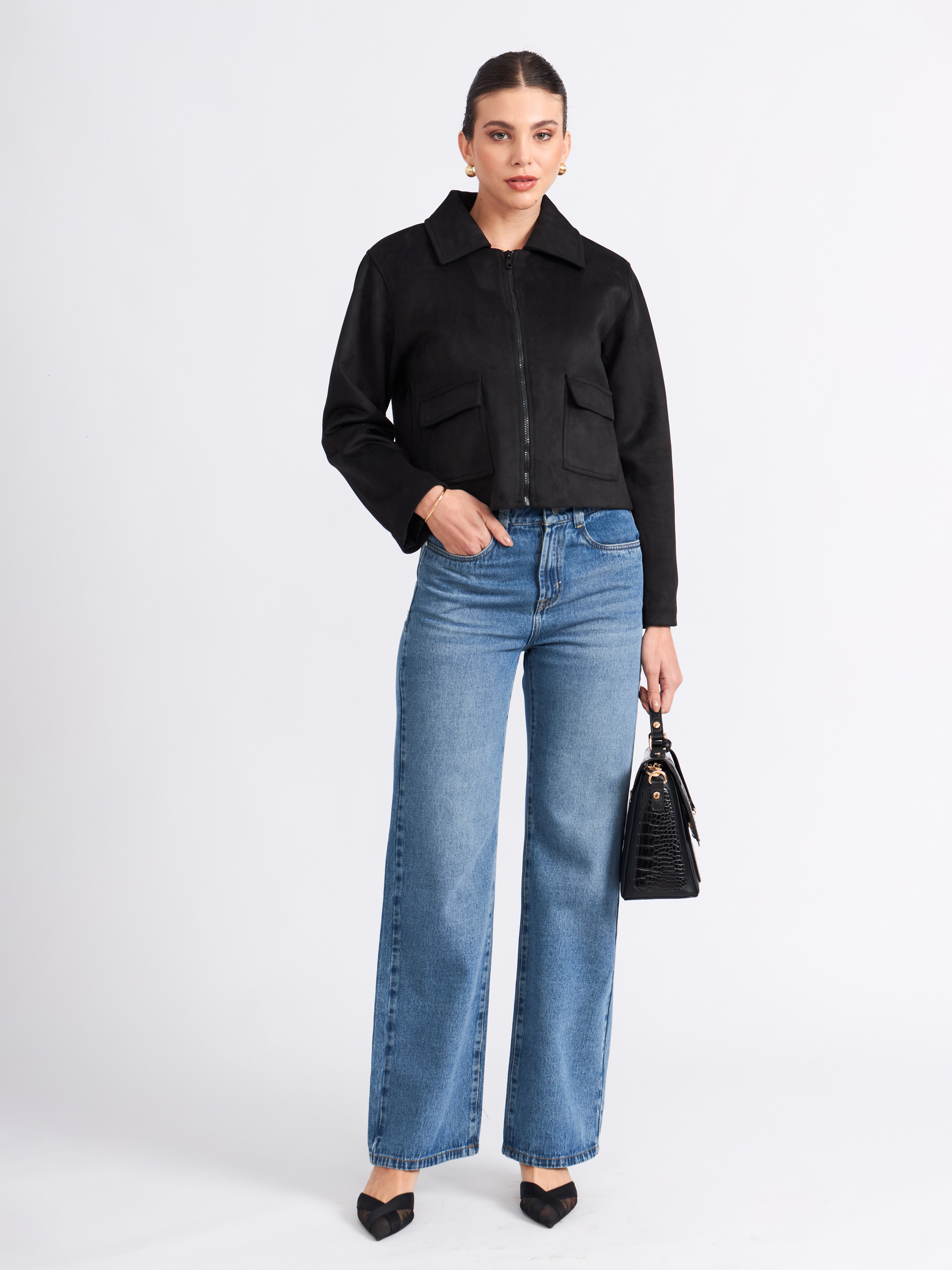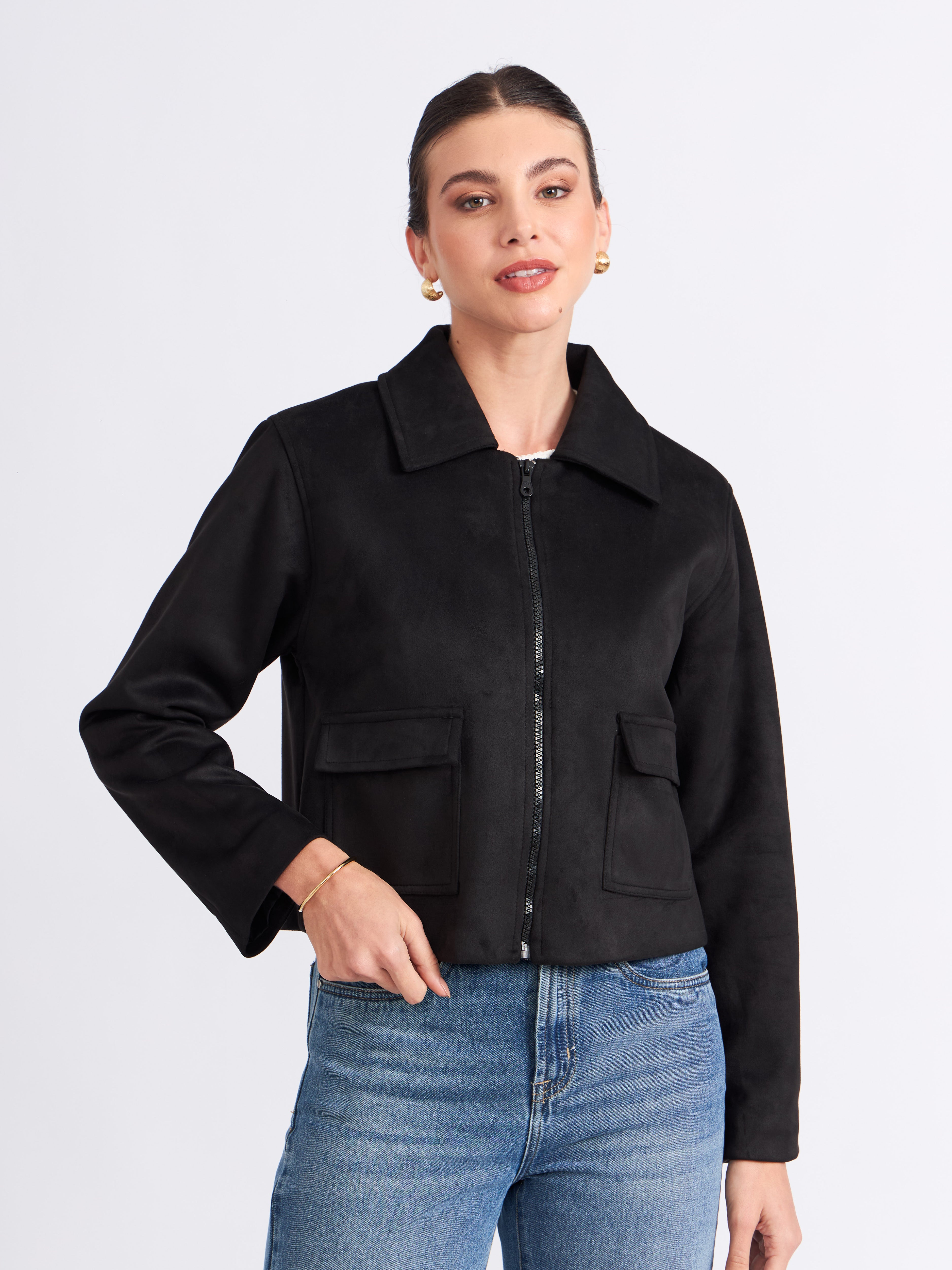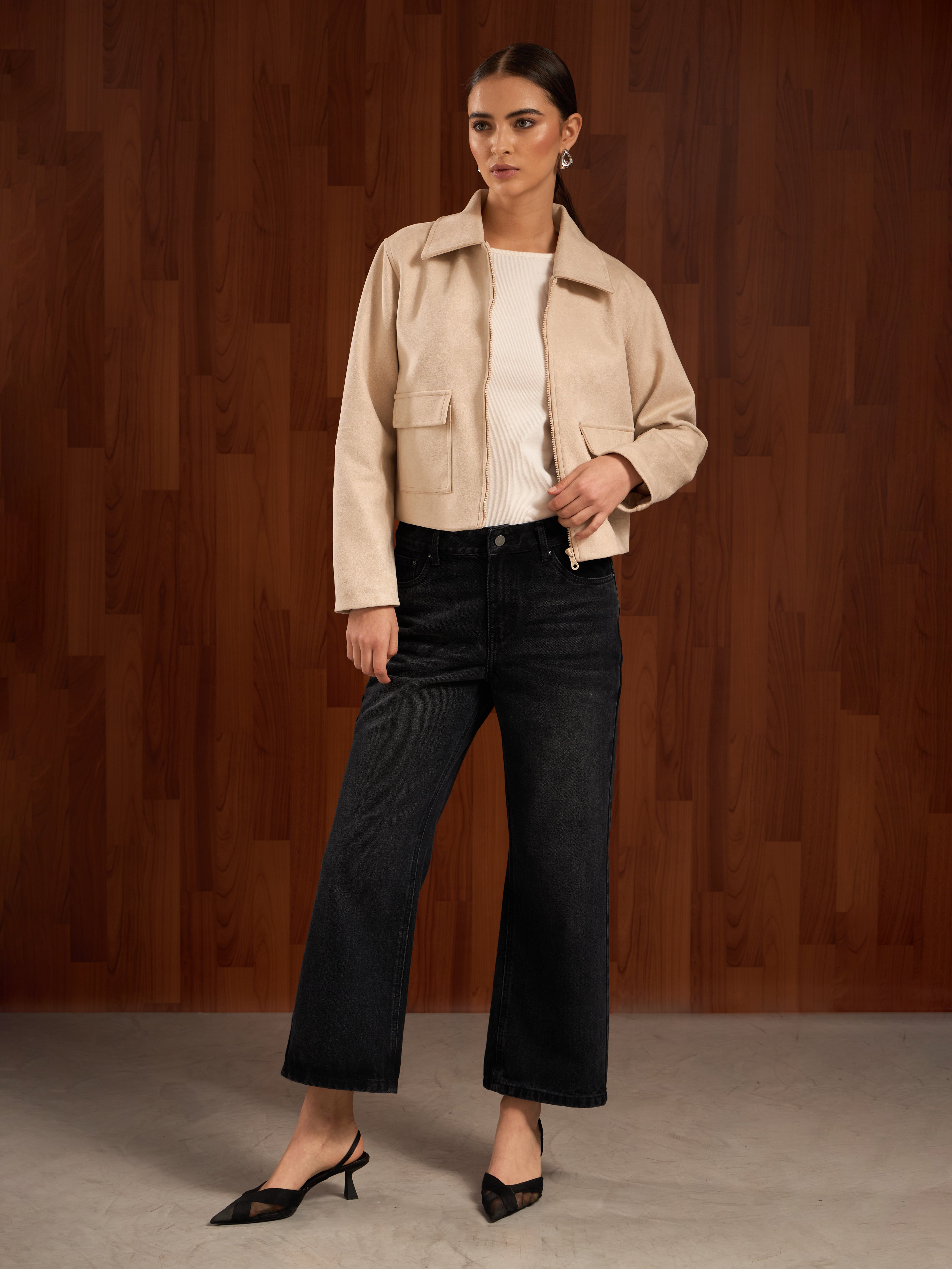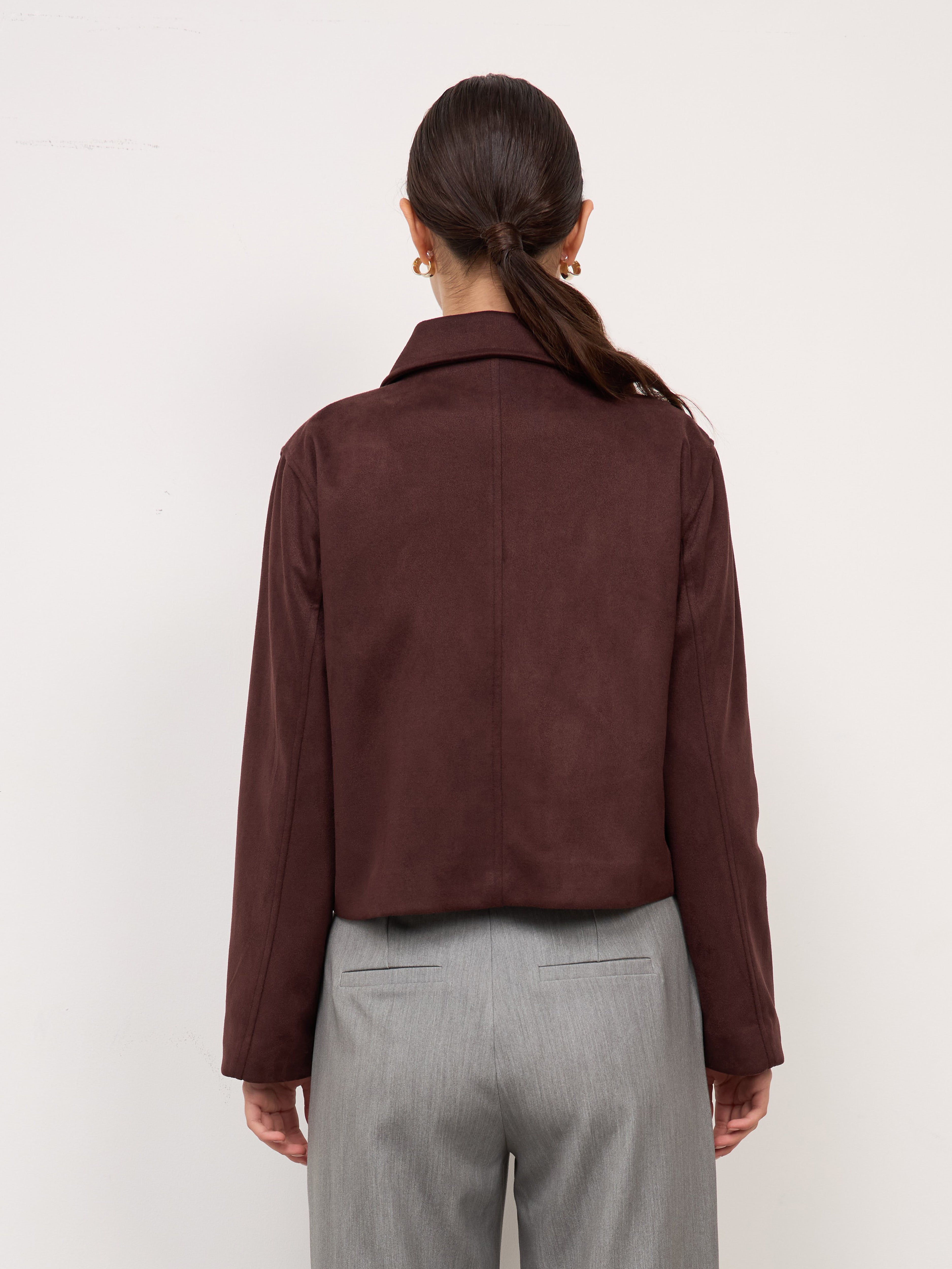 Chaqueta boxy de piel con corte estructurado. Presenta un cuello camisero con un cierre frontal y bolsillos con solapa a los lados, agregando funcionalidad y un acabado sofisticado. La prenda es versátil y atemporal, ideal para complementar looks formales o casuales con un toque refinado.