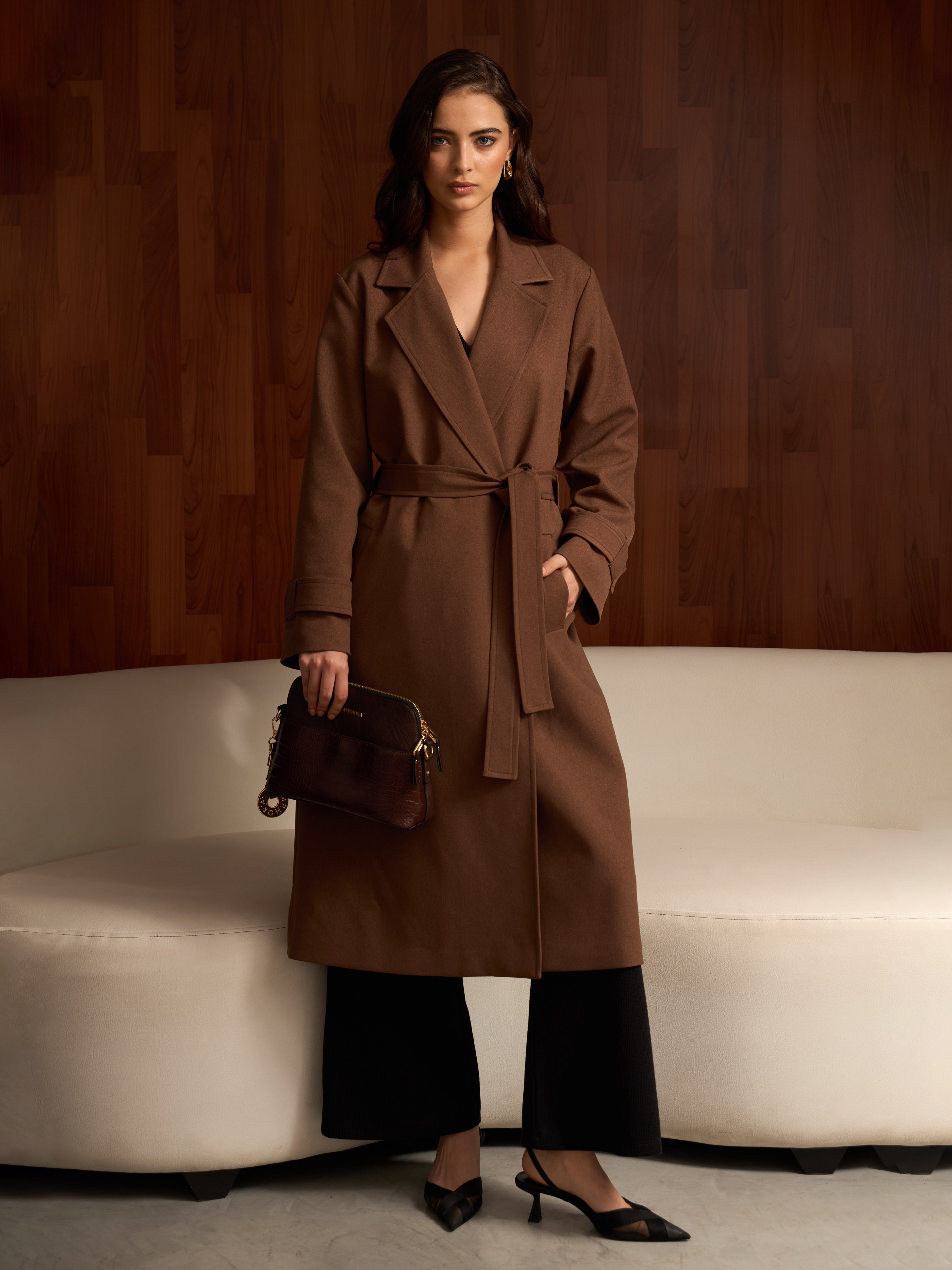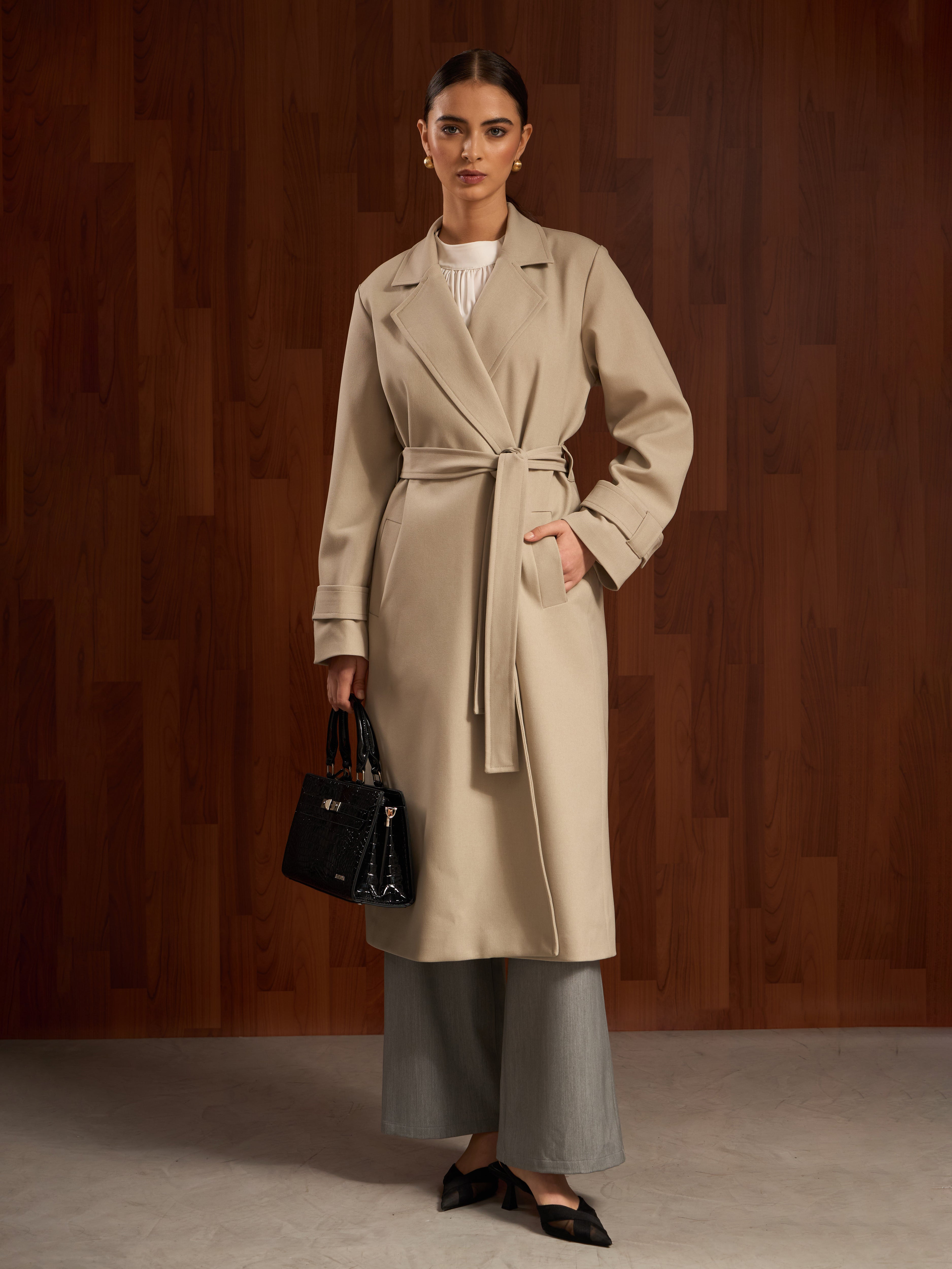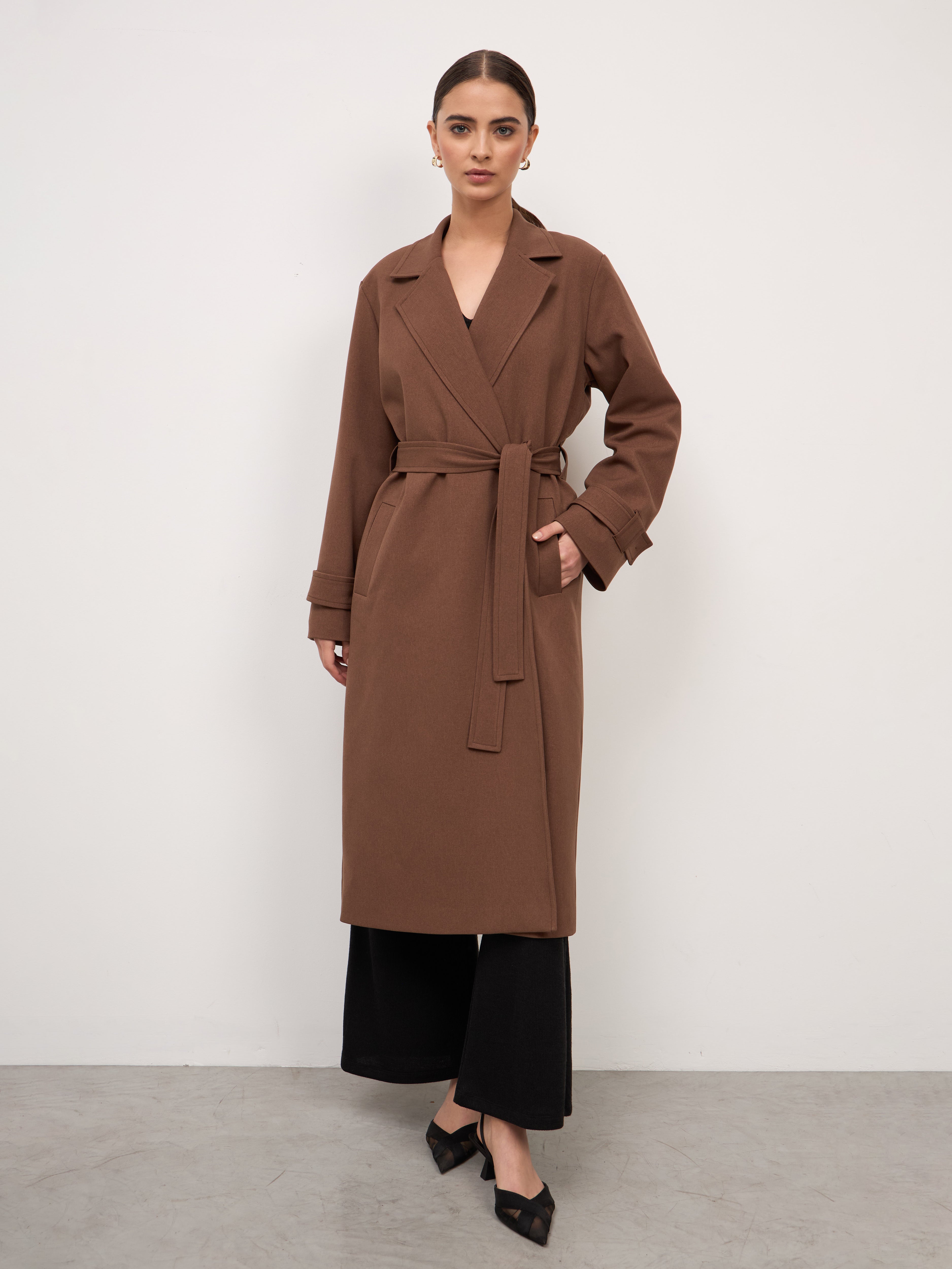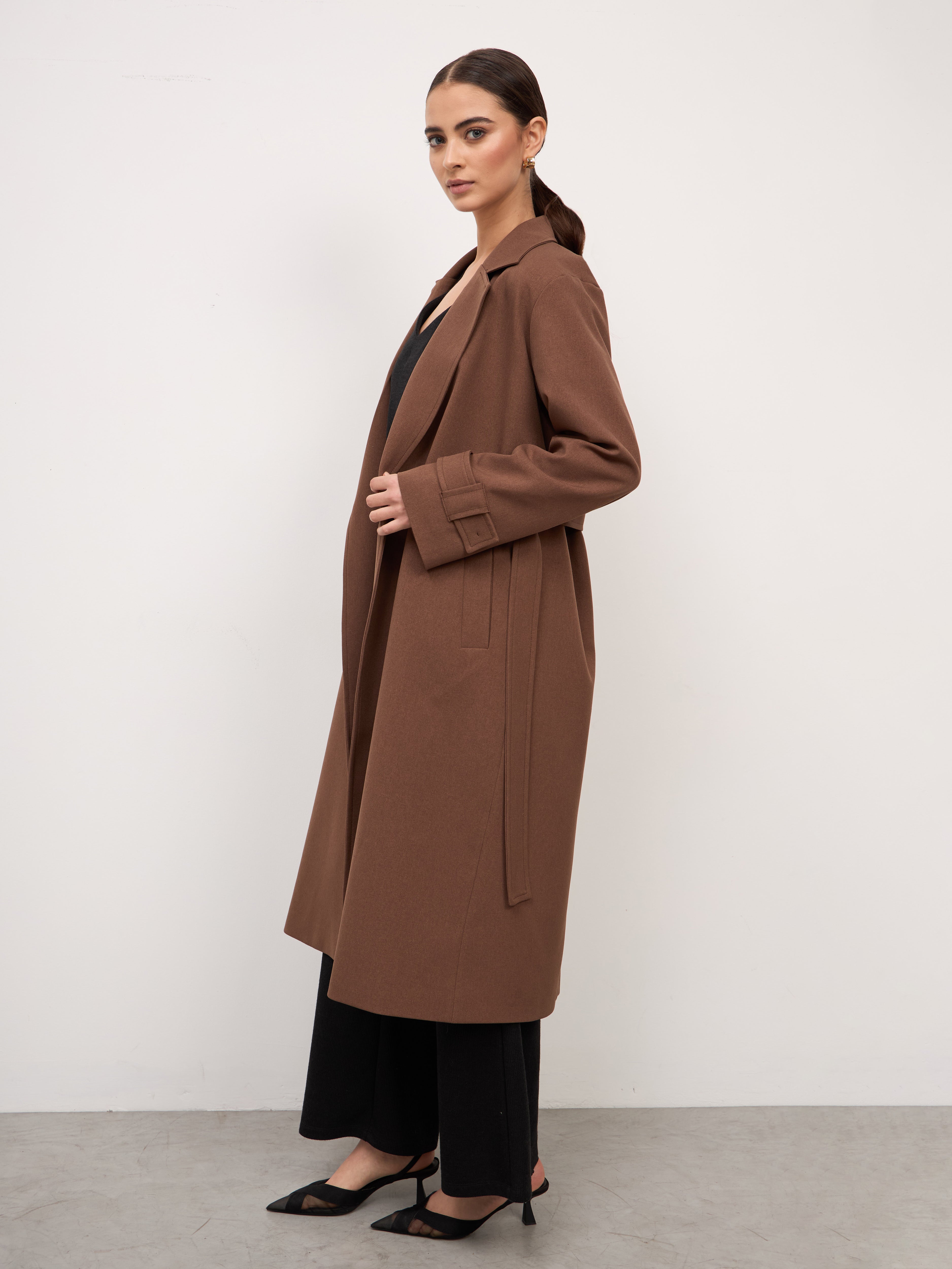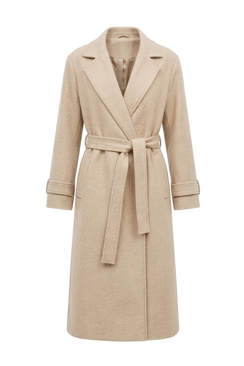 Abrigo largo minimalista con un corte recto, sin botones, acompañado de un cinturón removible, que le da un acabado versátil y funcional. Es una pieza versátil que la convierte en una opción ideal para complementar distintos estilos.