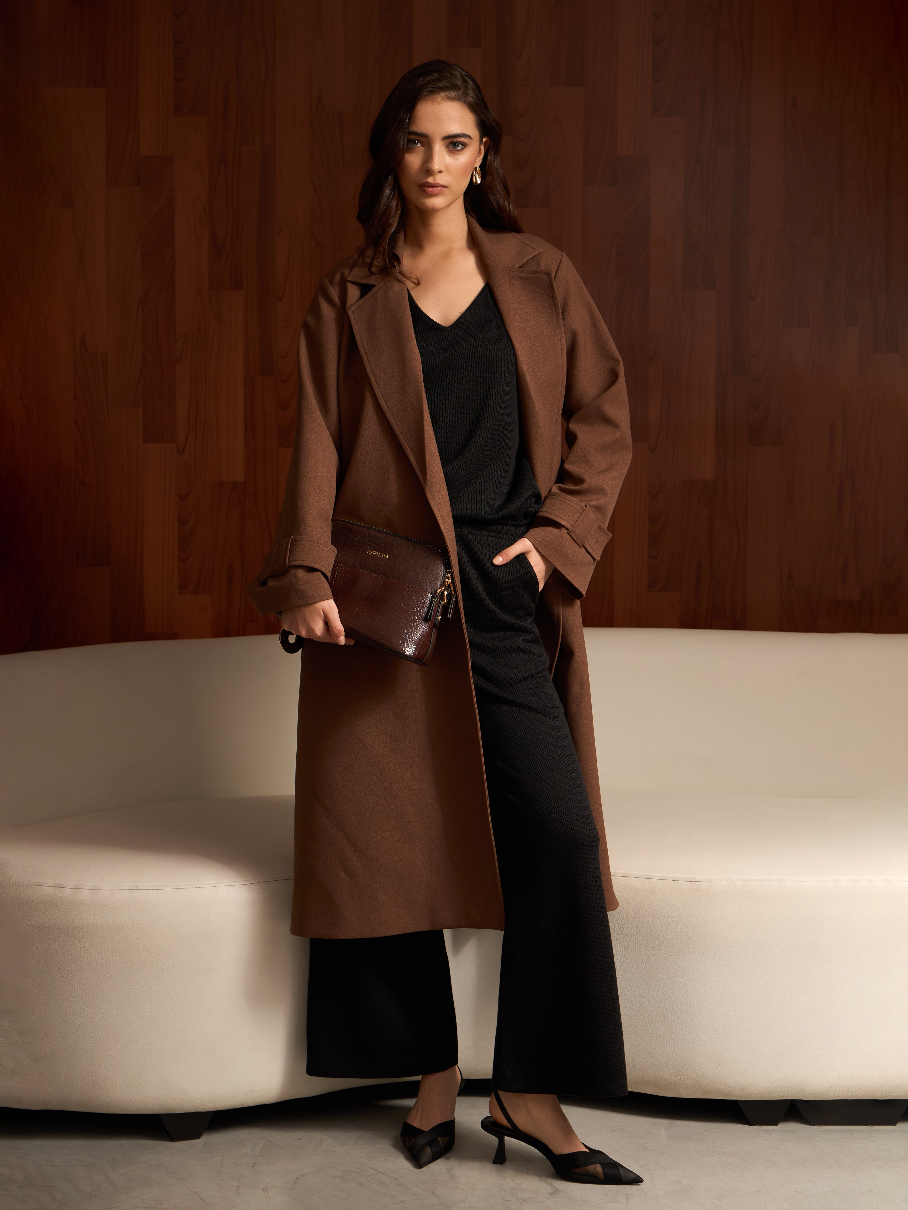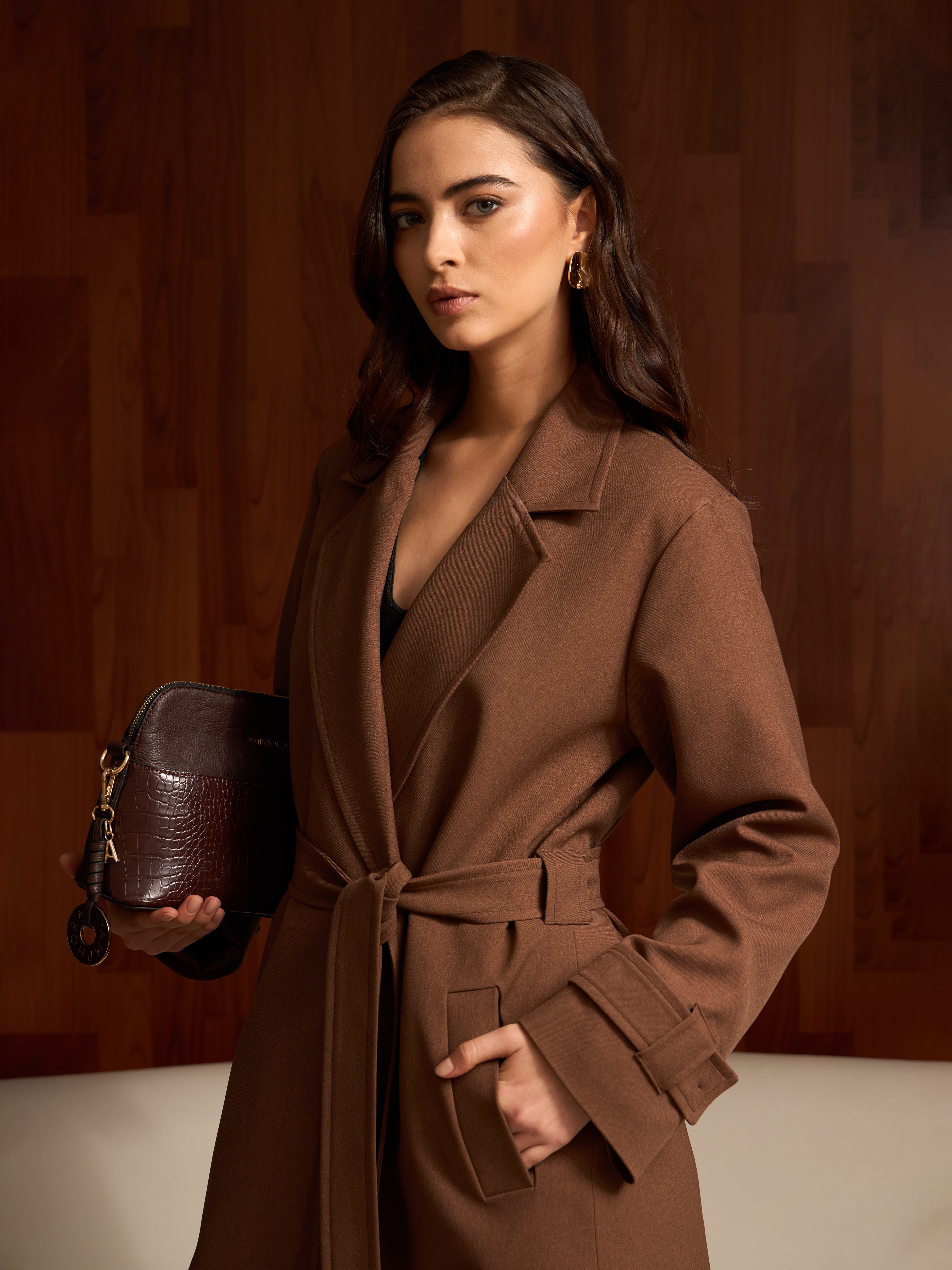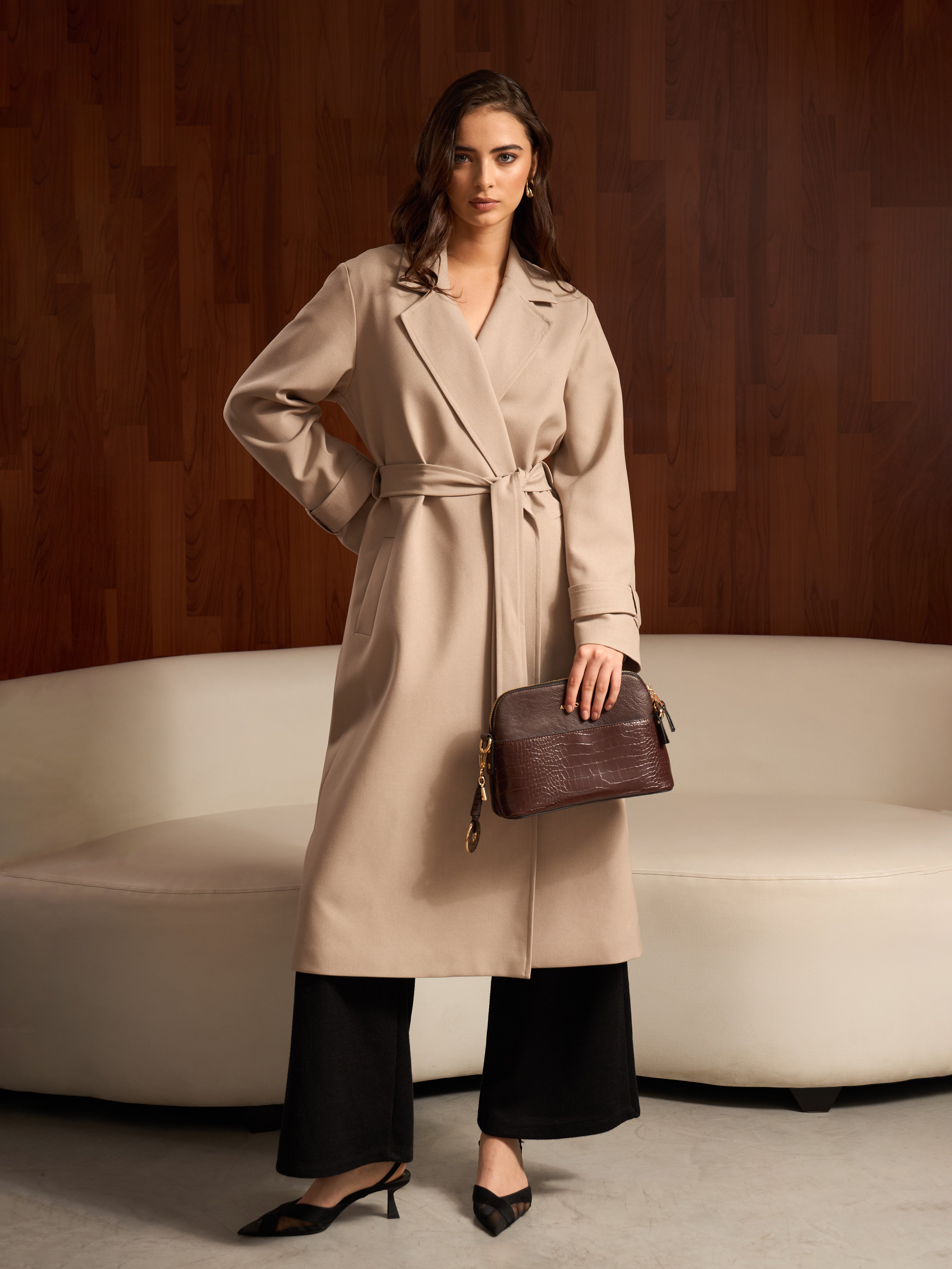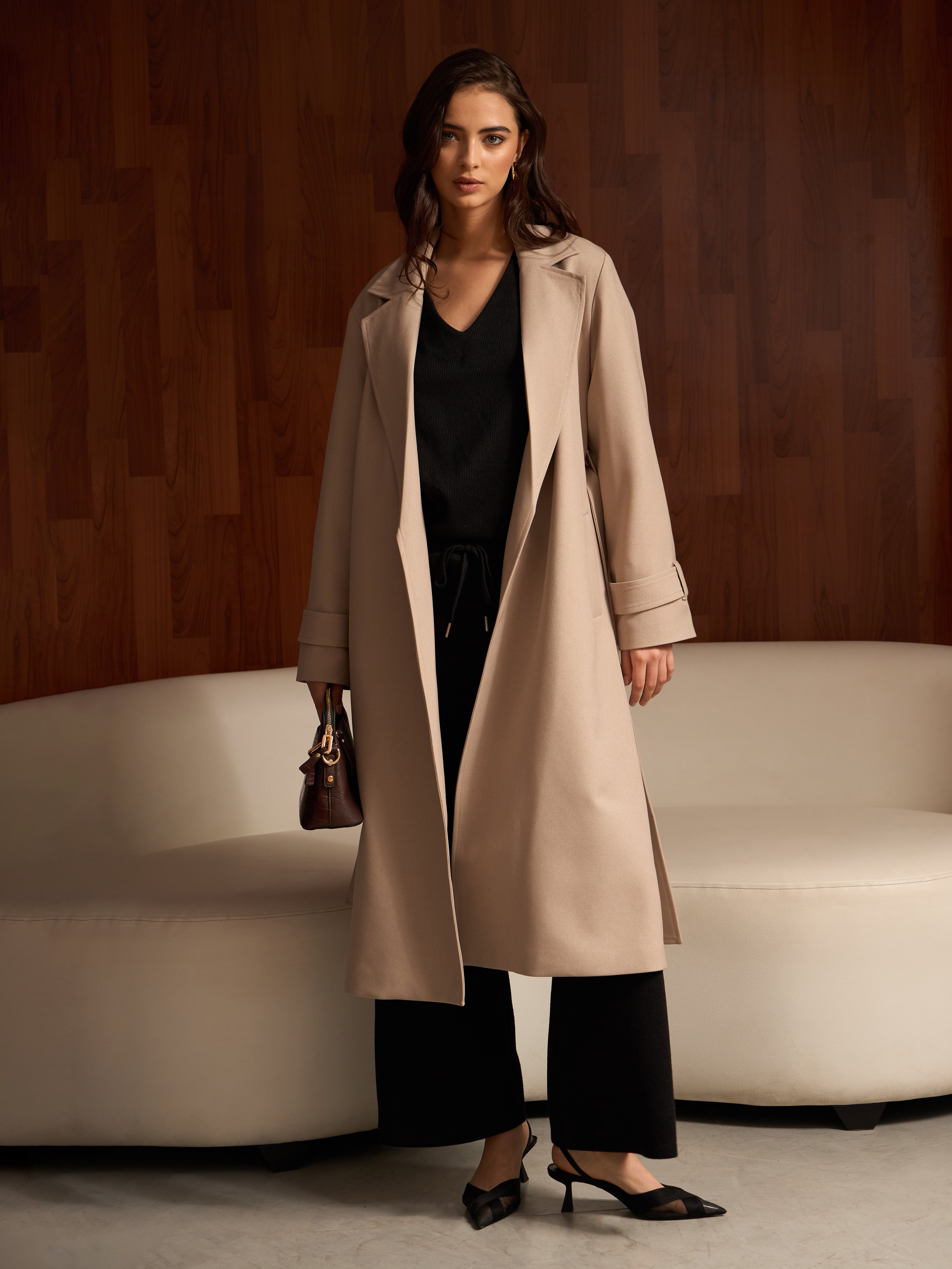 Abrigo largo minimalista con un corte recto, sin botones, acompañado de un cinturón removible, que le da un acabado versátil y funcional. Es una pieza versátil que la convierte en una opción ideal para complementar distintos estilos.