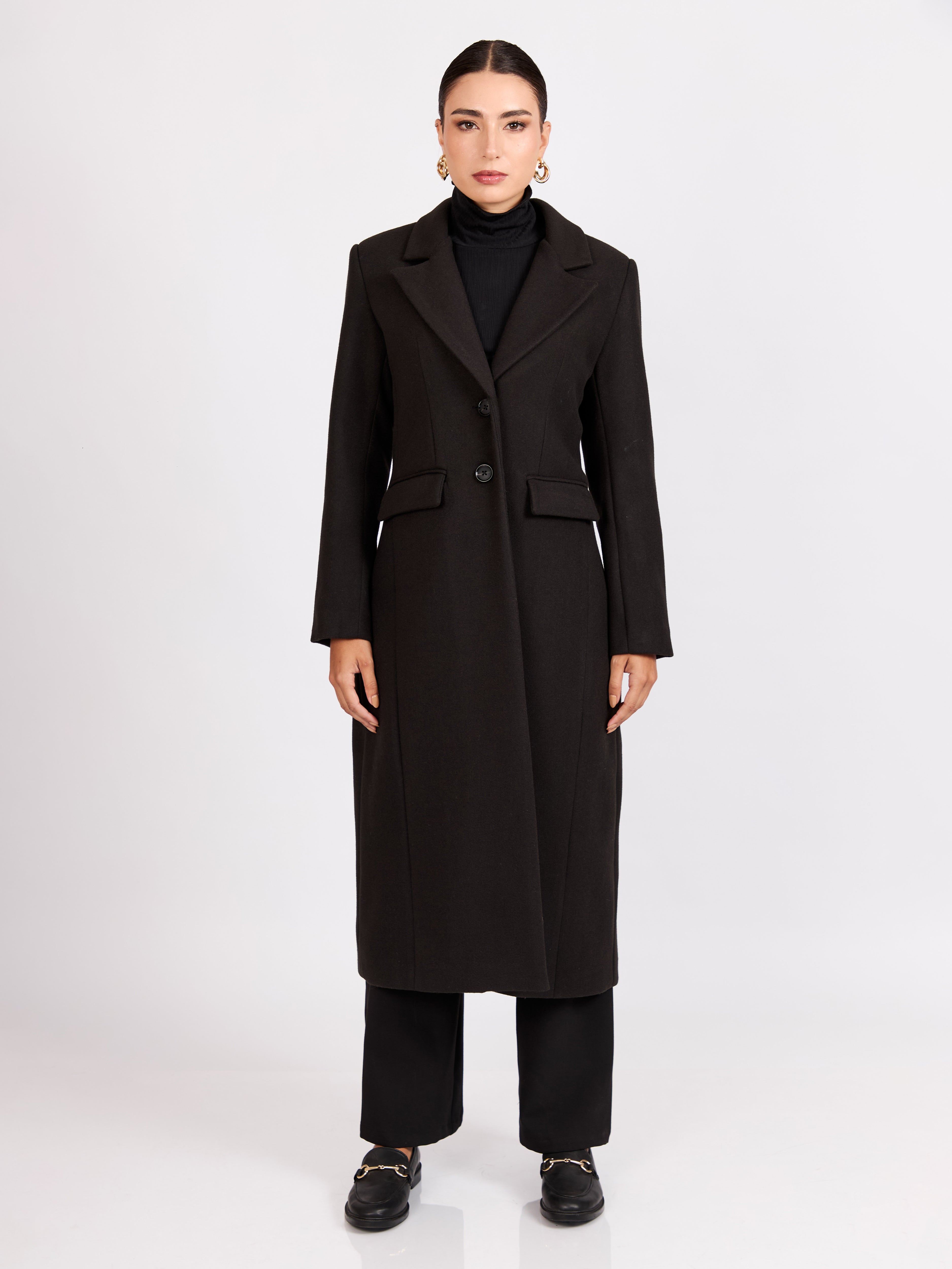 Abrigo largo de silueta estructurada, con un diseño de corte recto y detalles de sastrería. Presenta solapas clásicas y un cierre frontal con botones. Cintura ligeramente ajustada, que realza la figura.