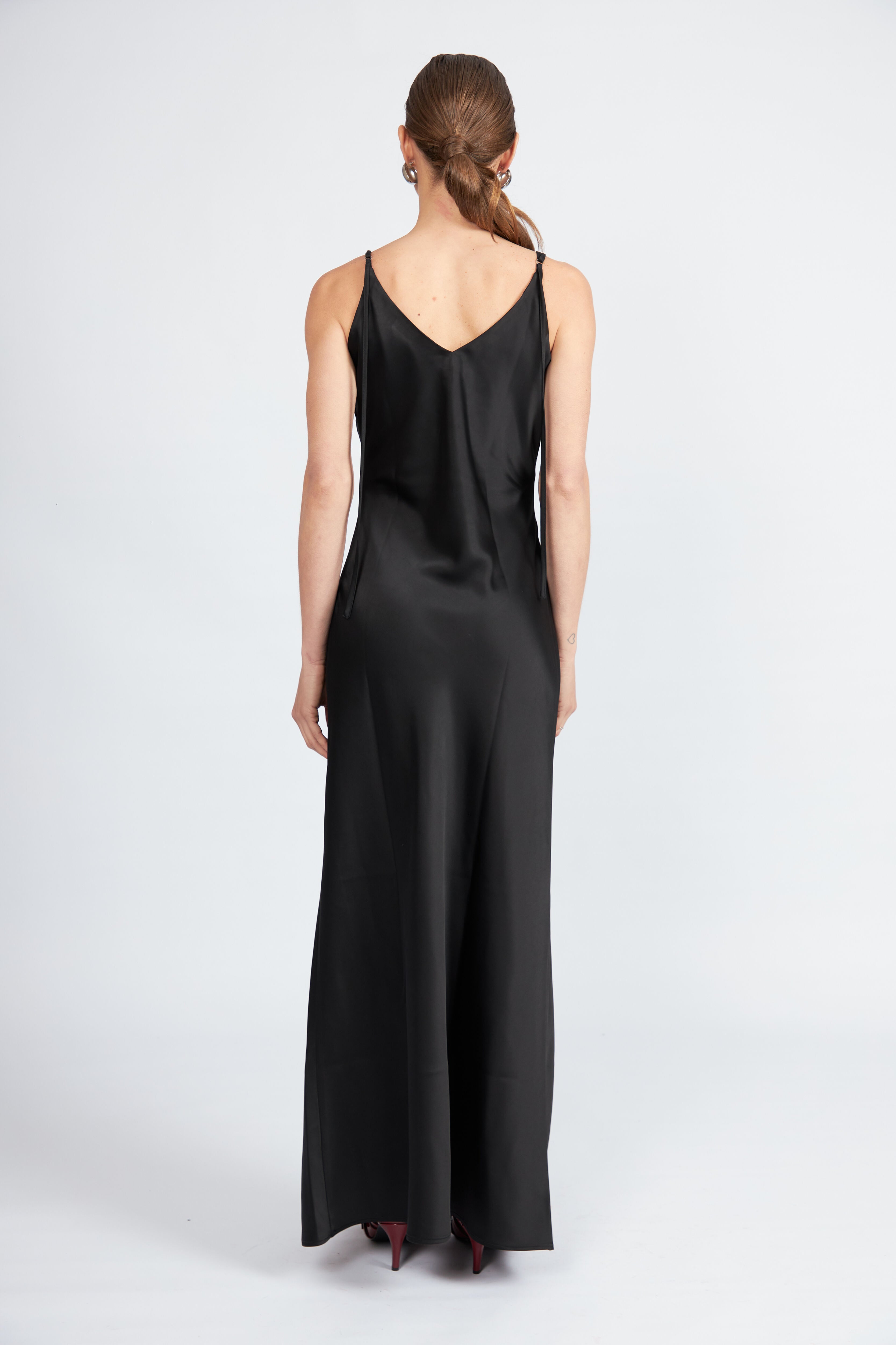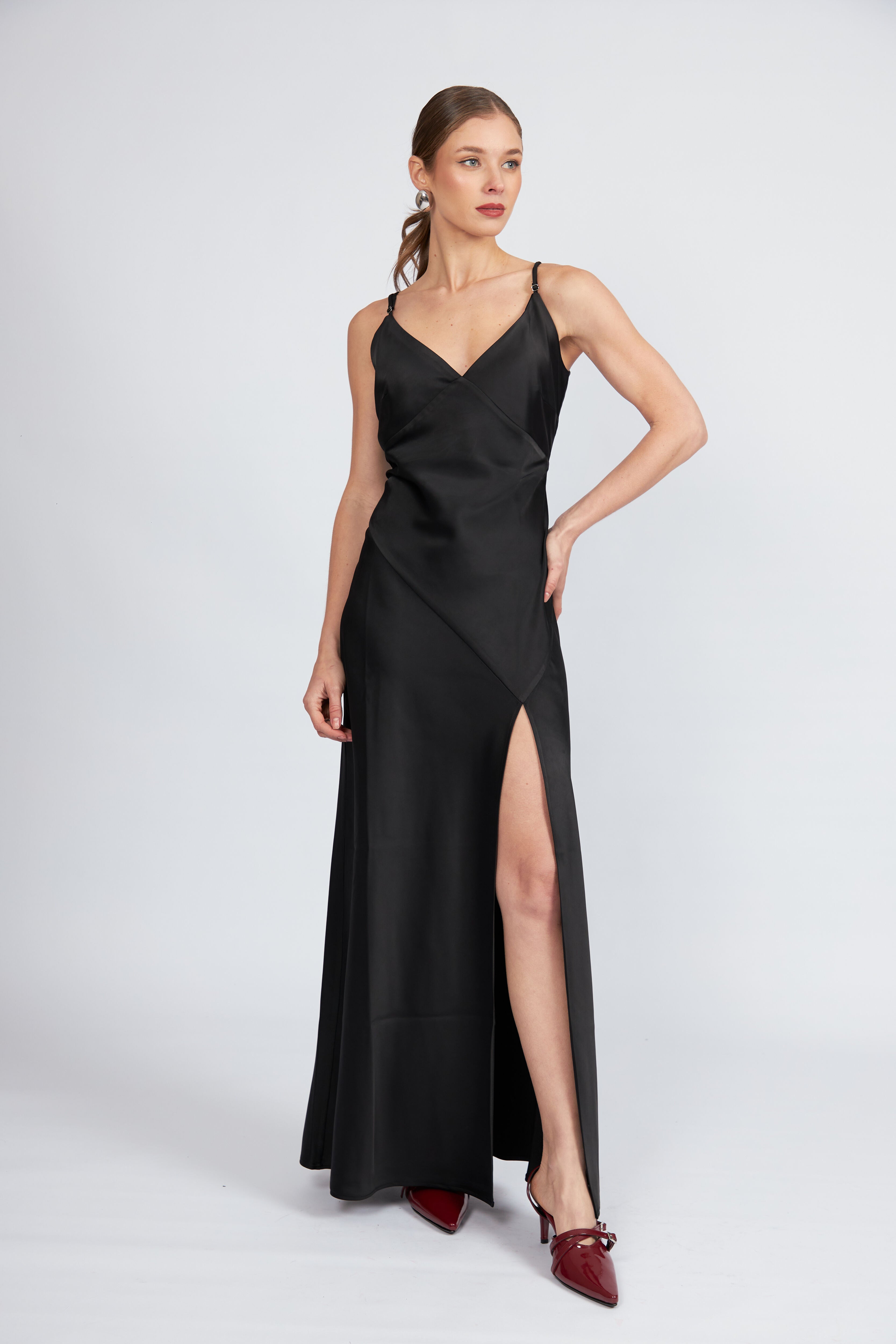 Vestido largo con abertura en la pierna. Corte en el busto y pinzas y tirantes con regulador.