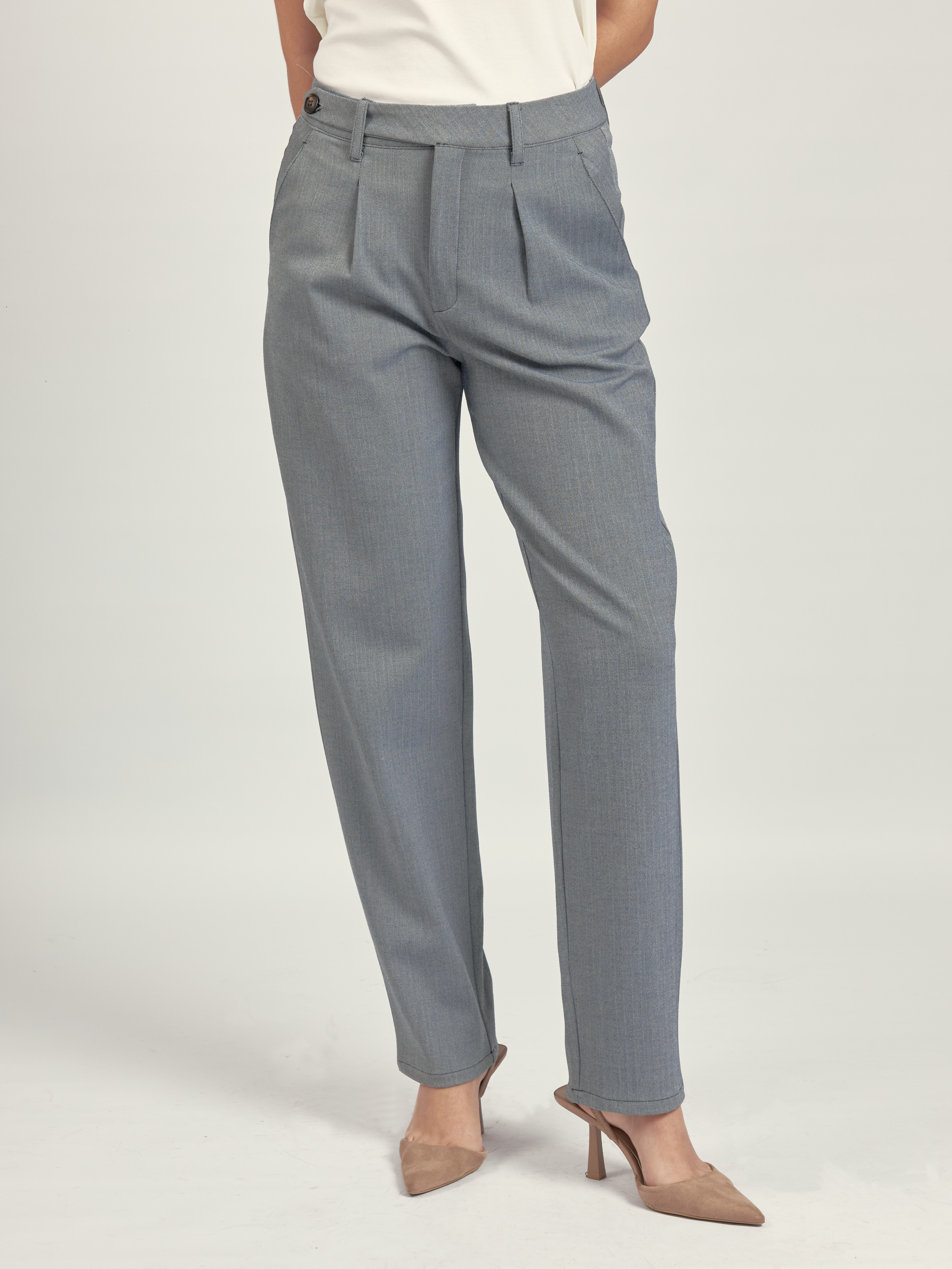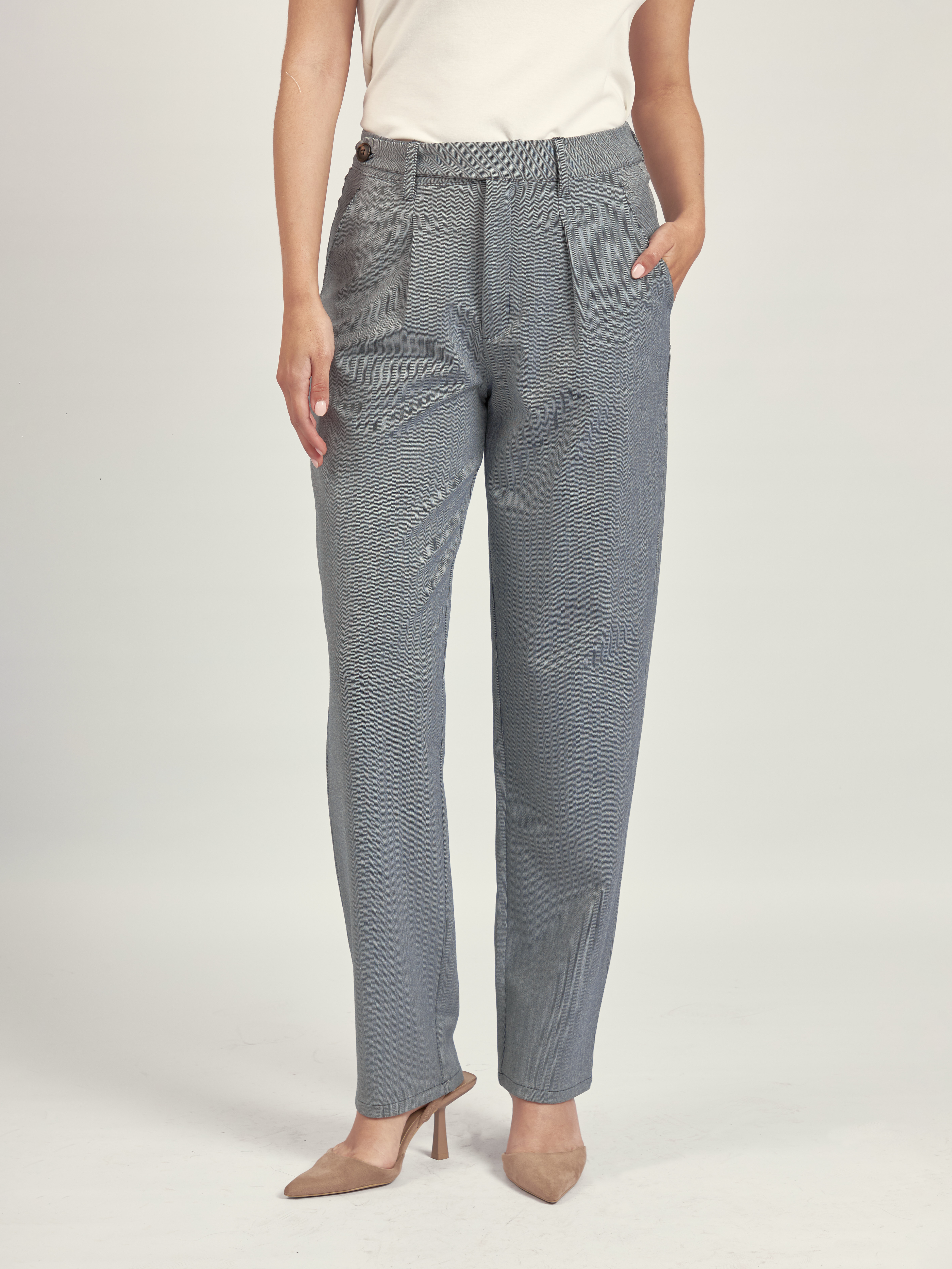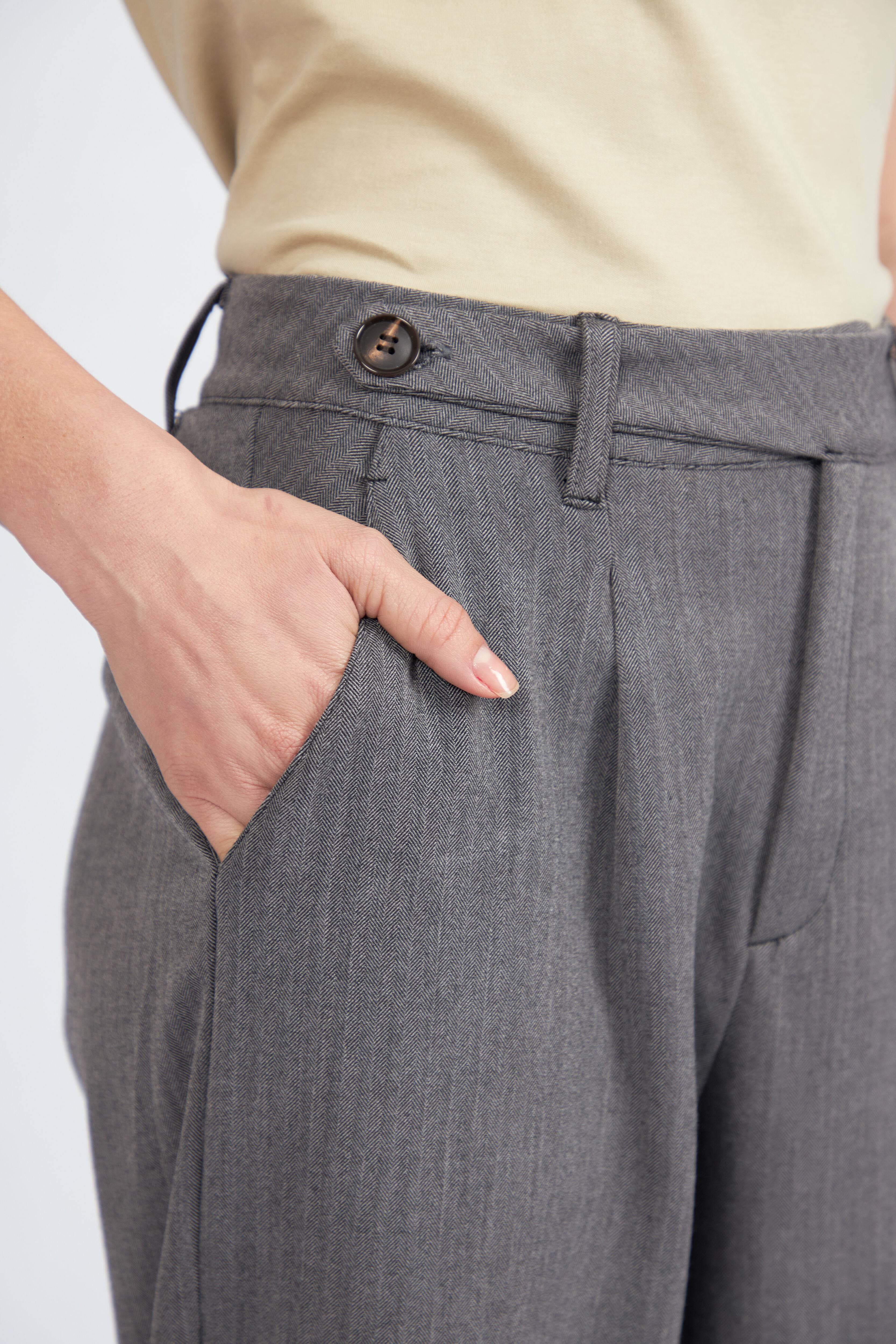 Pantalón tipo slouchy con pinzas y pretina cruzada. Bolsillos delanteros, presillas en la cintura y un botón delantero.