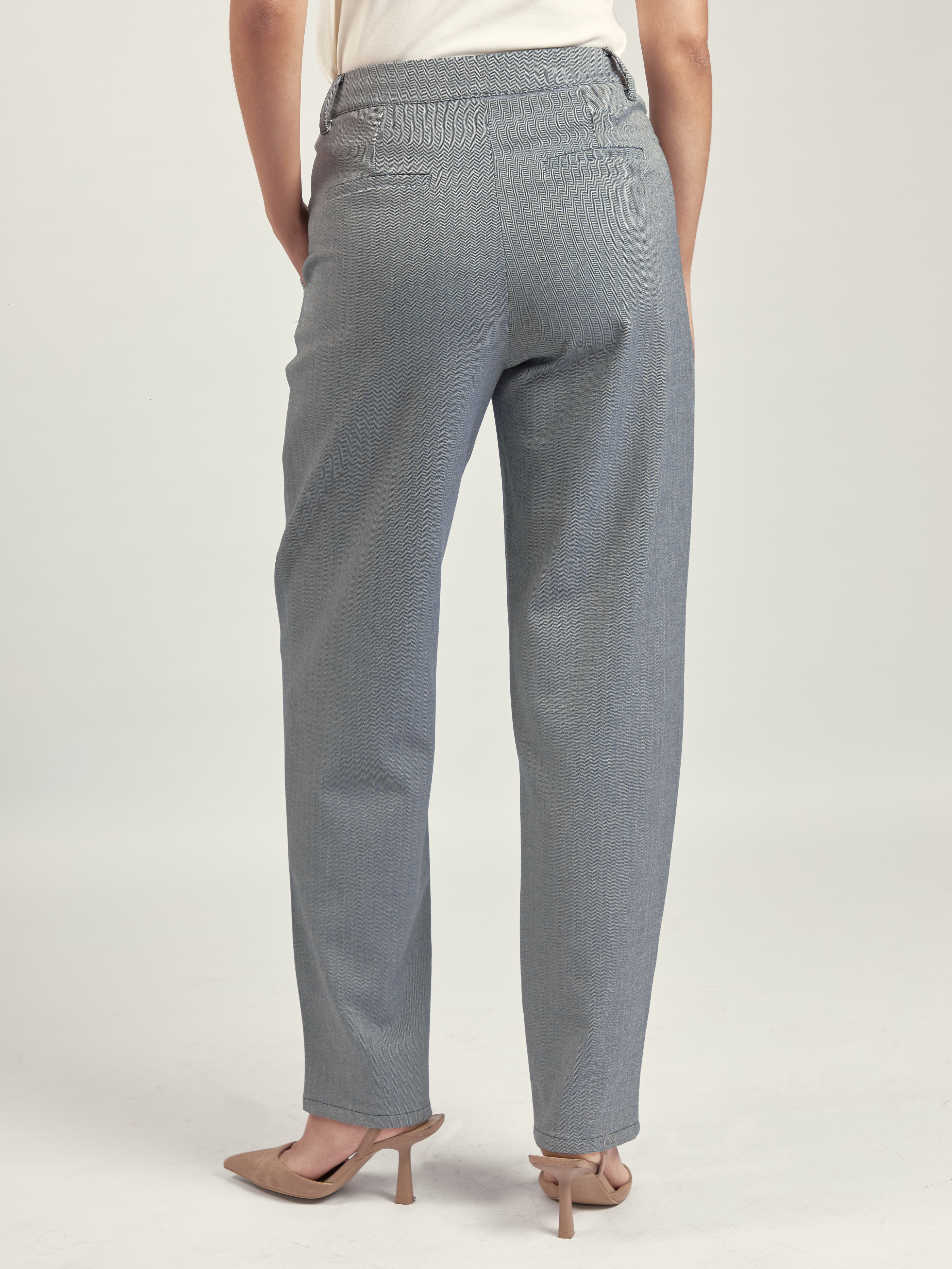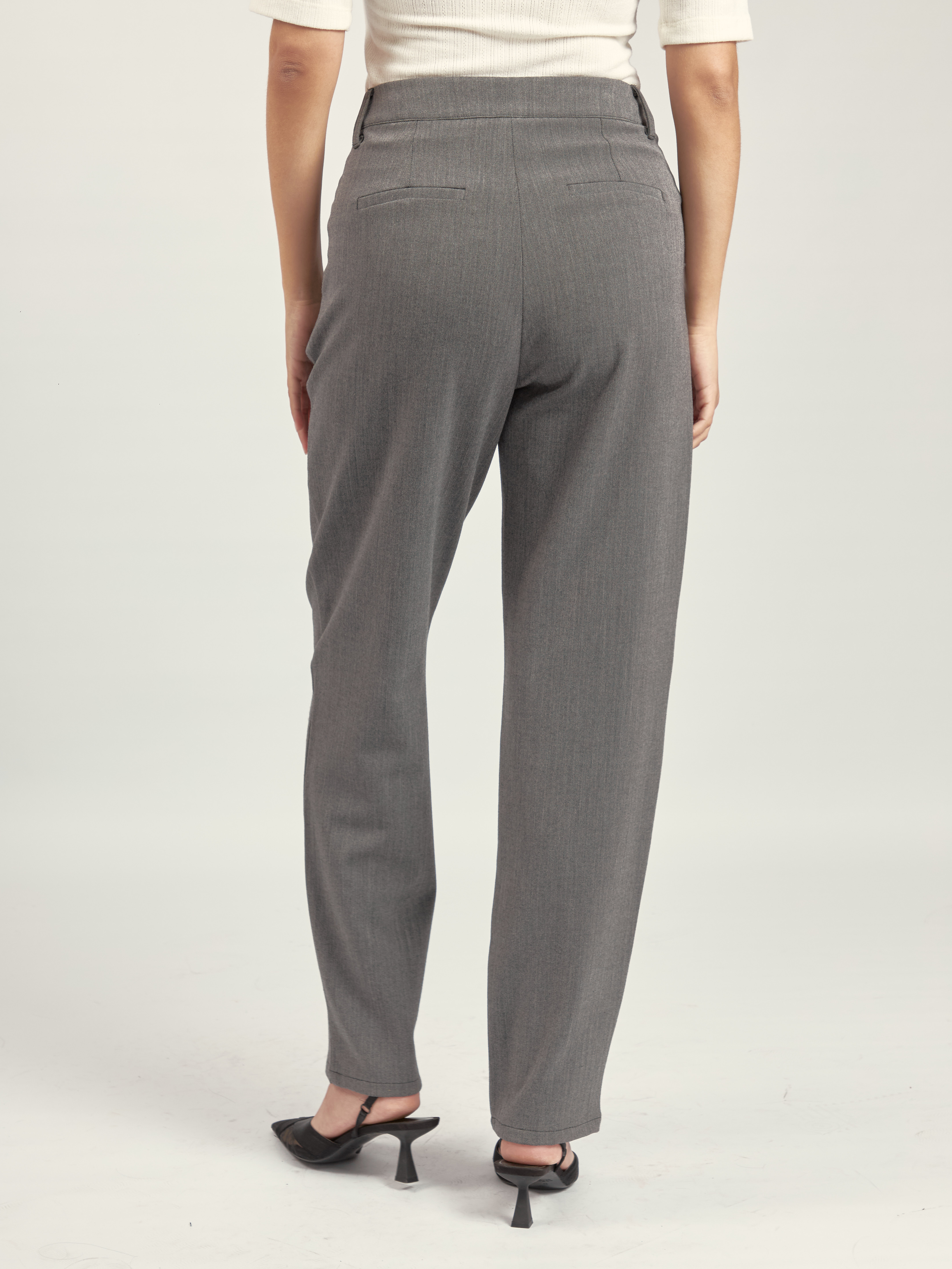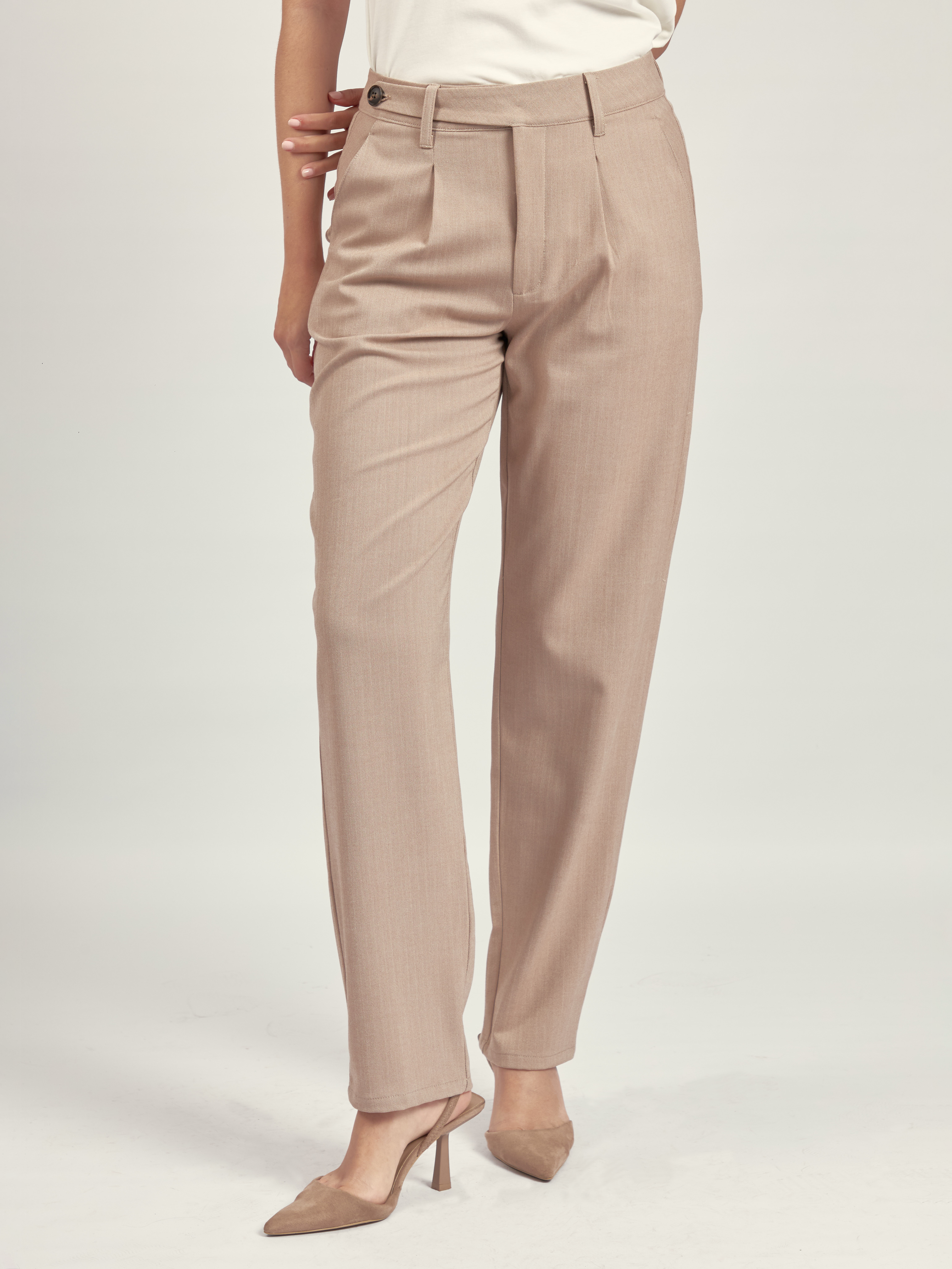 Pantalón tipo slouchy con pinzas y pretina cruzada. Bolsillos delanteros, presillas en la cintura y un botón delantero.