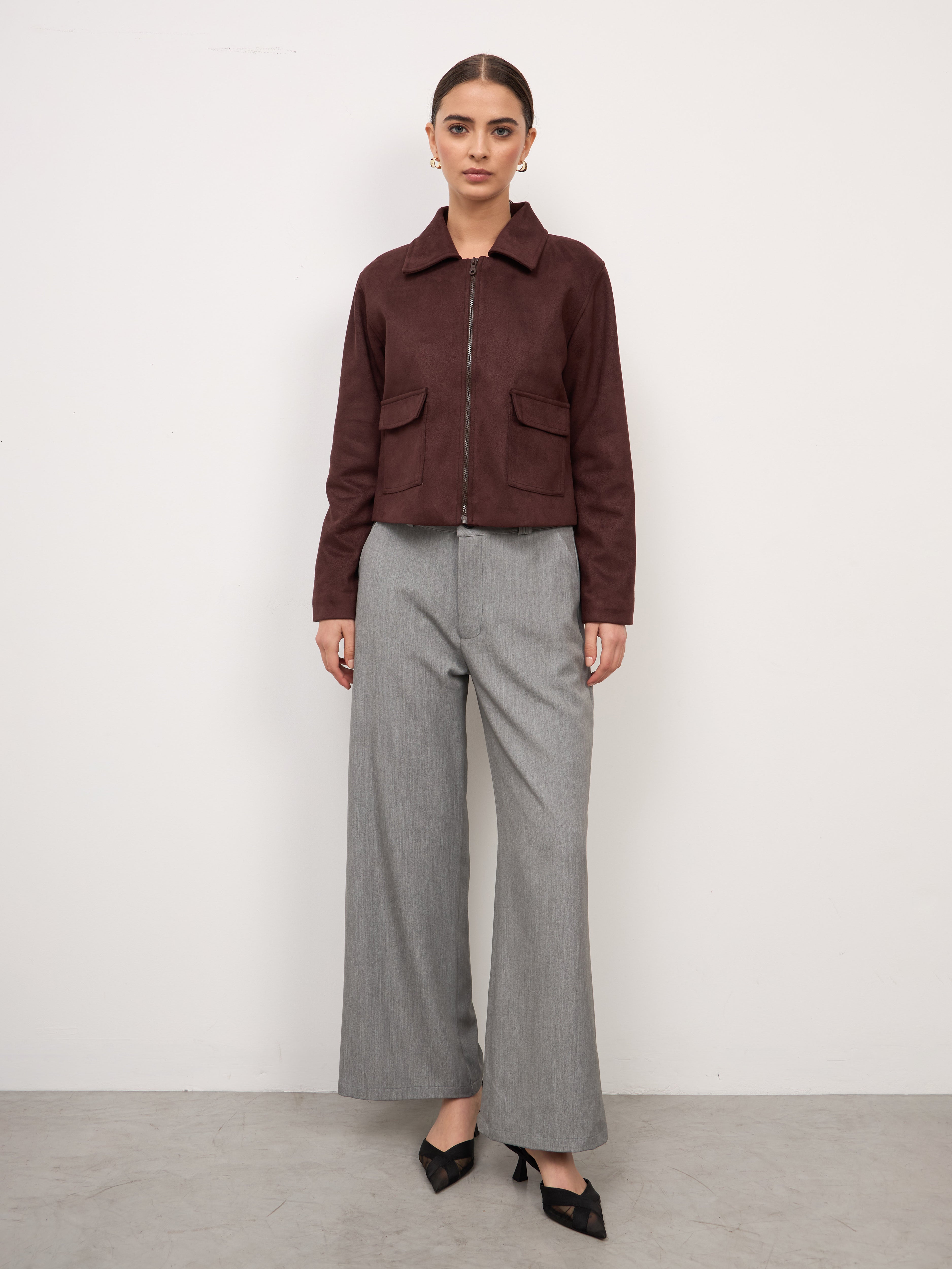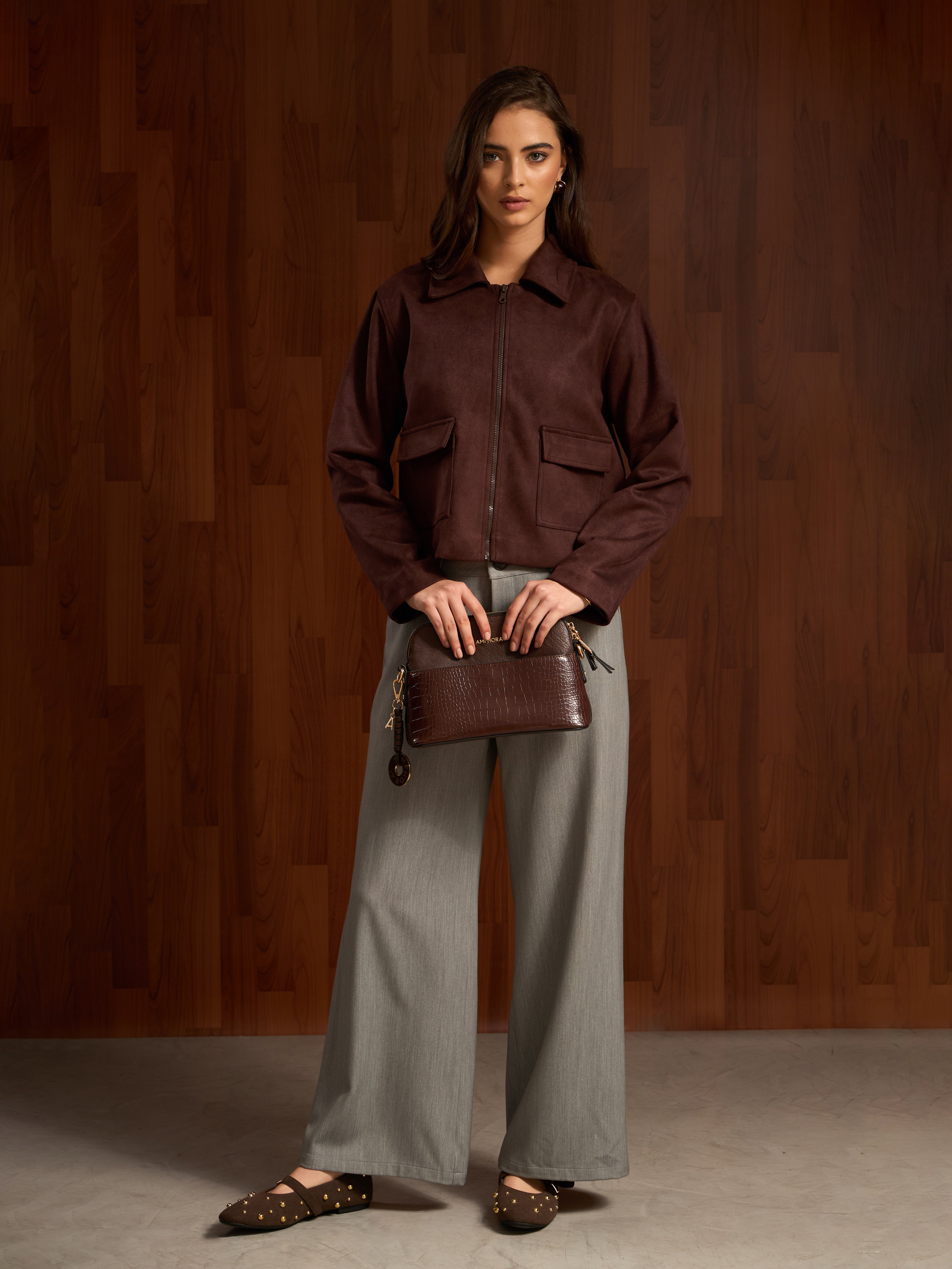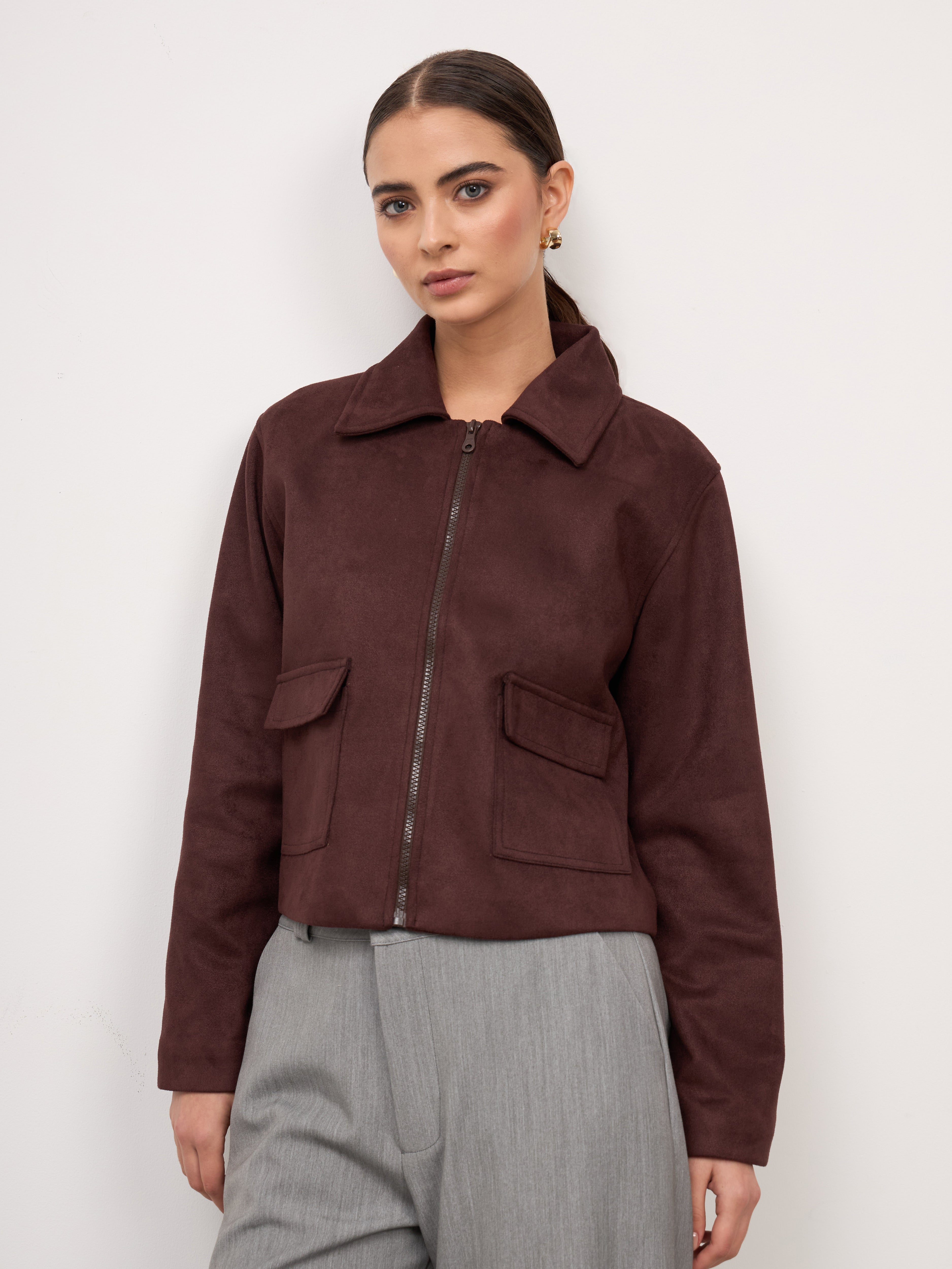 Chaqueta boxy de piel con corte estructurado. Presenta un cuello camisero con un cierre frontal y bolsillos con solapa a los lados, agregando funcionalidad y un acabado sofisticado. La prenda es versátil y atemporal, ideal para complementar looks formales o casuales con un toque refinado.