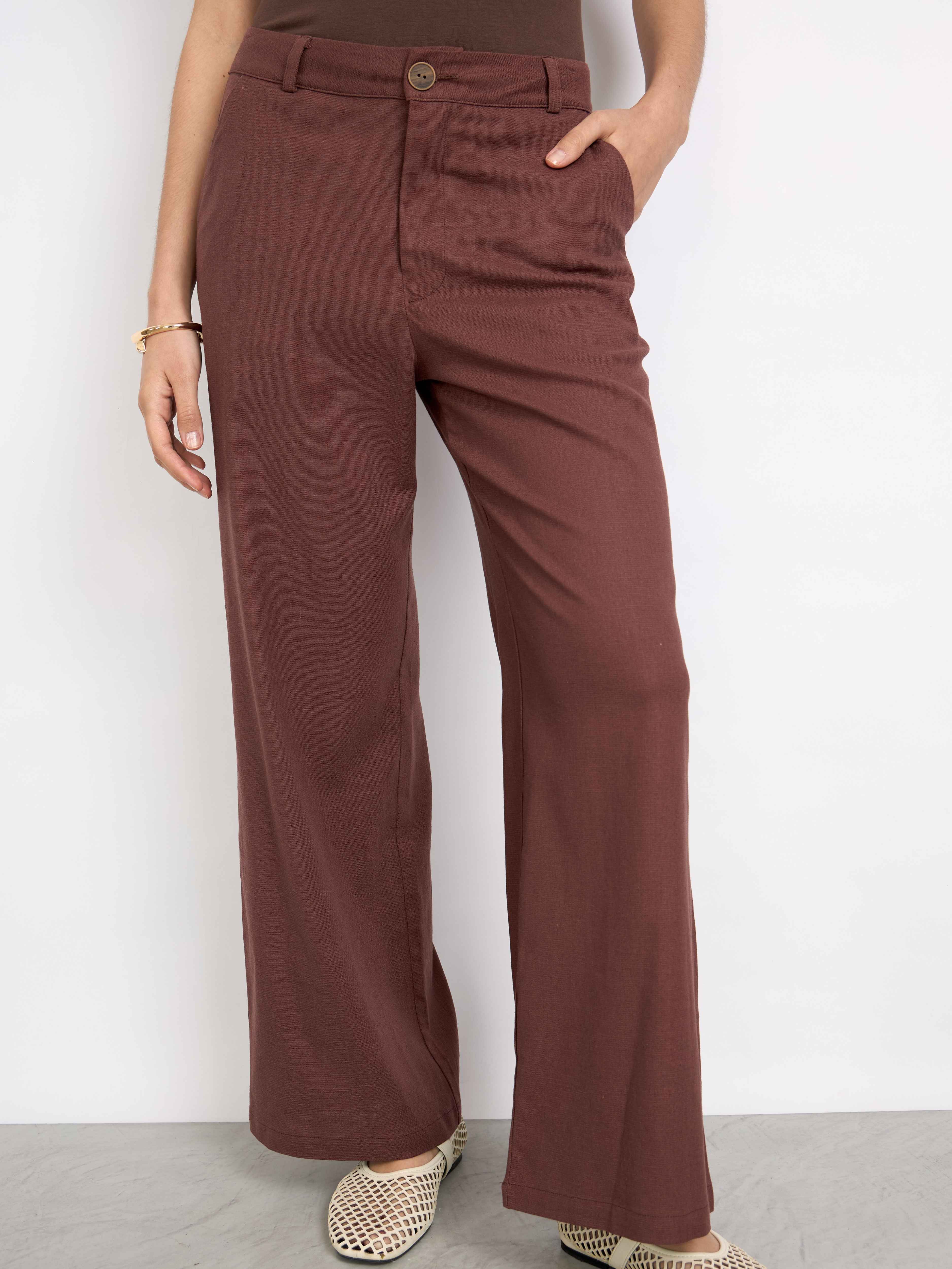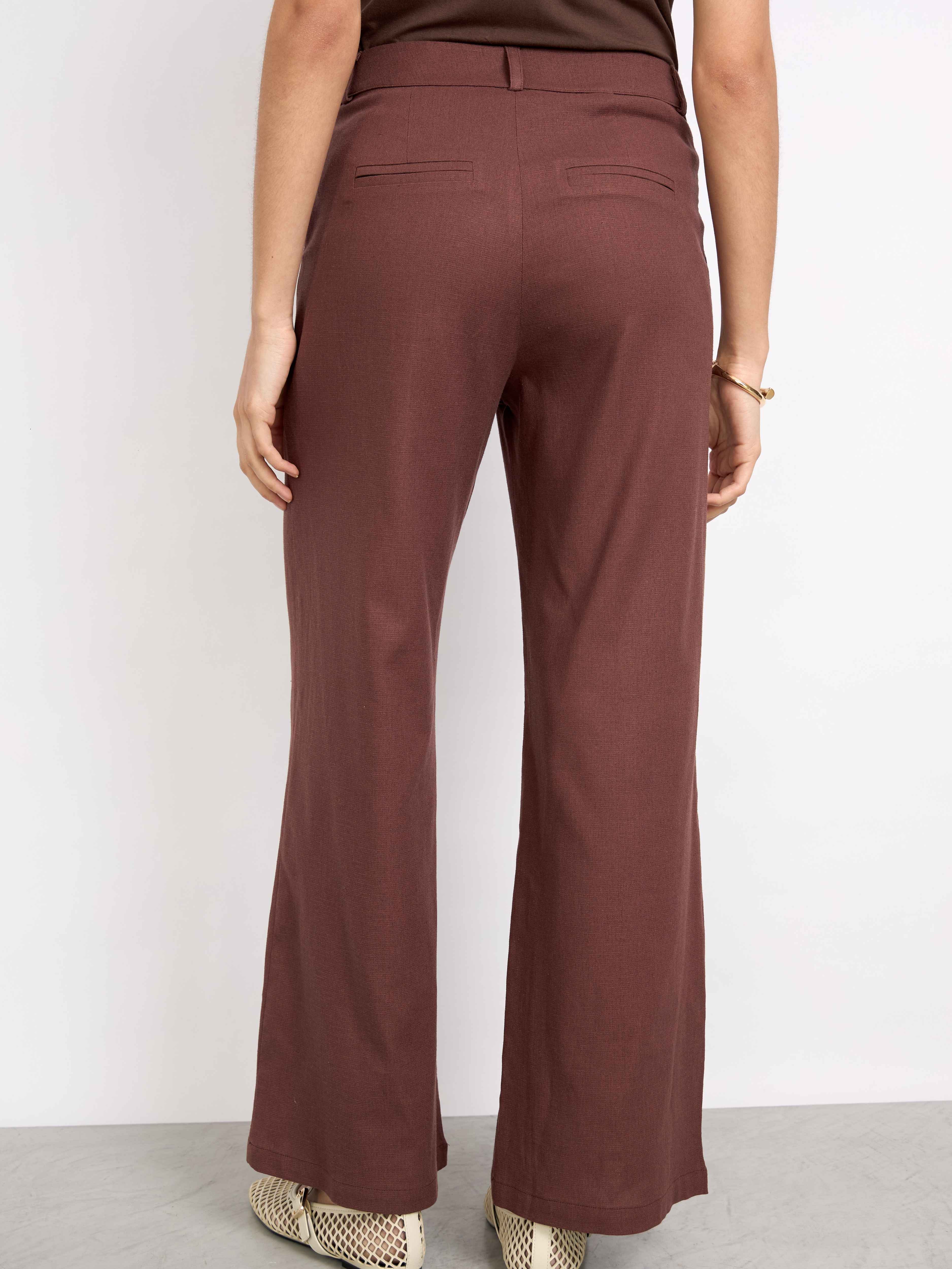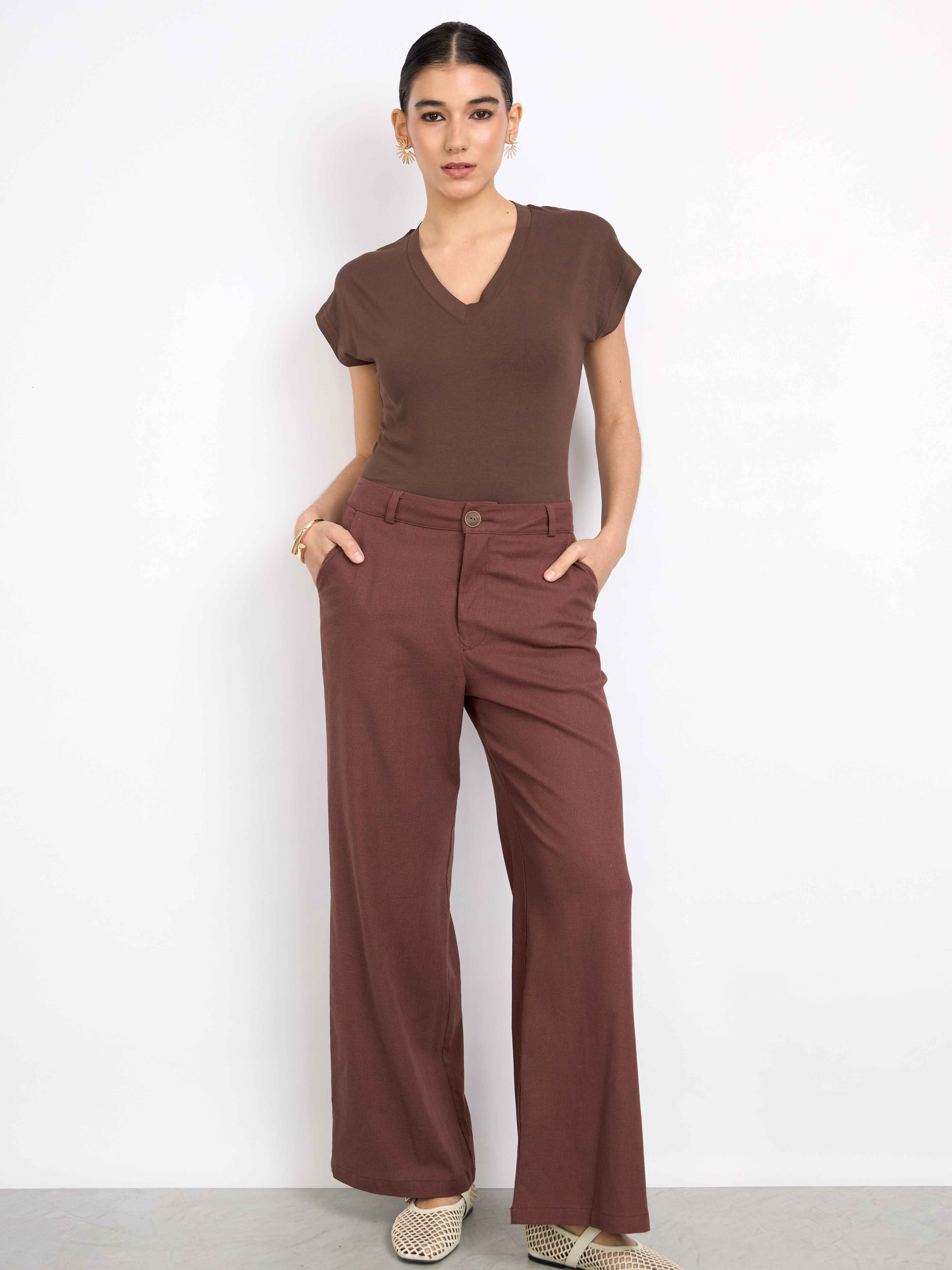 Pantalón sastre con corte recto y fit suelto. Cuenta con tiro alto, bolsillos laterales y posteriores. Cierre y botón en el delantero, pliegues en la parte frontal con línea de planchado y pinzas en la espalda. Estilo casual.