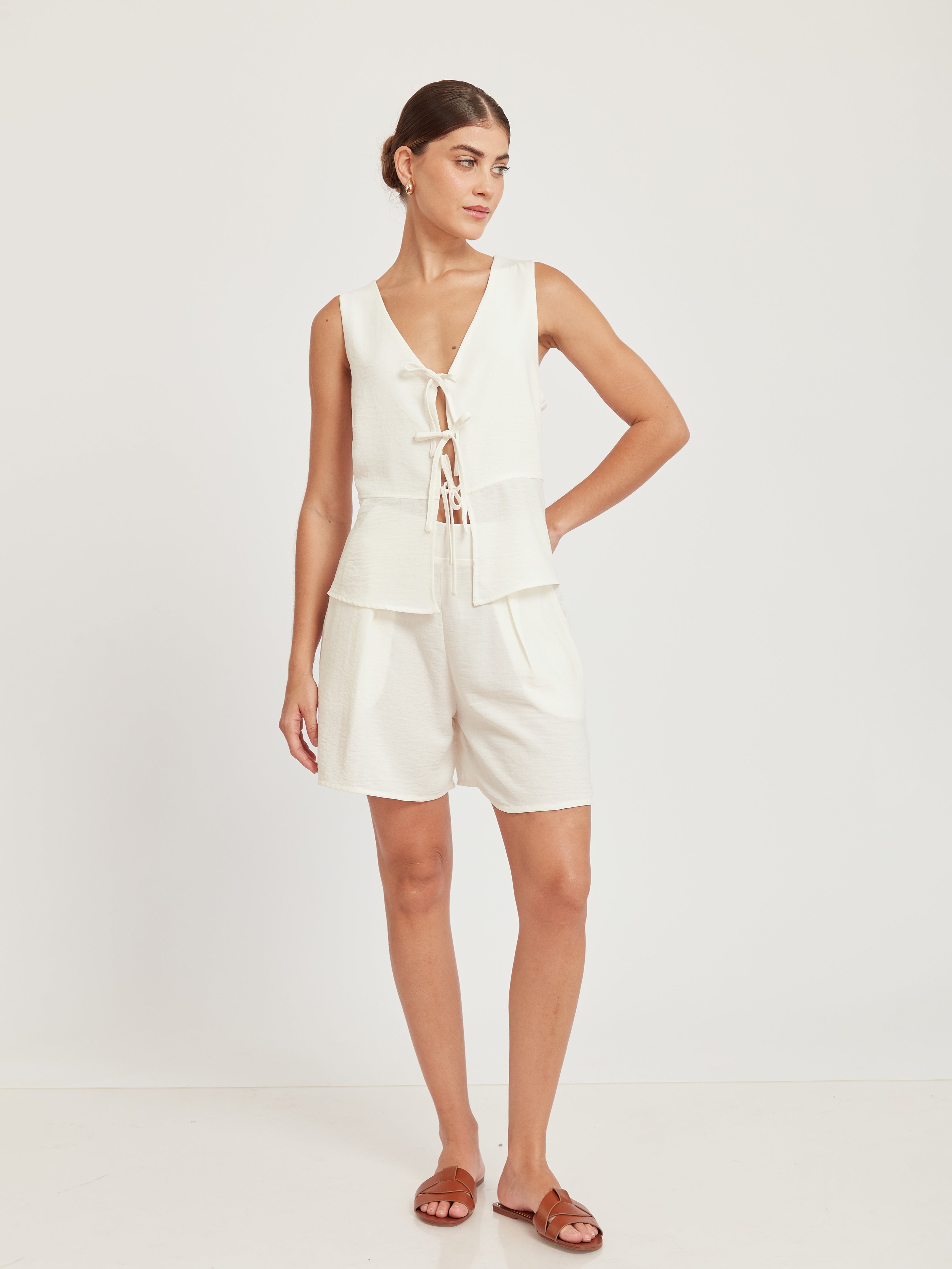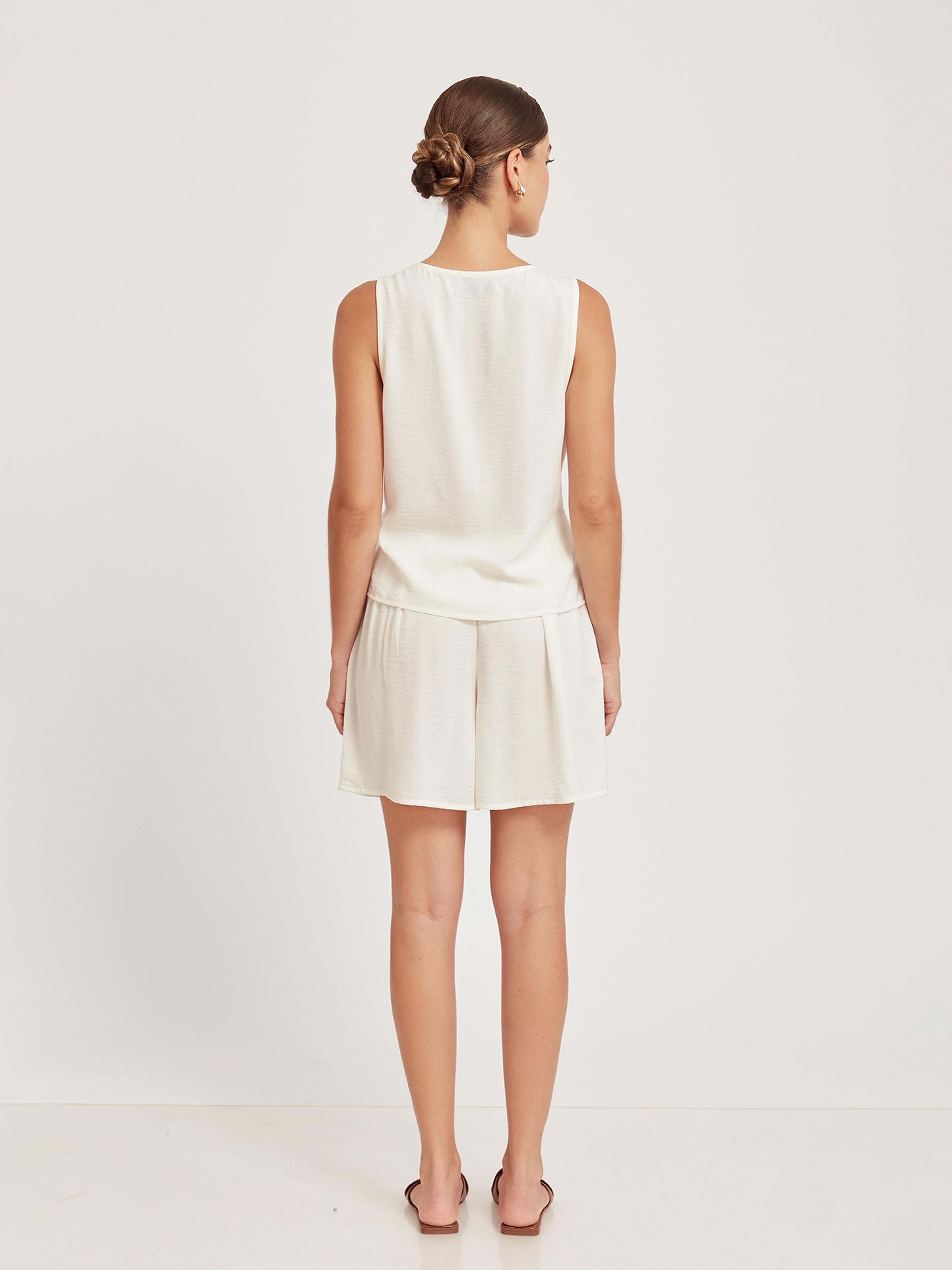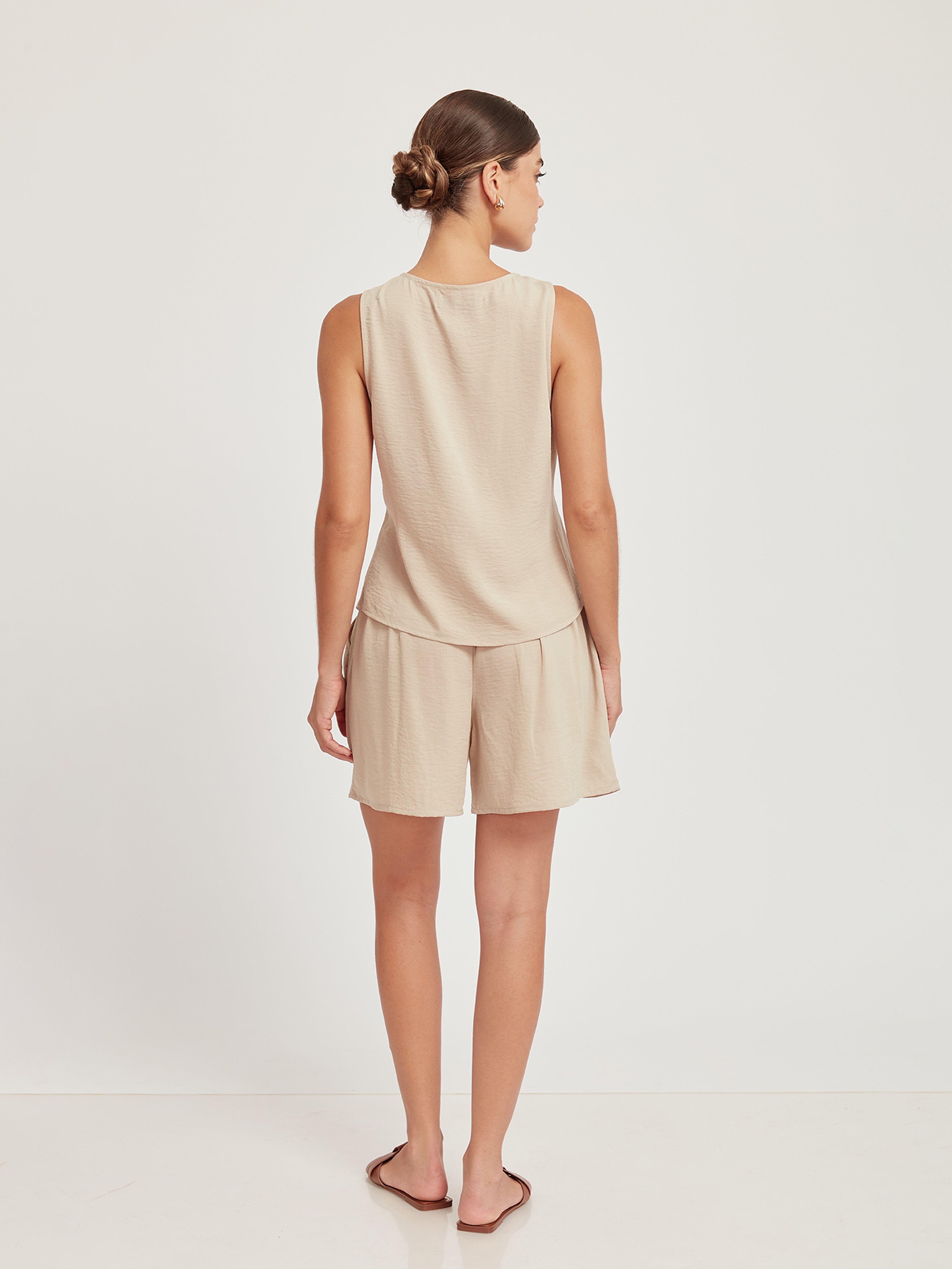 Short corte recto con vuelo pliegues bolsillo y pretina con elástico en la espalda.