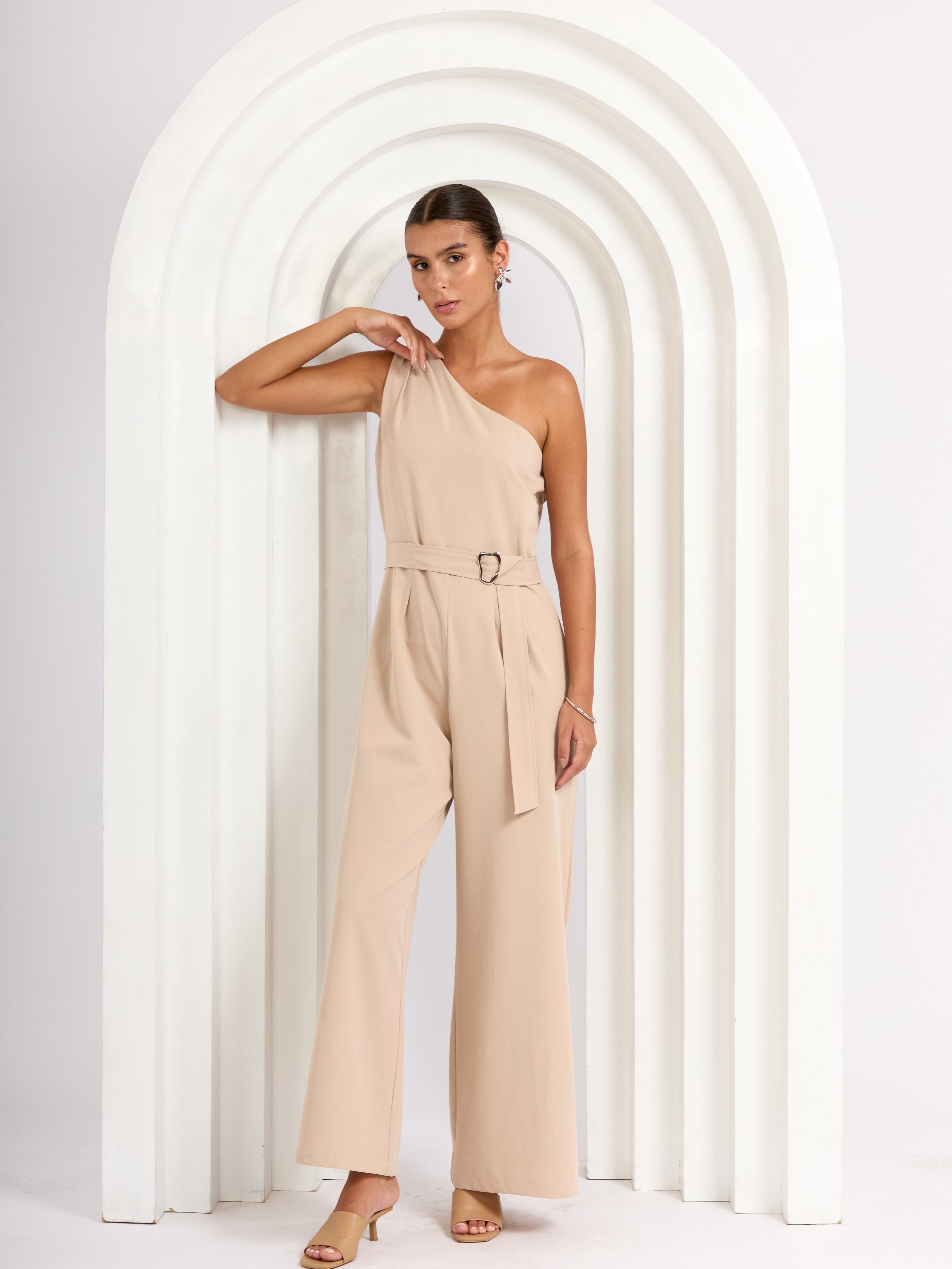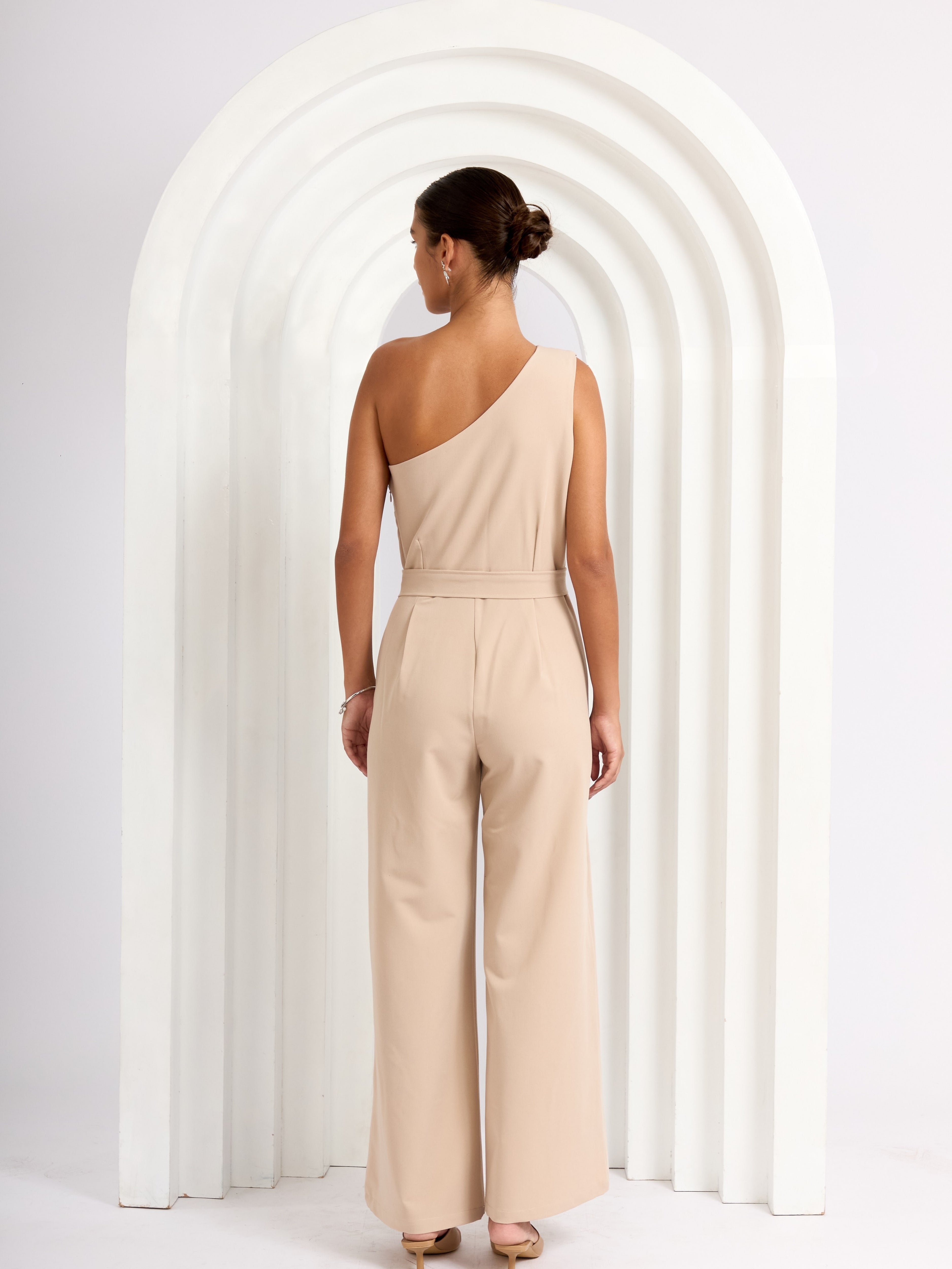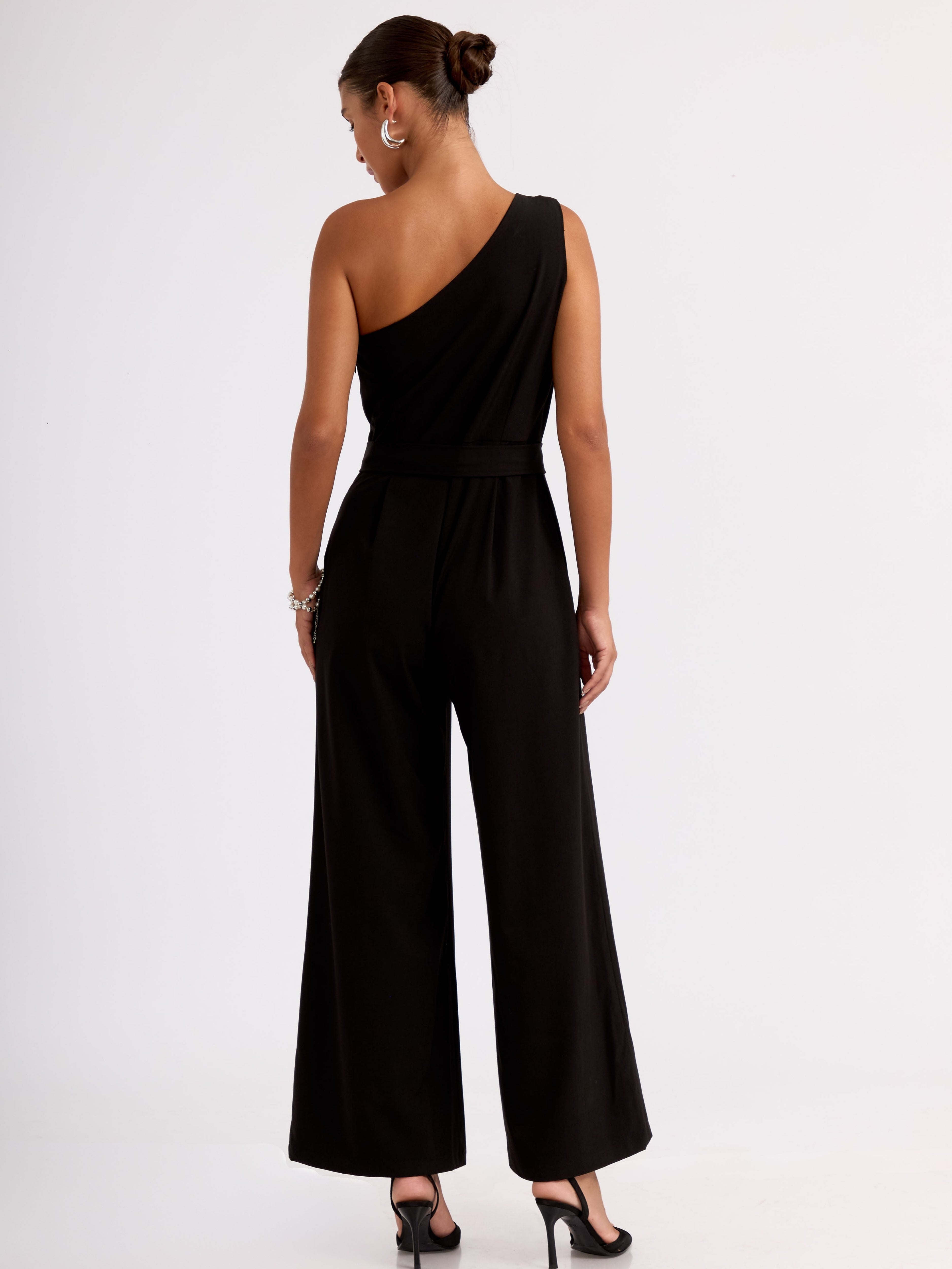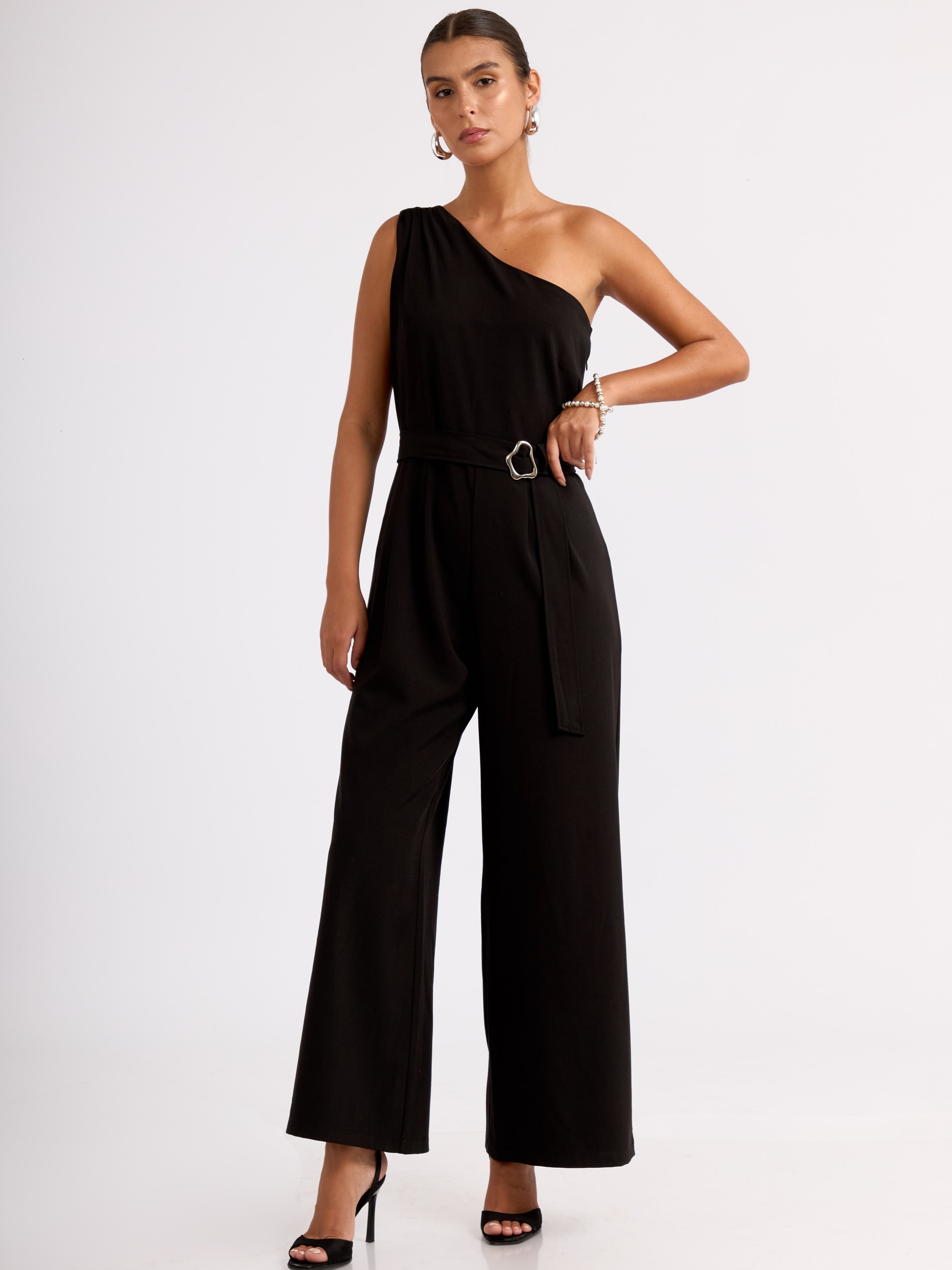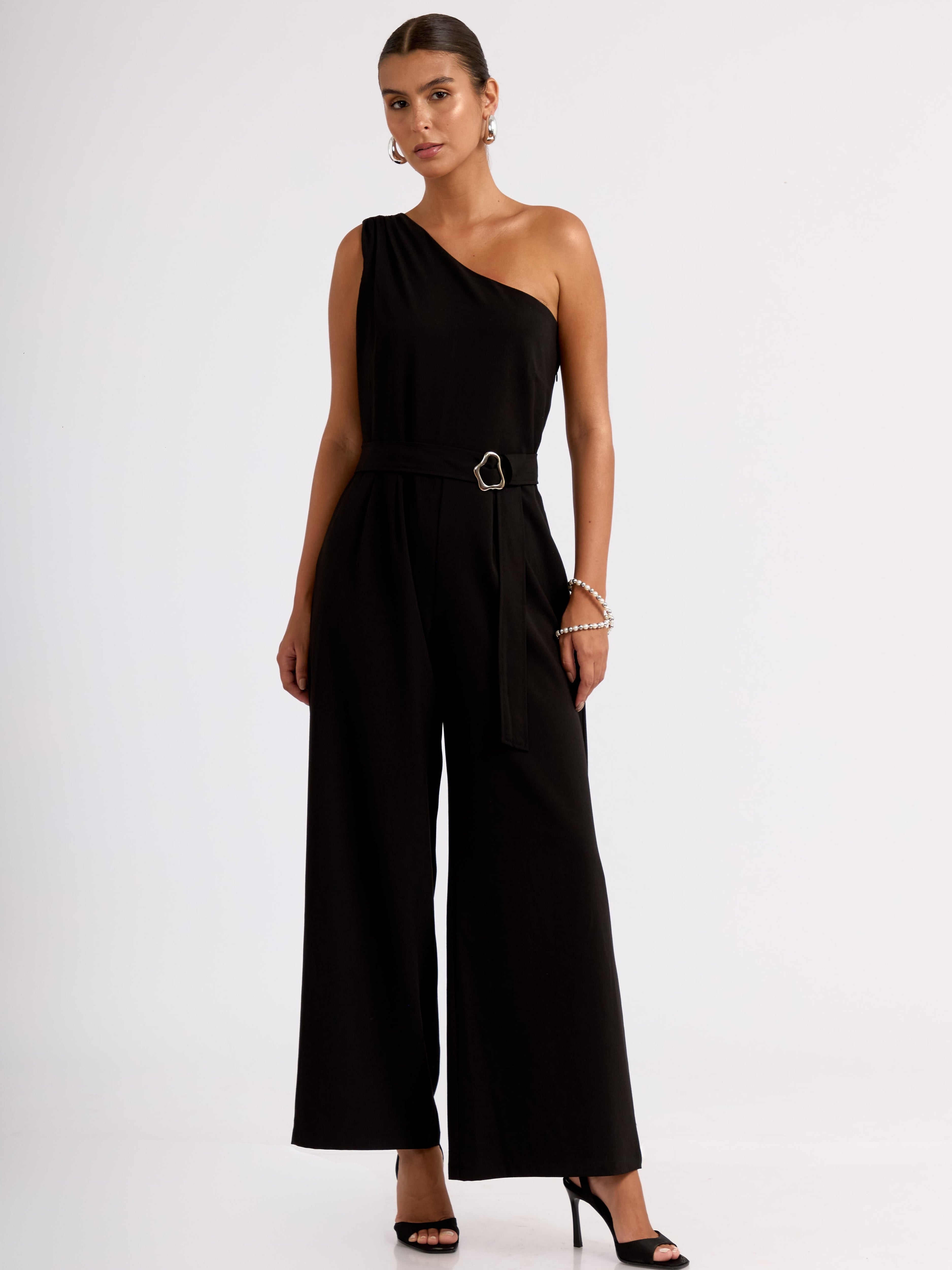 Enterizo de un solo hombro con recogido delicado en el hombro. Incluye un cinturón ancho que acentúa la cintura, con una hebilla metálica abstracta. Diseño ajustado en la parte superior y pantalones de pierna recta que equilibran elegancia y comodidad. Con cierre invisible lateral.