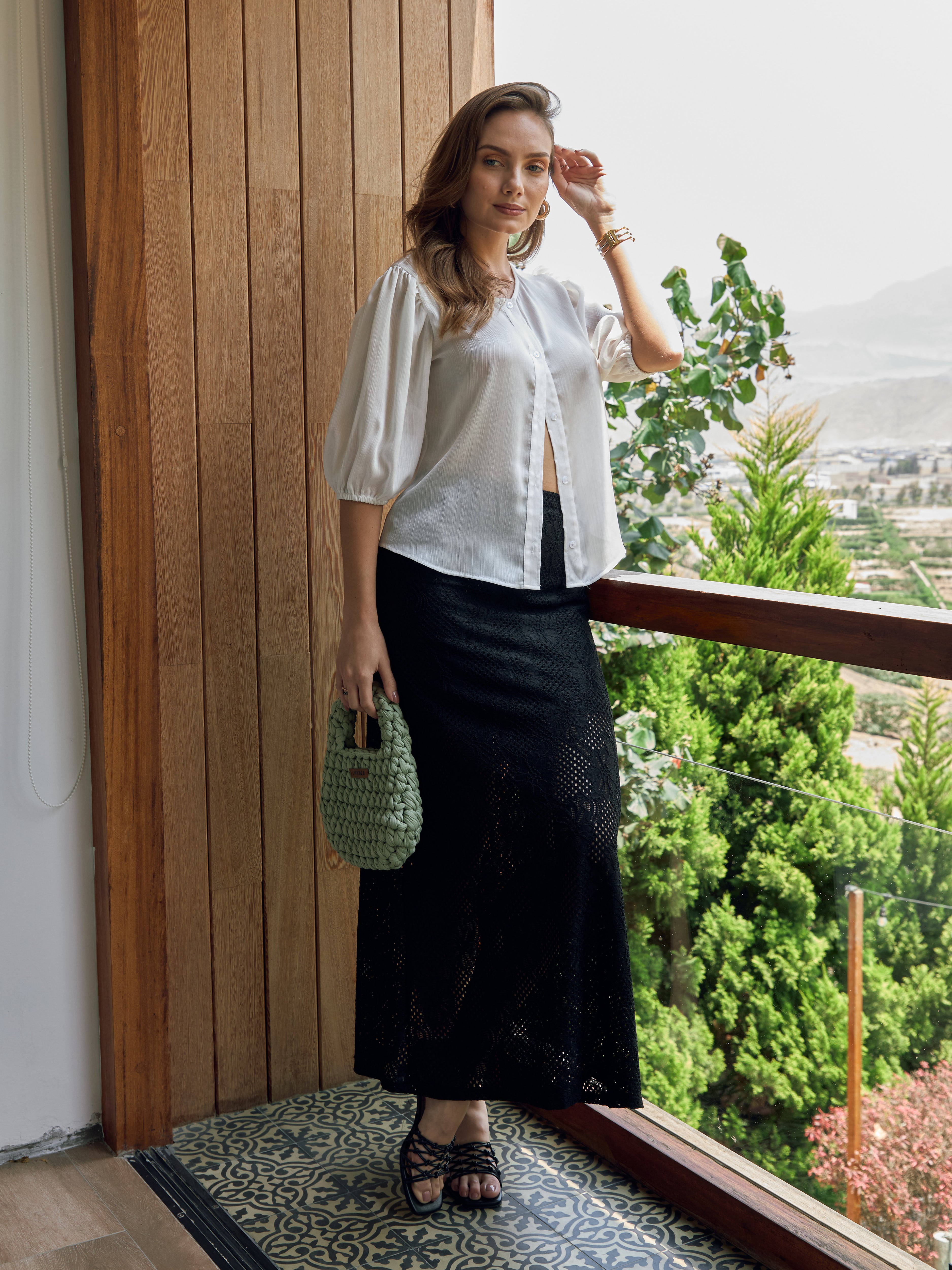Falda midi de encaje con pretina elástica en la cintura para un ajuste cómodo. Cuenta con minifalda de forro y apertura en la parte baja de la espalda para mayor movilidad.