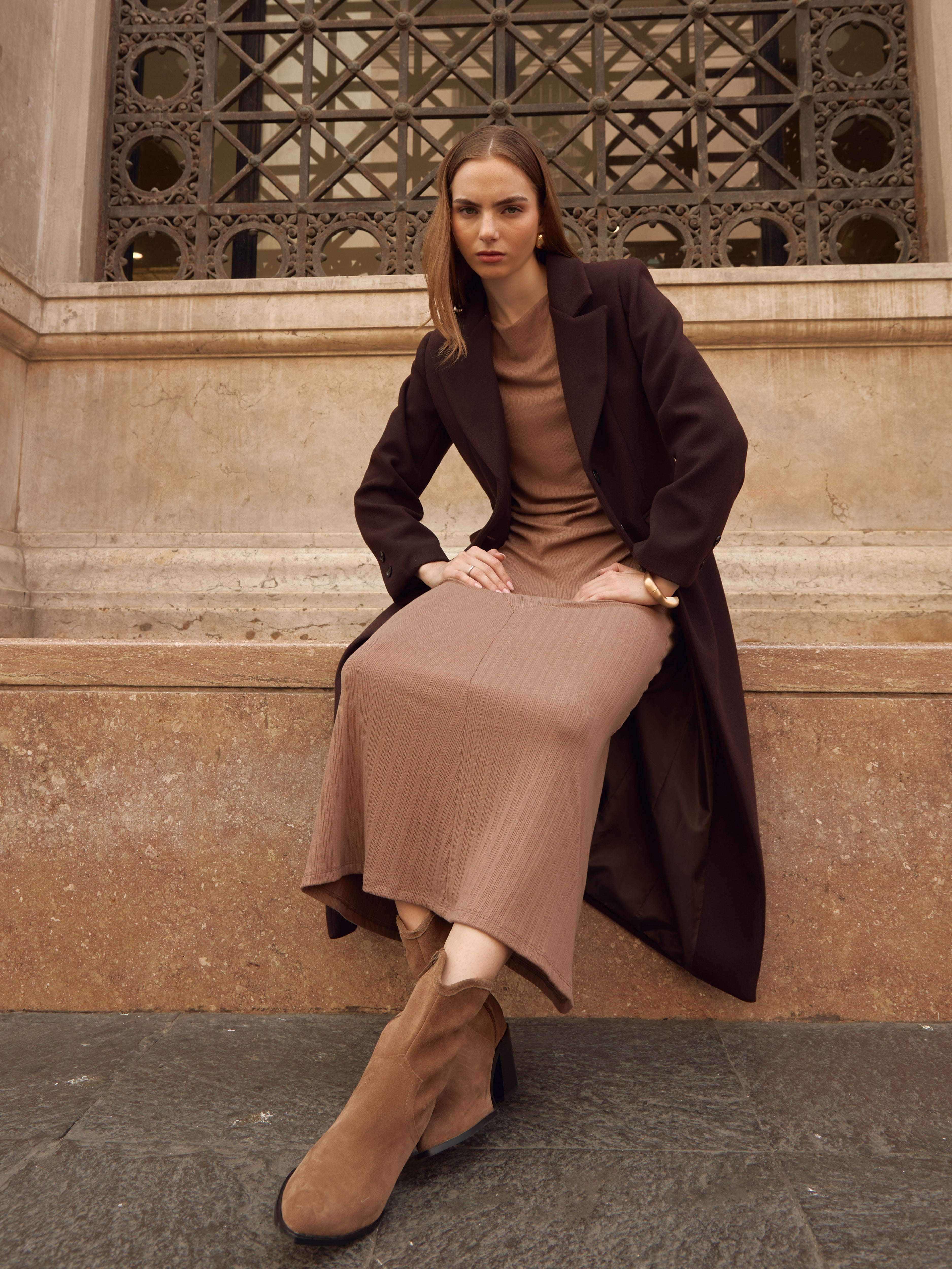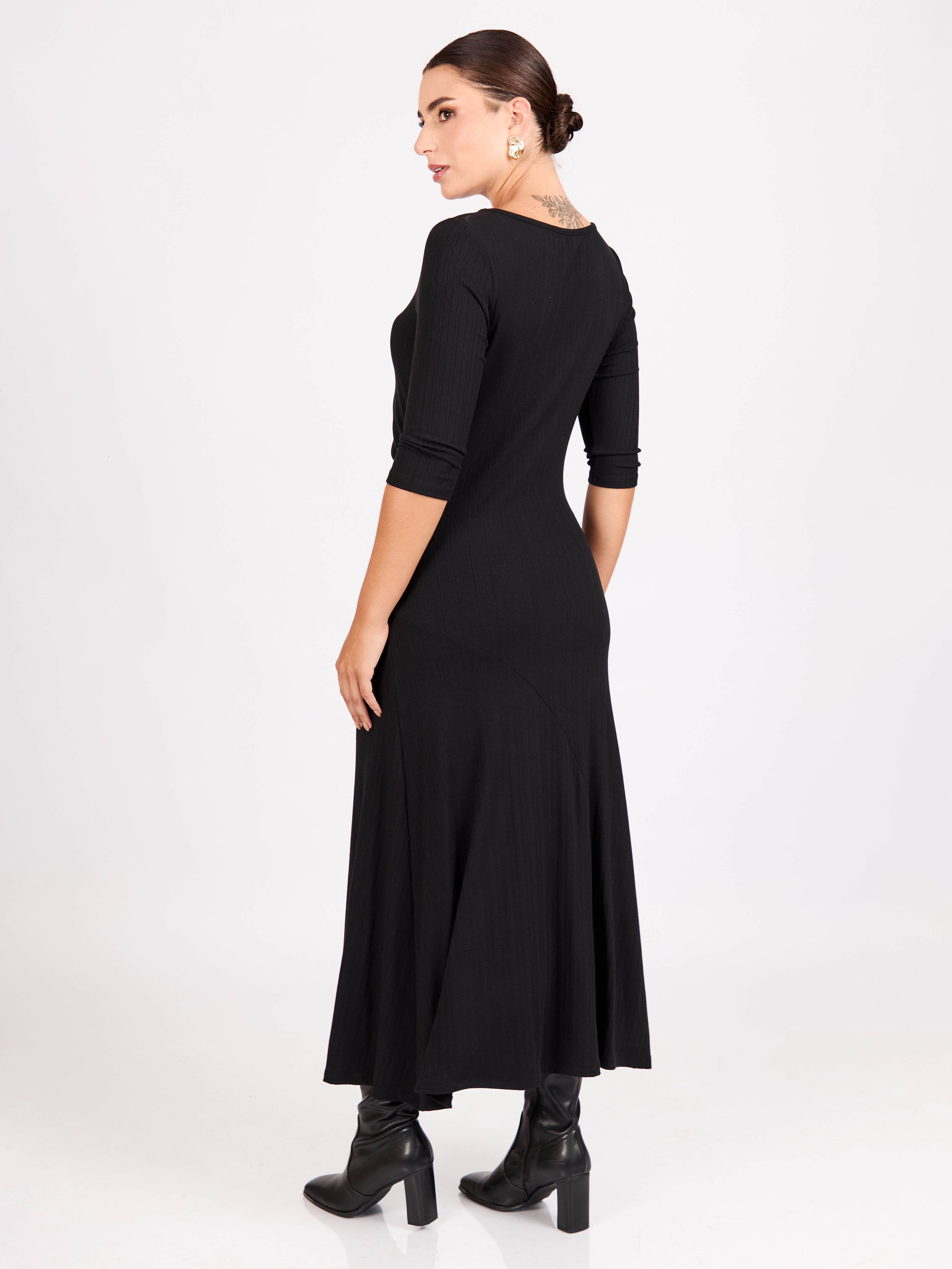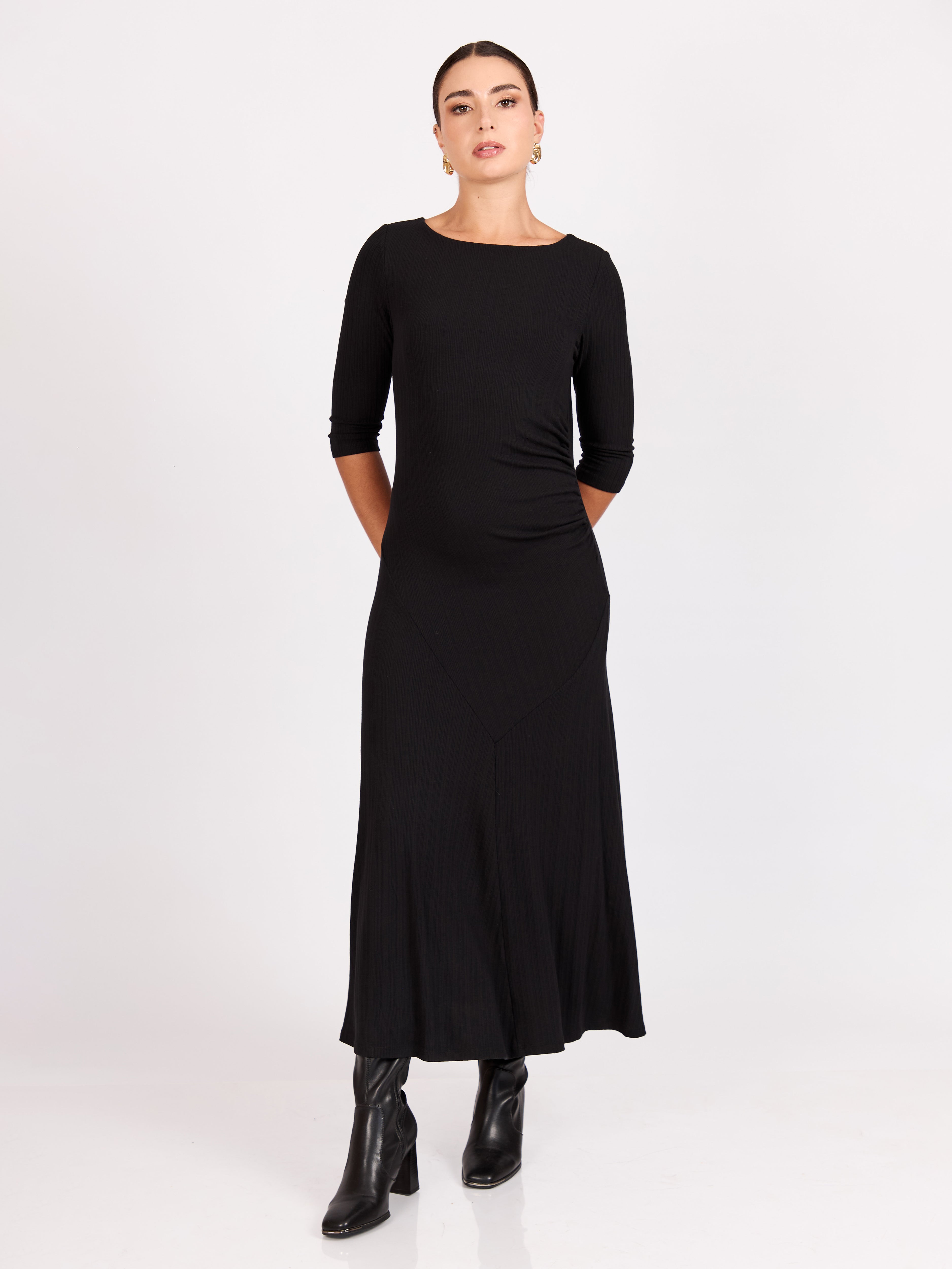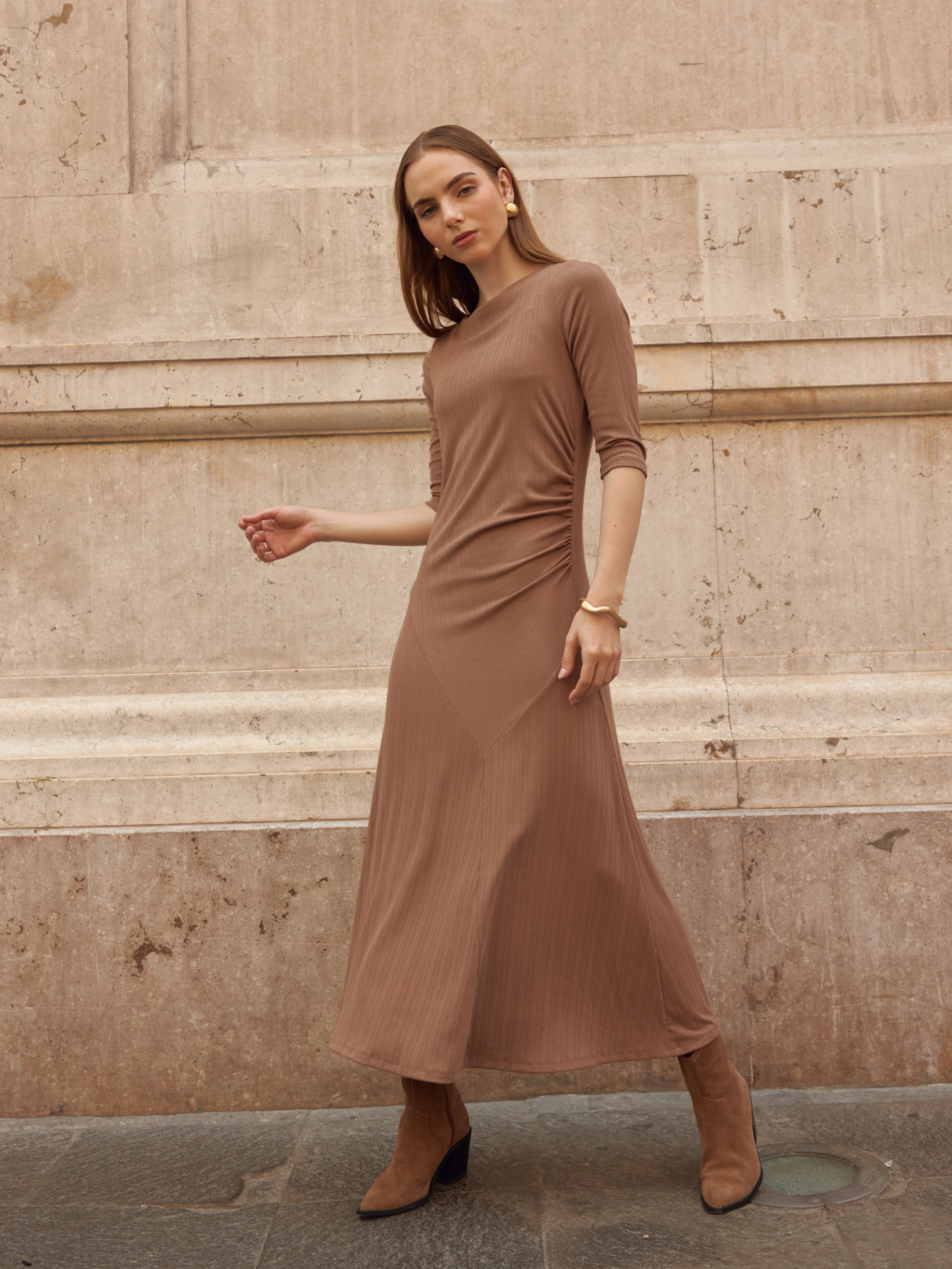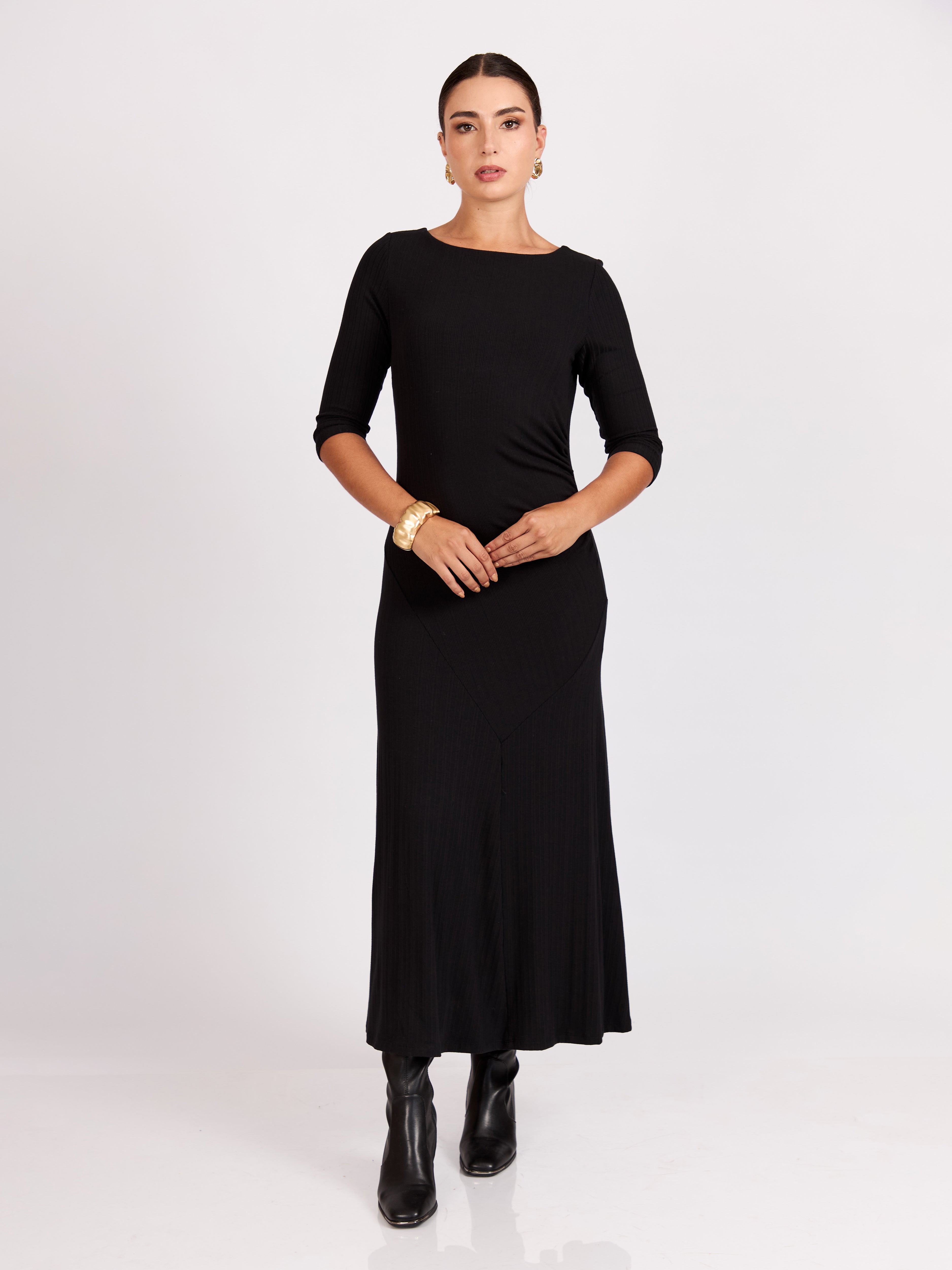 Vestido con cuello bote, que enmarca delicadamente los hombros. Con mangas tres cuartos y cintura fruncida que define la silueta con suavidad, mientras que el faldón de corte asimétrico aporta movimiento y un toque moderno al diseño.