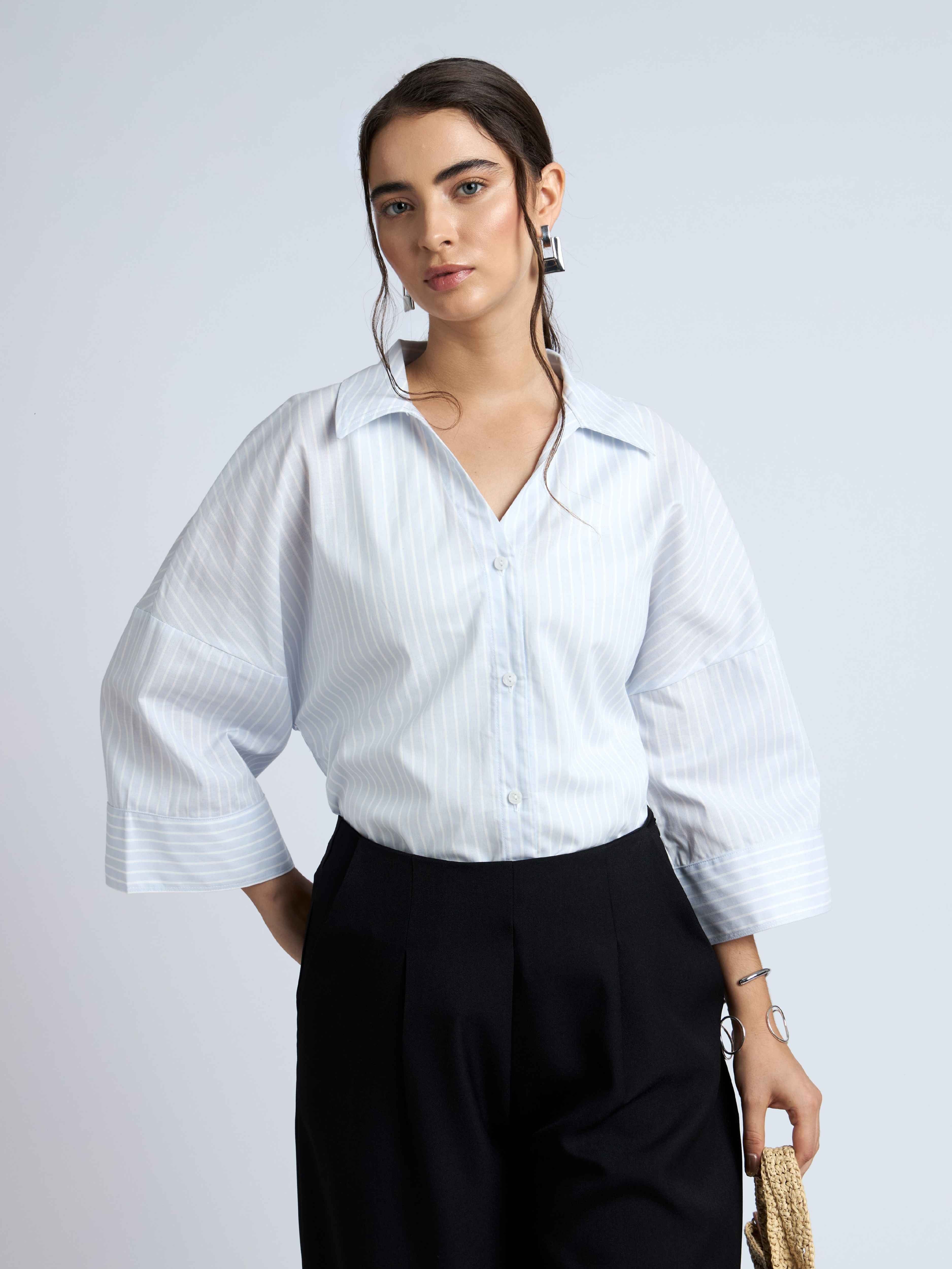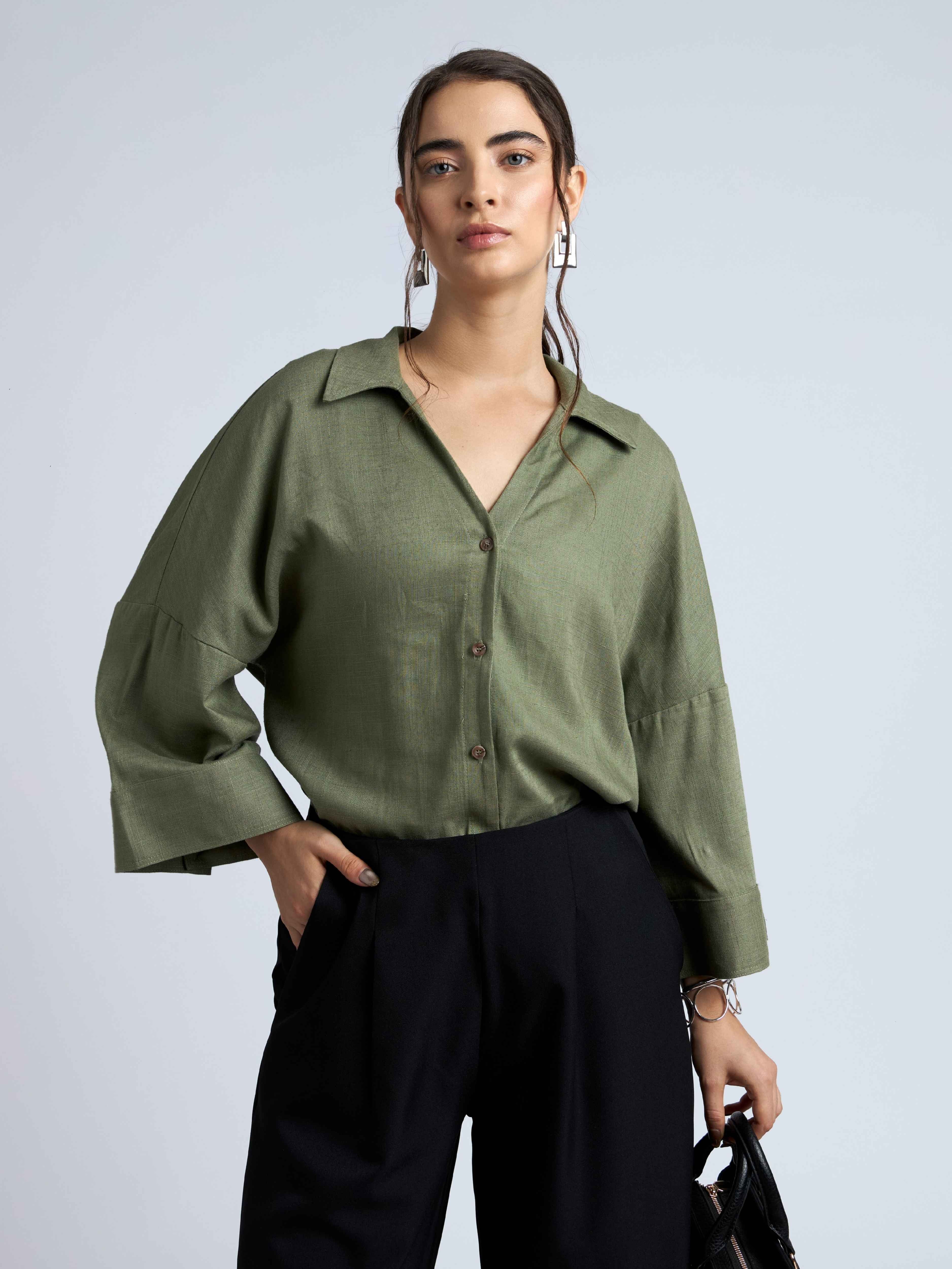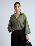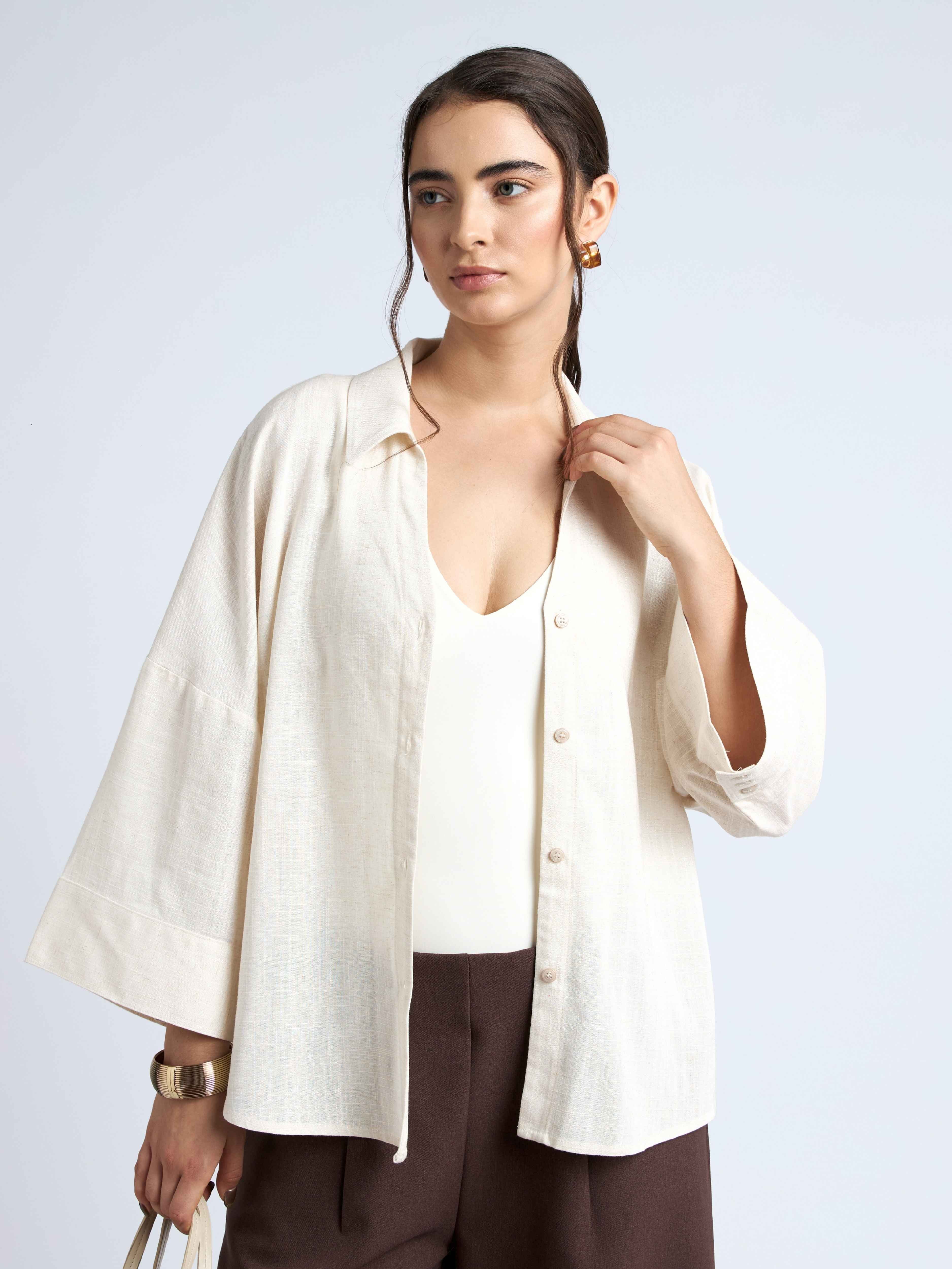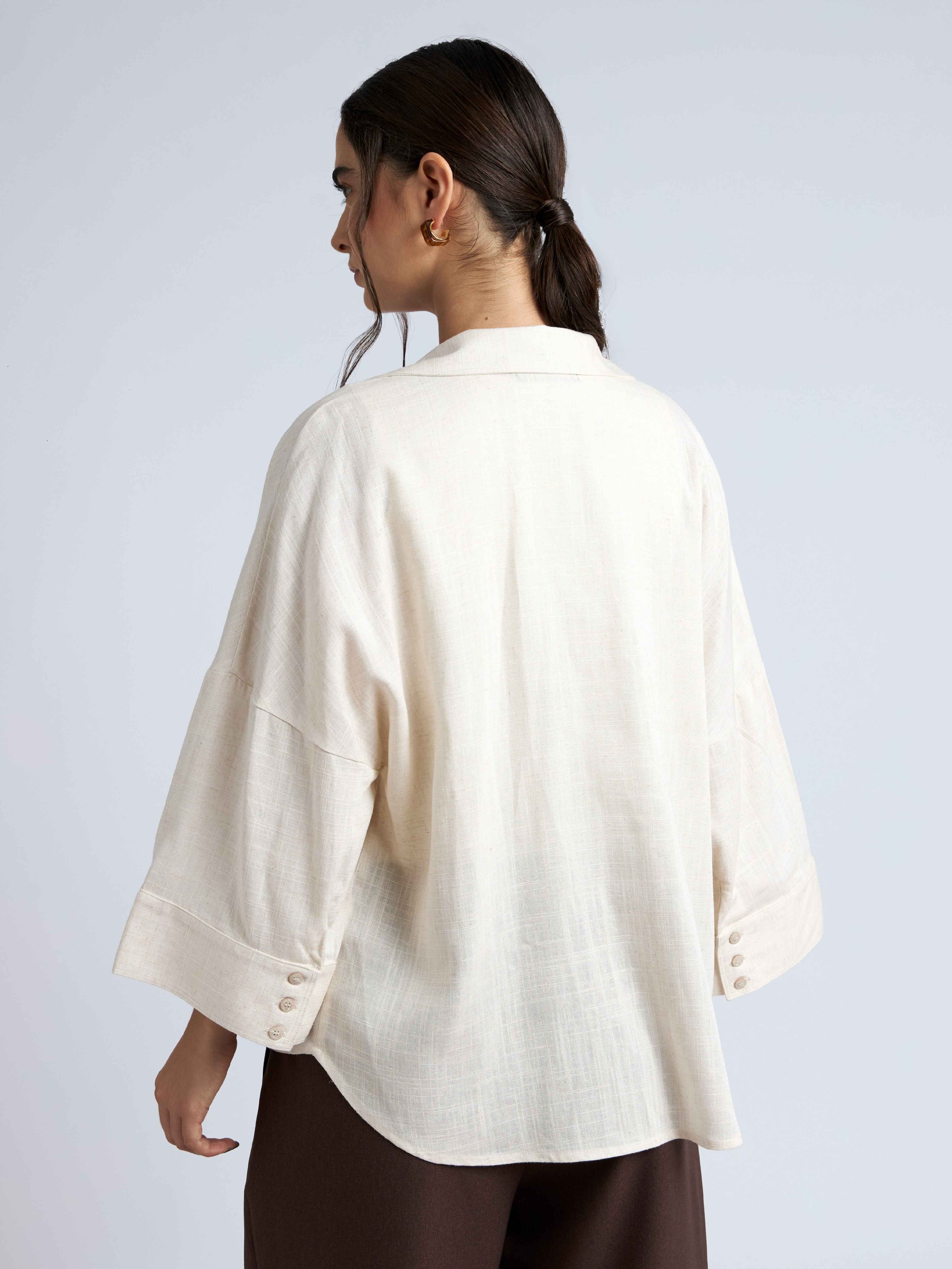 Camisa de fit oversize, manga 3/4 con abertura de manga y tres botones en el puño. Cuenta con hombros caidos y escote en V.
