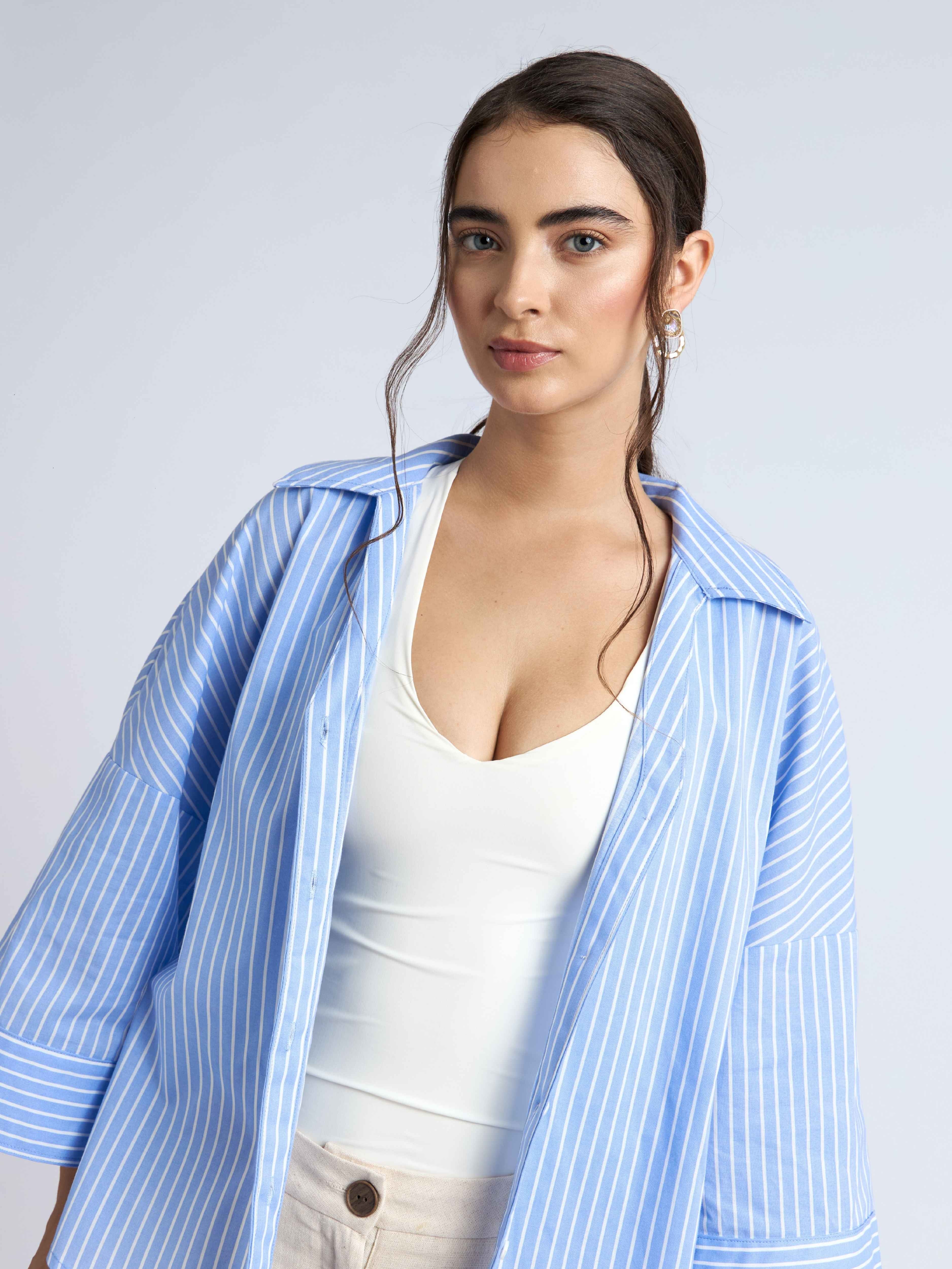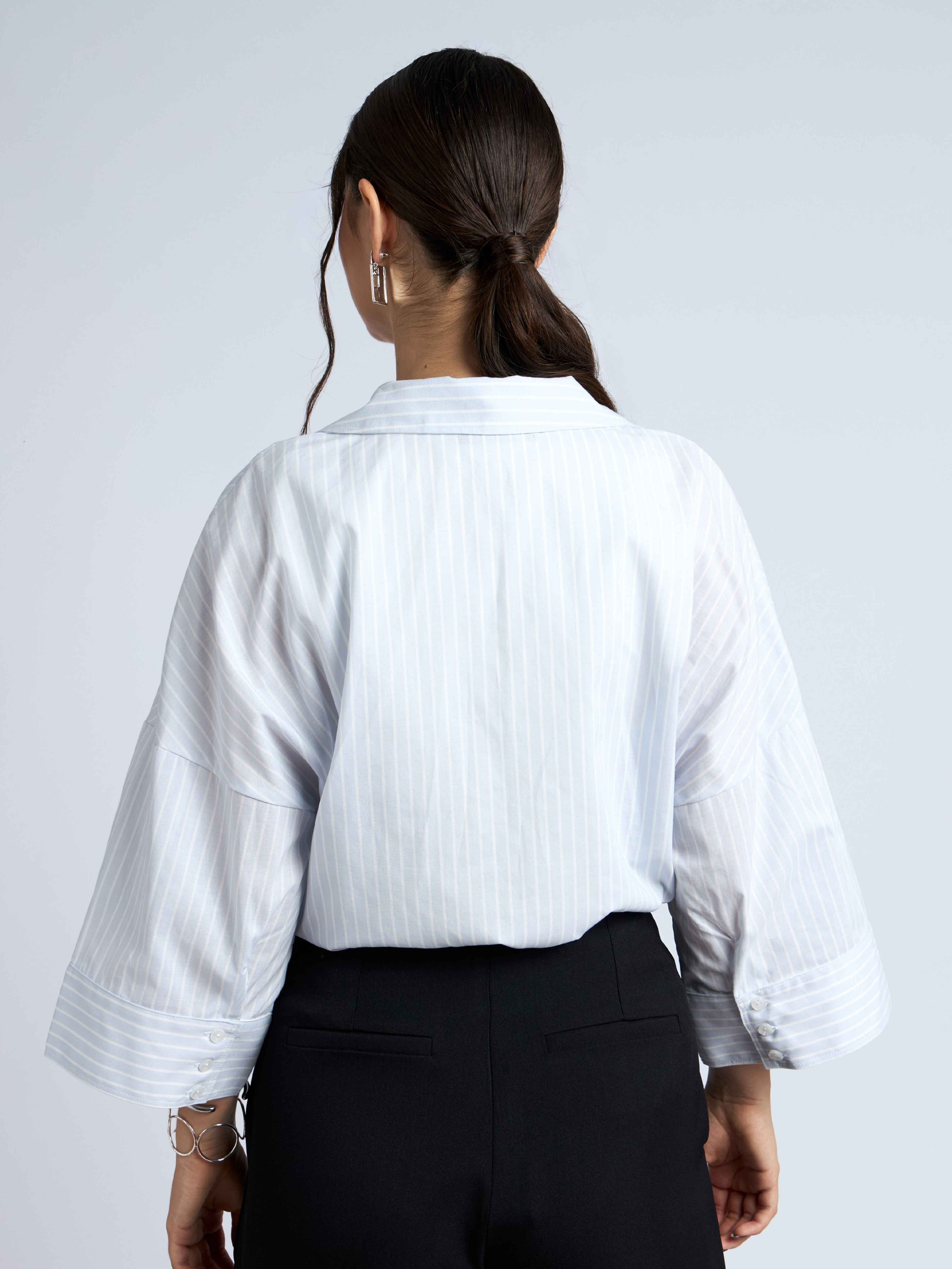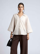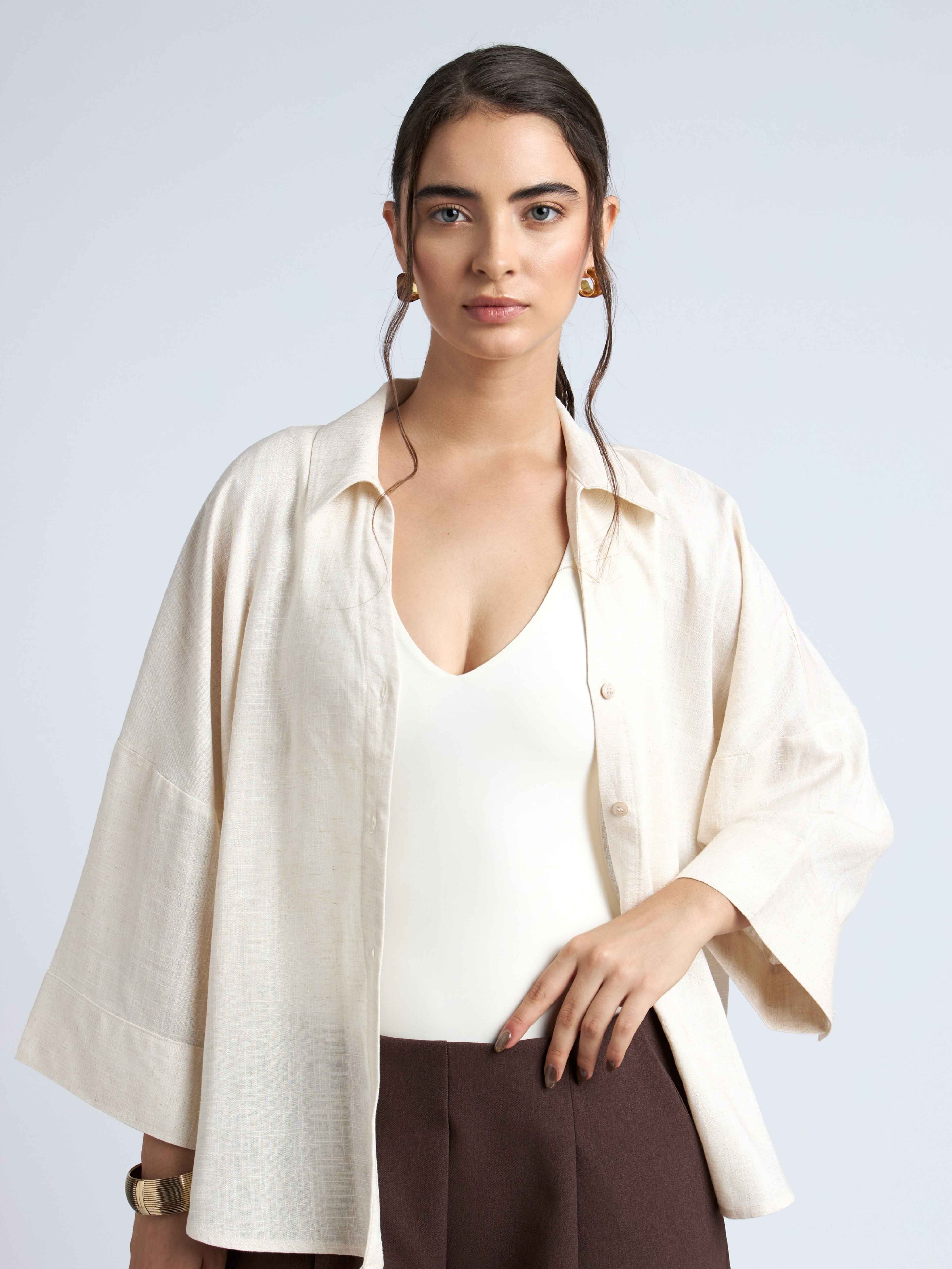 Camisa de fit oversize, manga 3/4 con abertura de manga y tres botones en el puño. Cuenta con hombros caidos y escote en V.