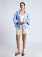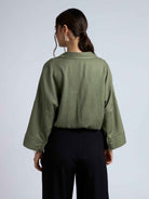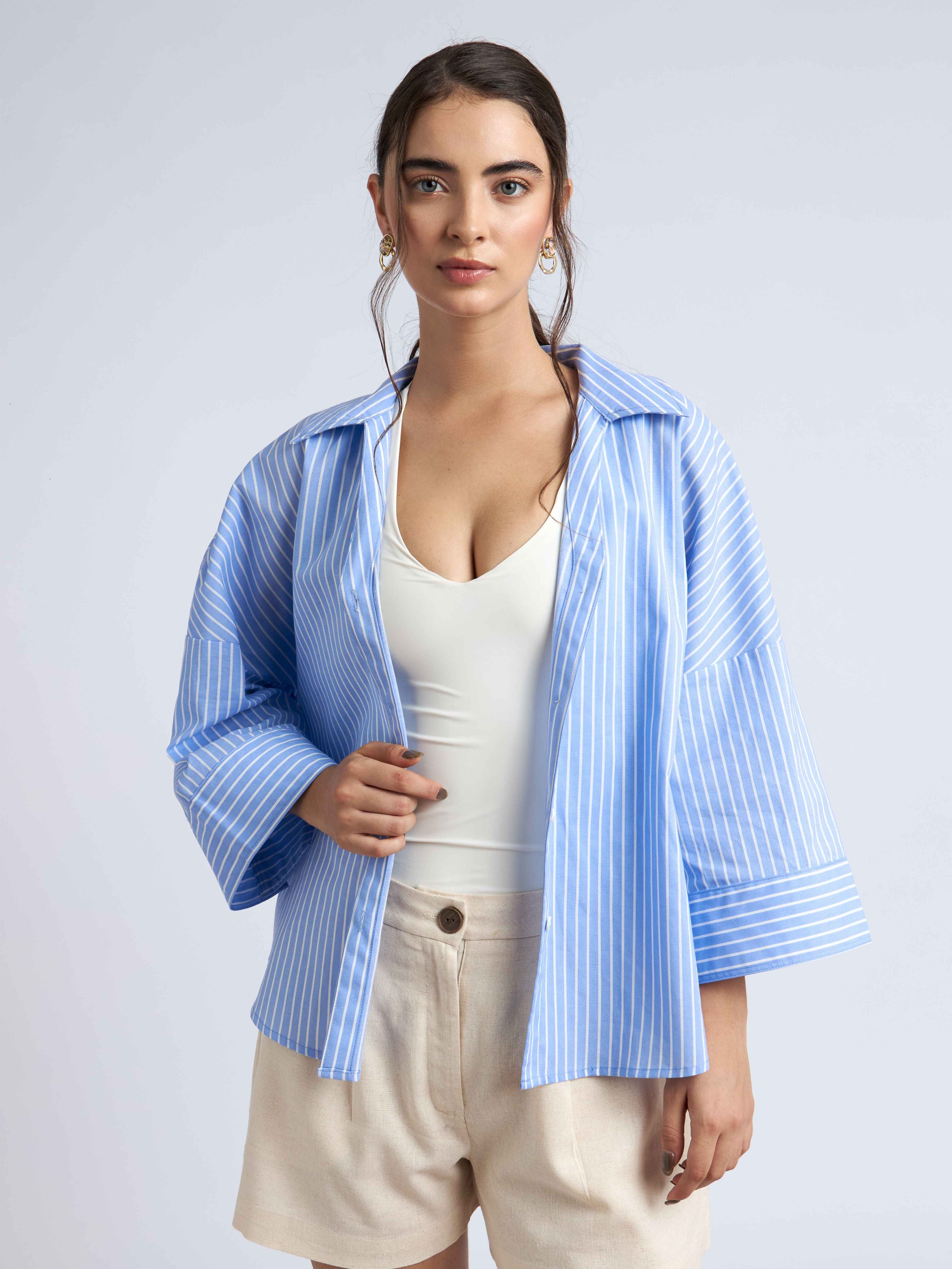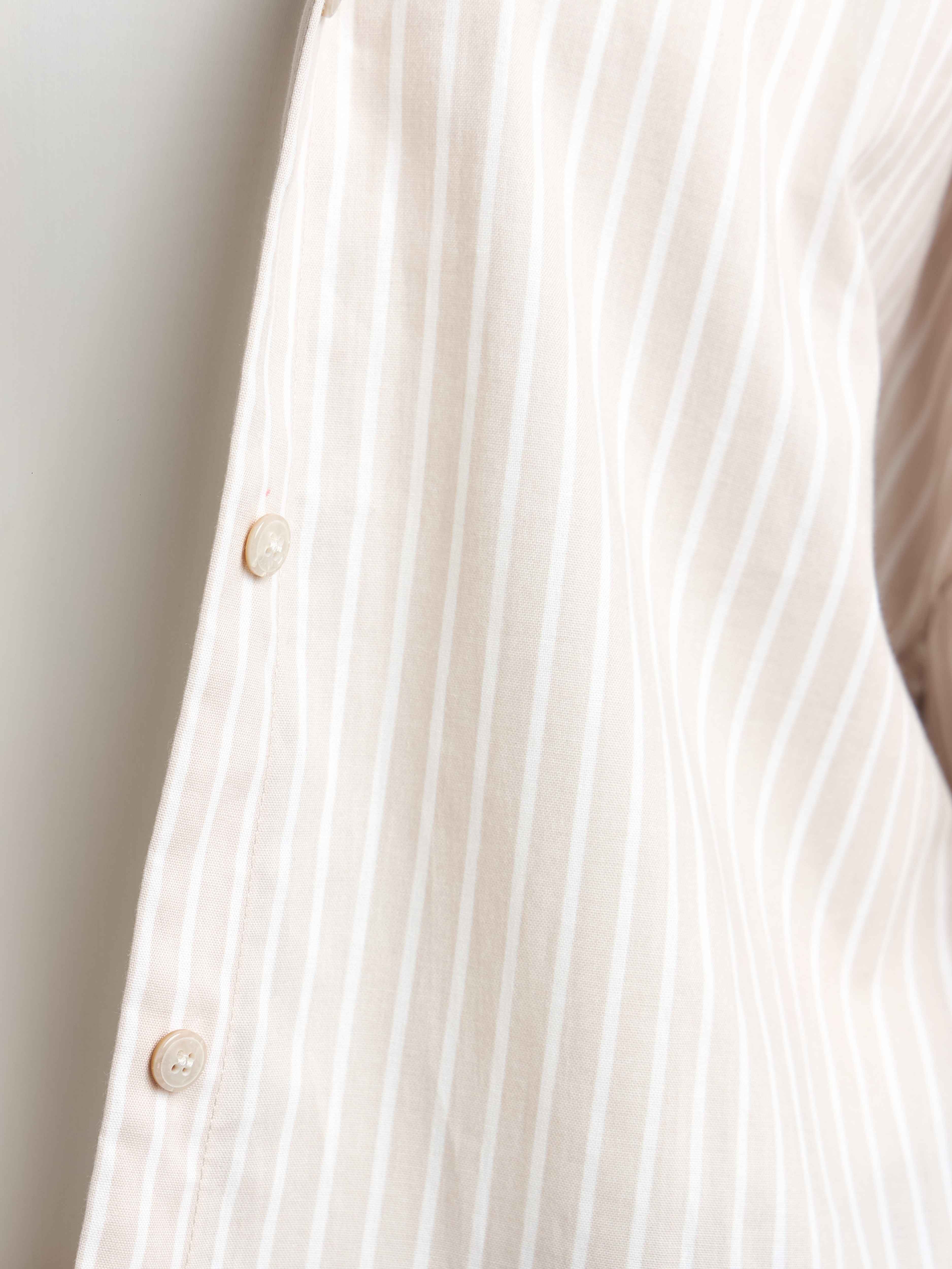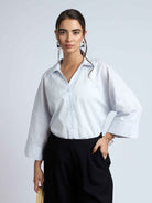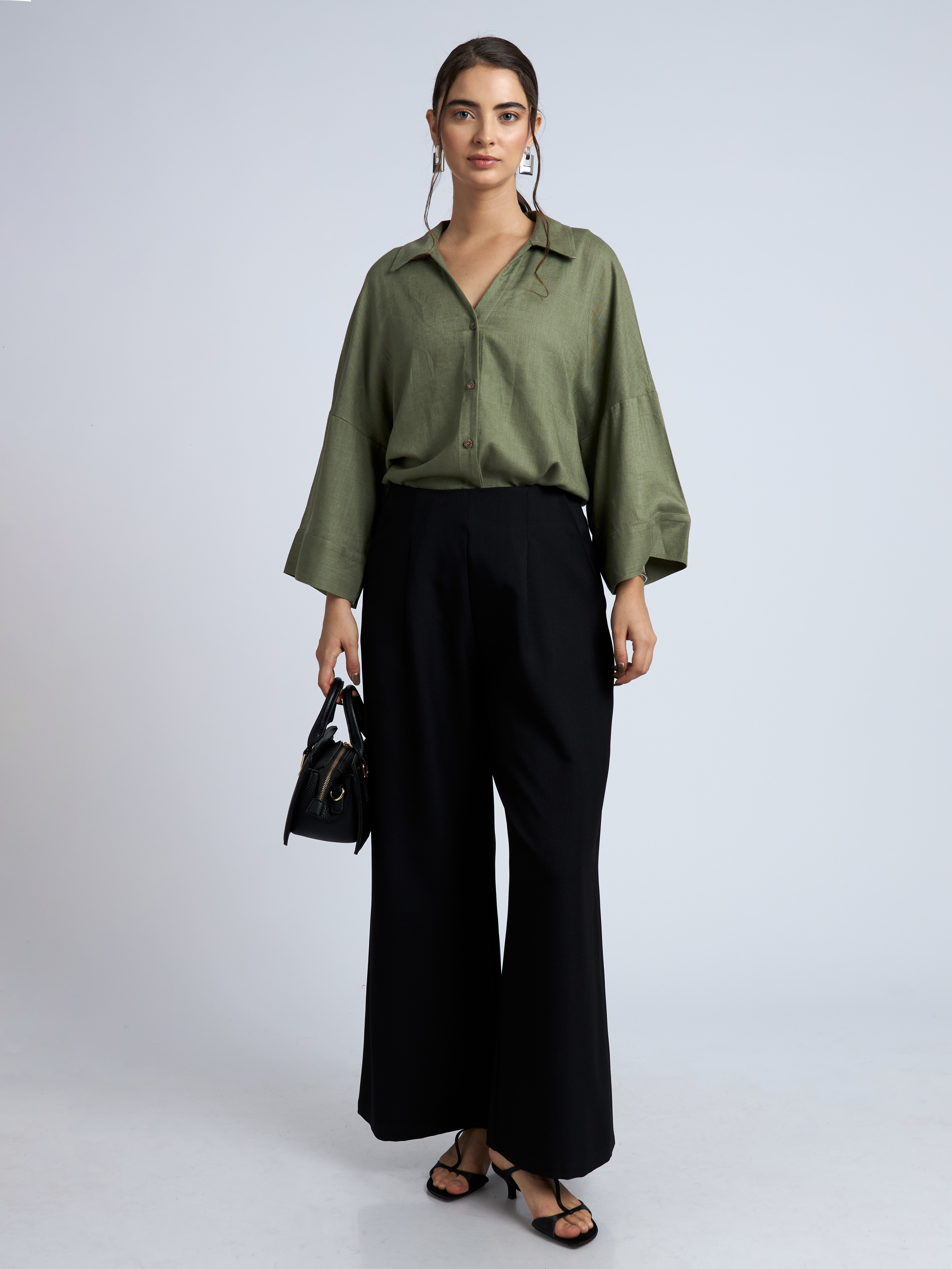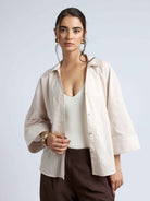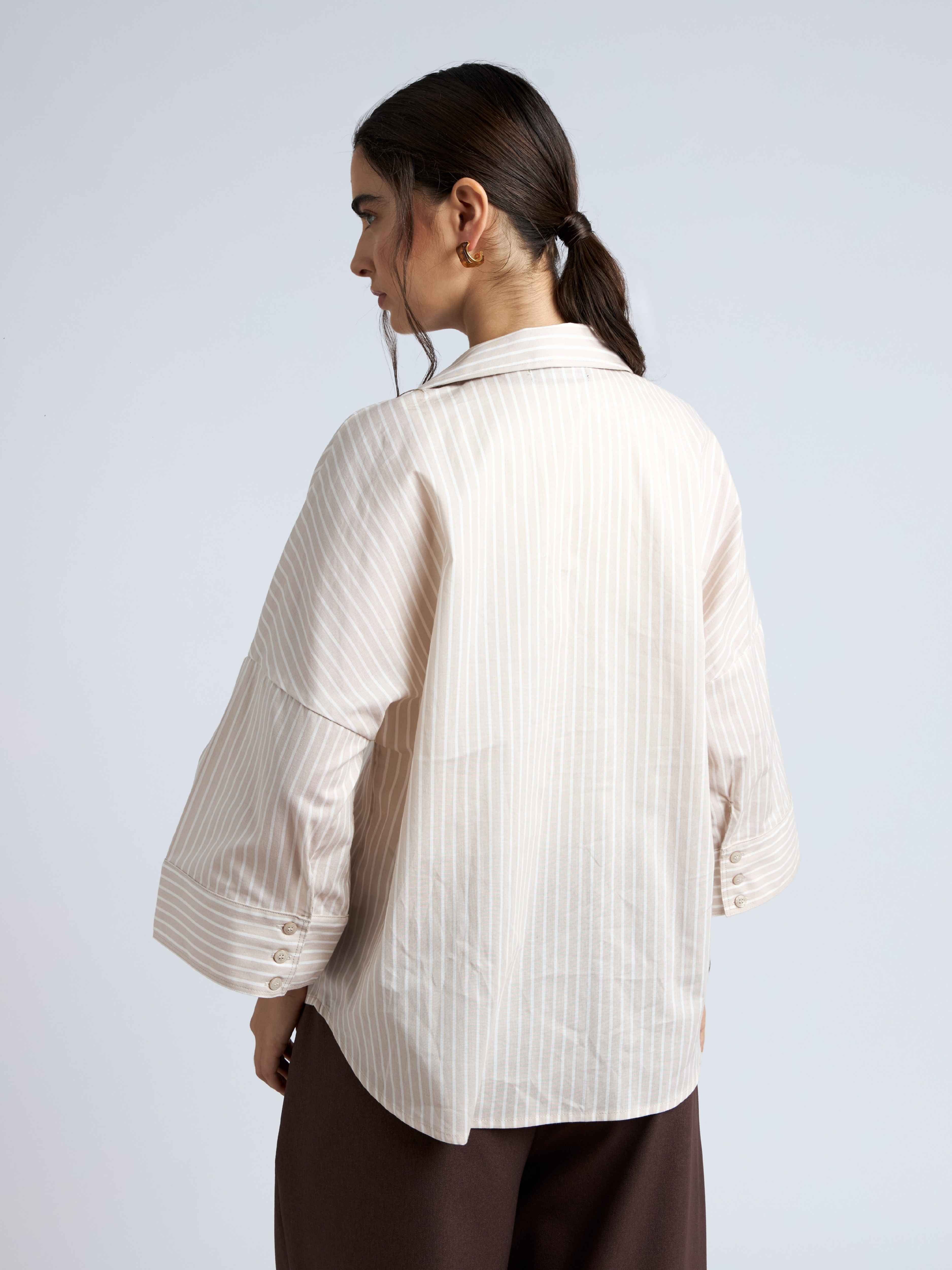 Camisa de fit oversize, manga 3/4 con abertura de manga y tres botones en el puño. Cuenta con hombros caidos y escote en V.