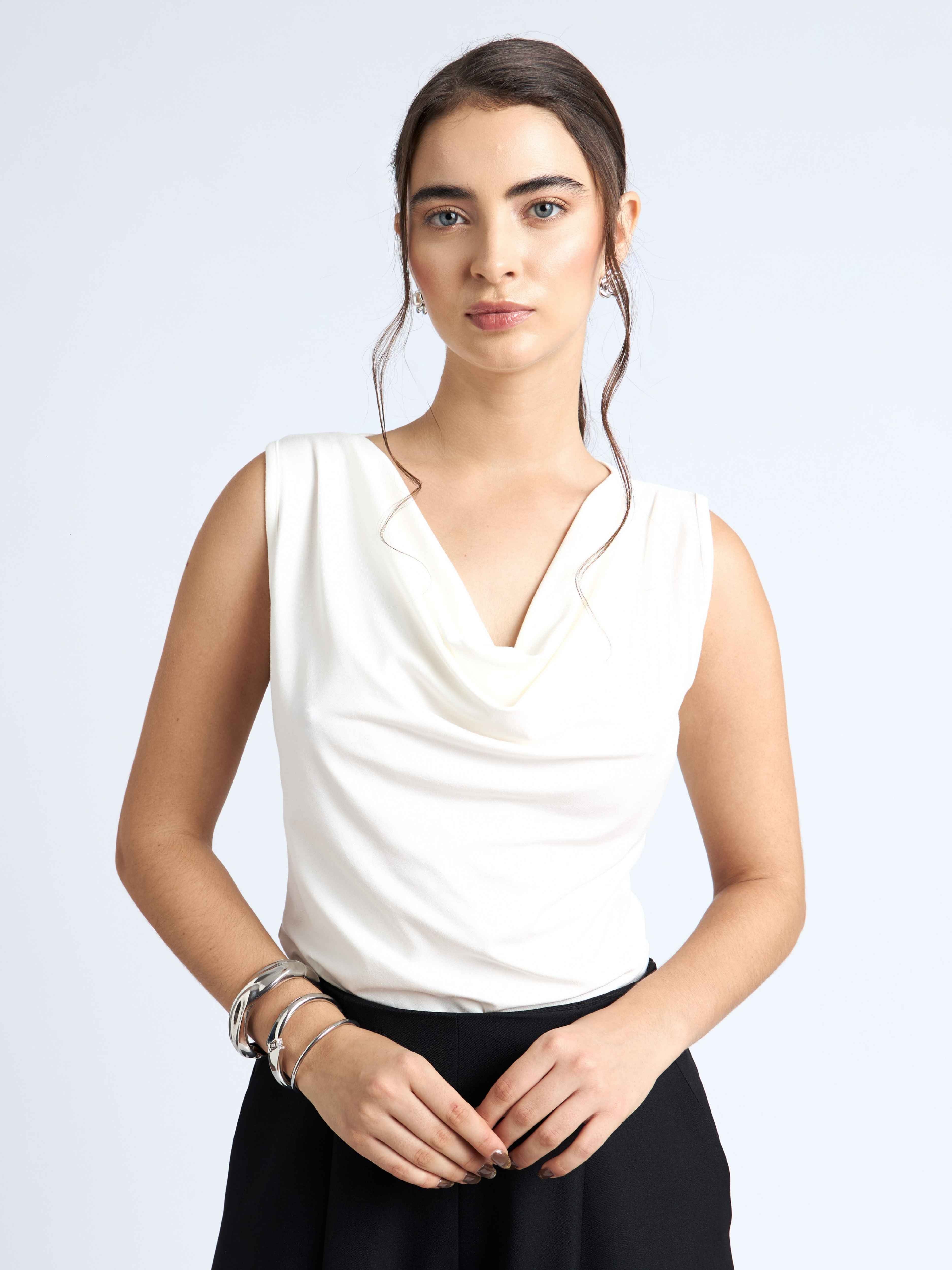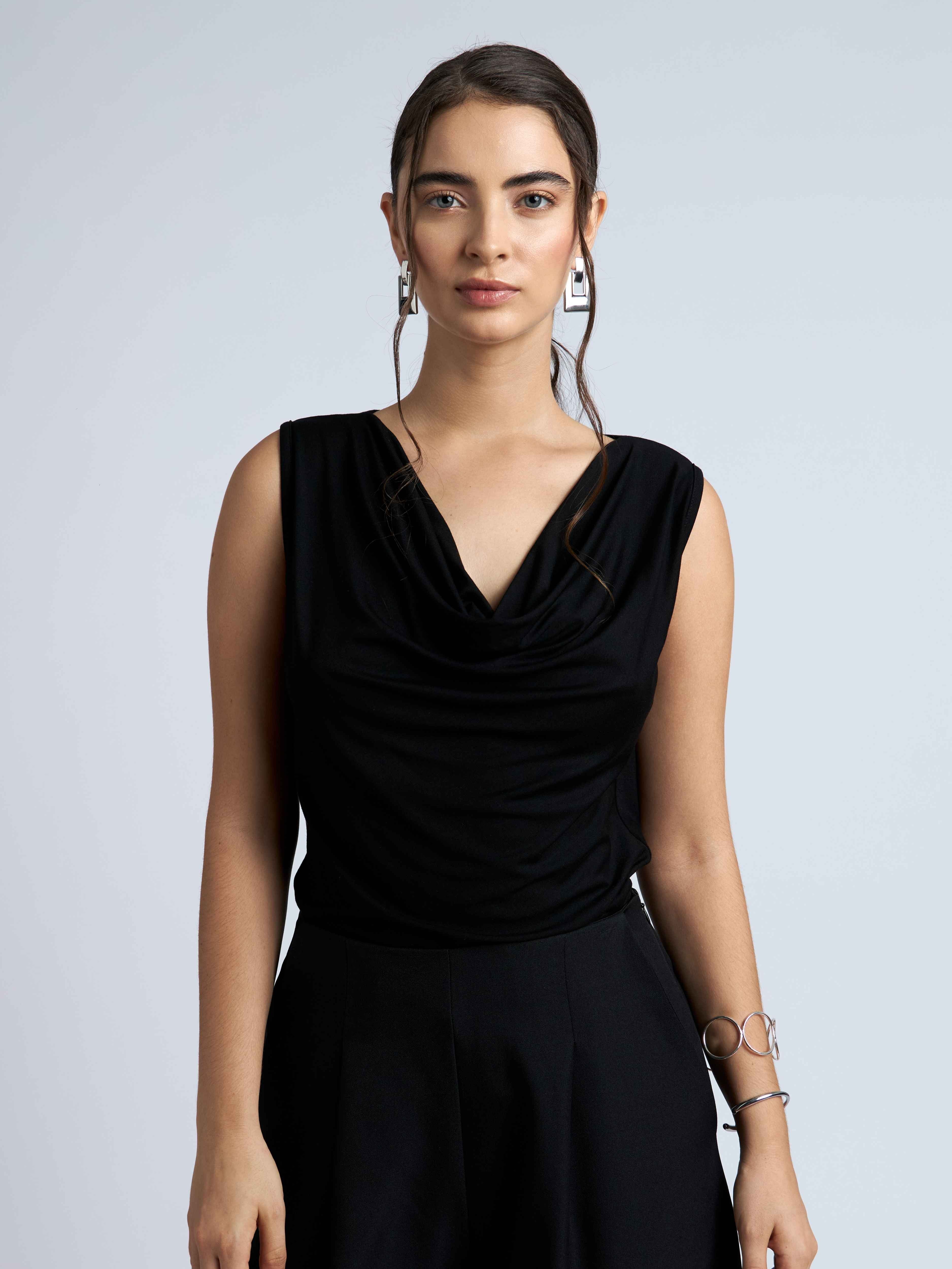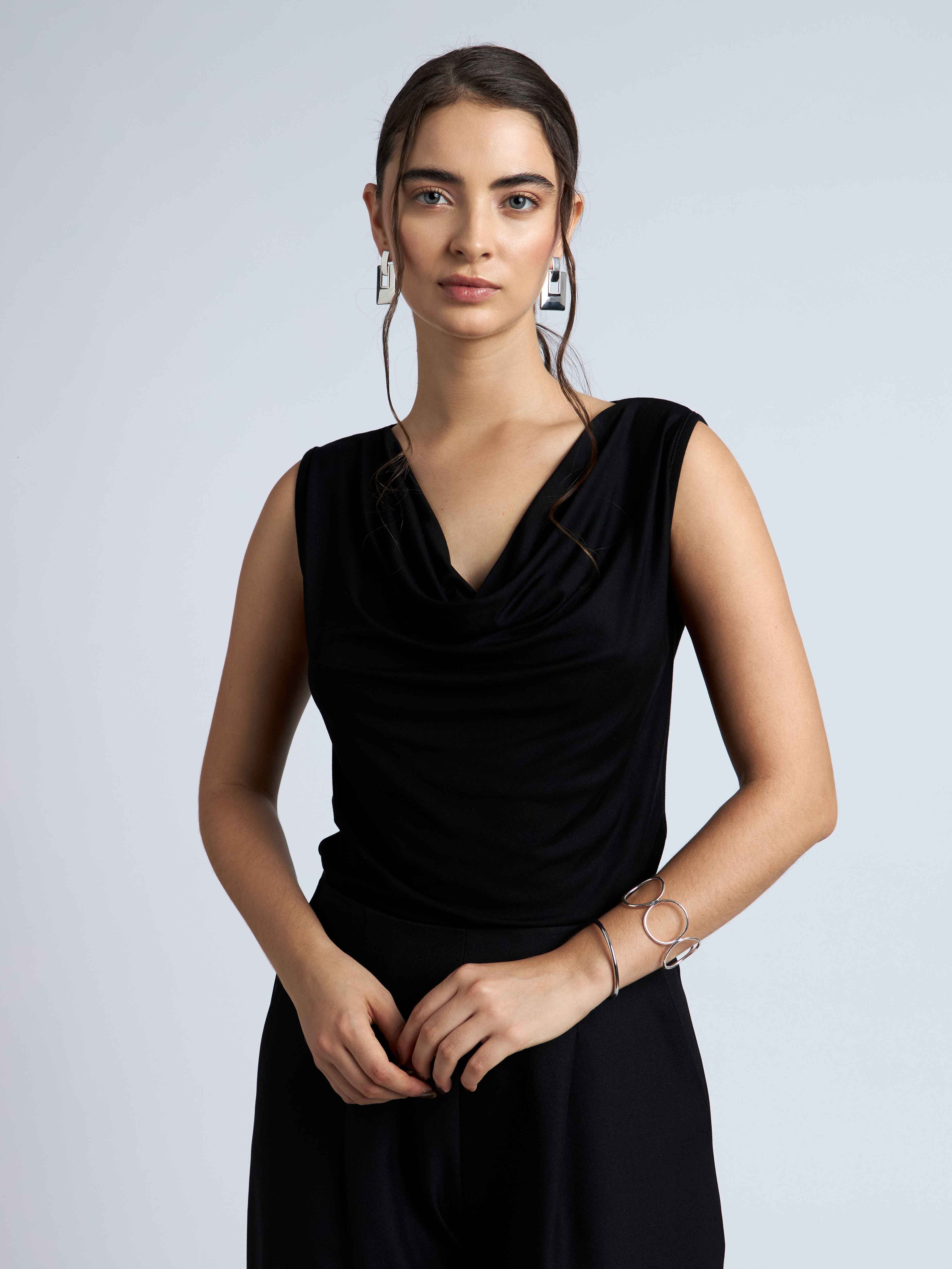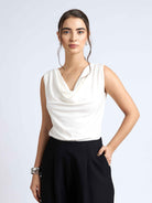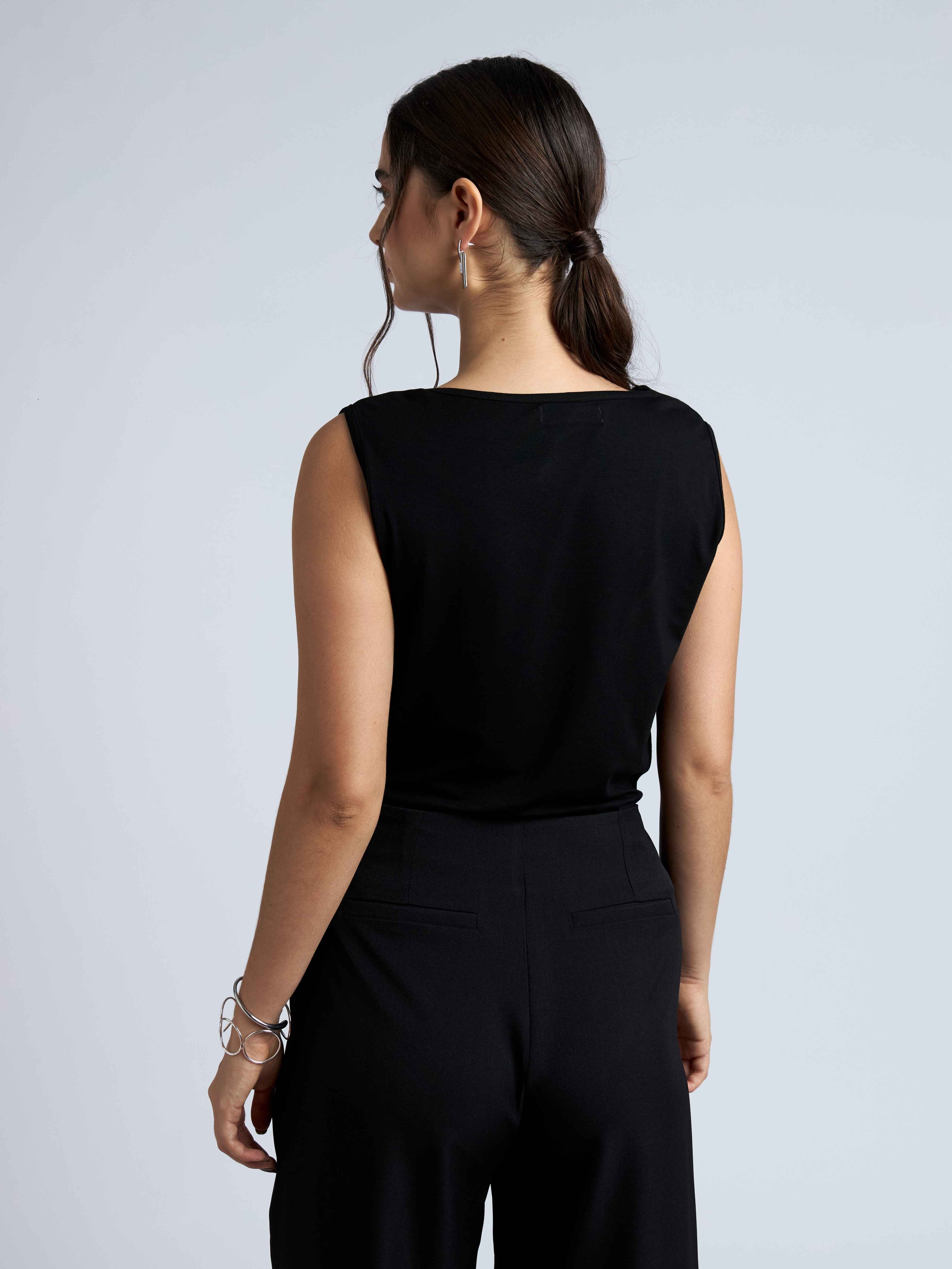 Top sin mangas con escote drapeado y fit regular. Versátil, minimalista y elegante para looks de oficina y casuales.