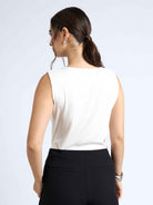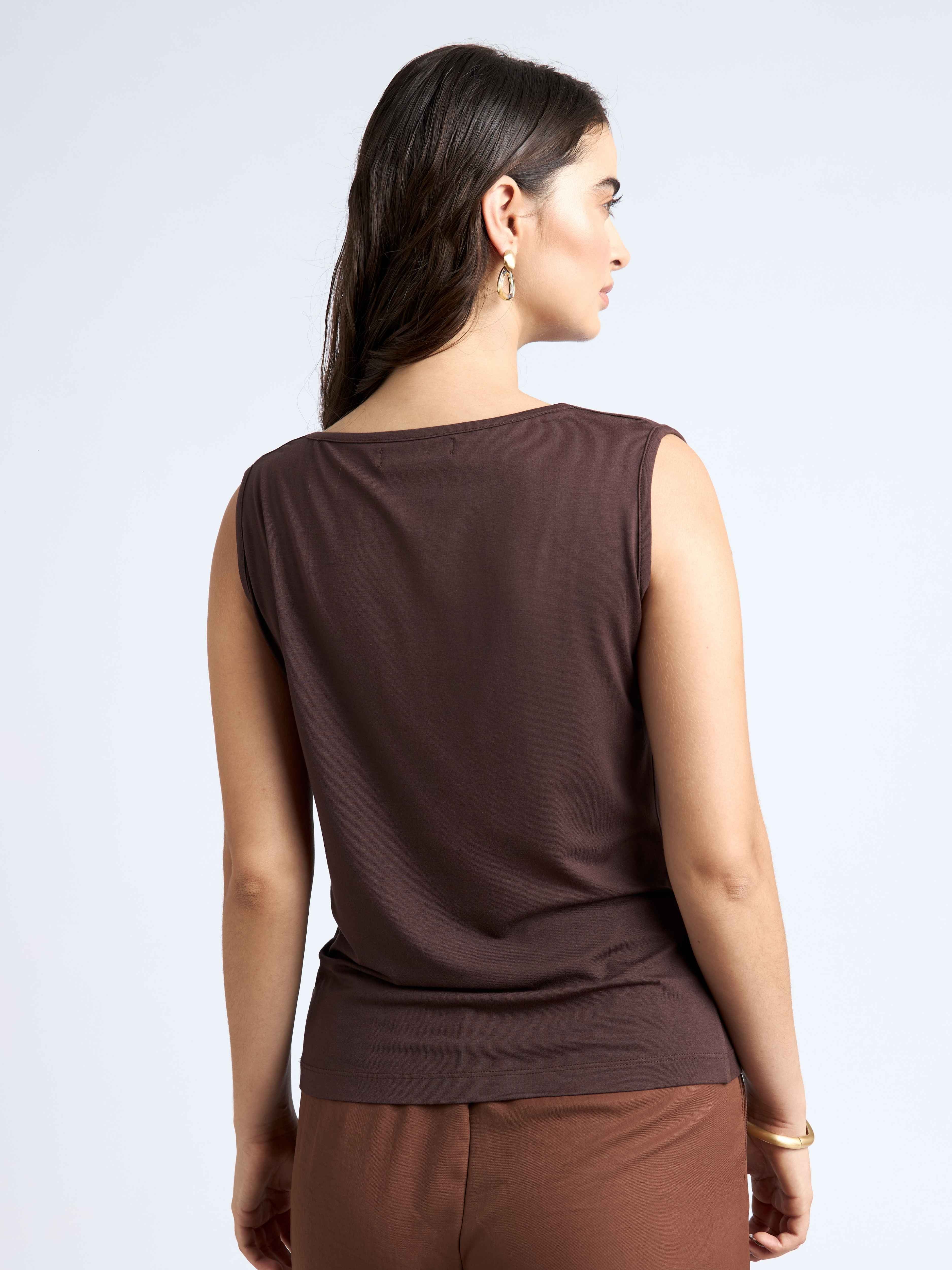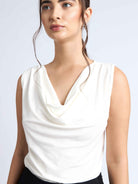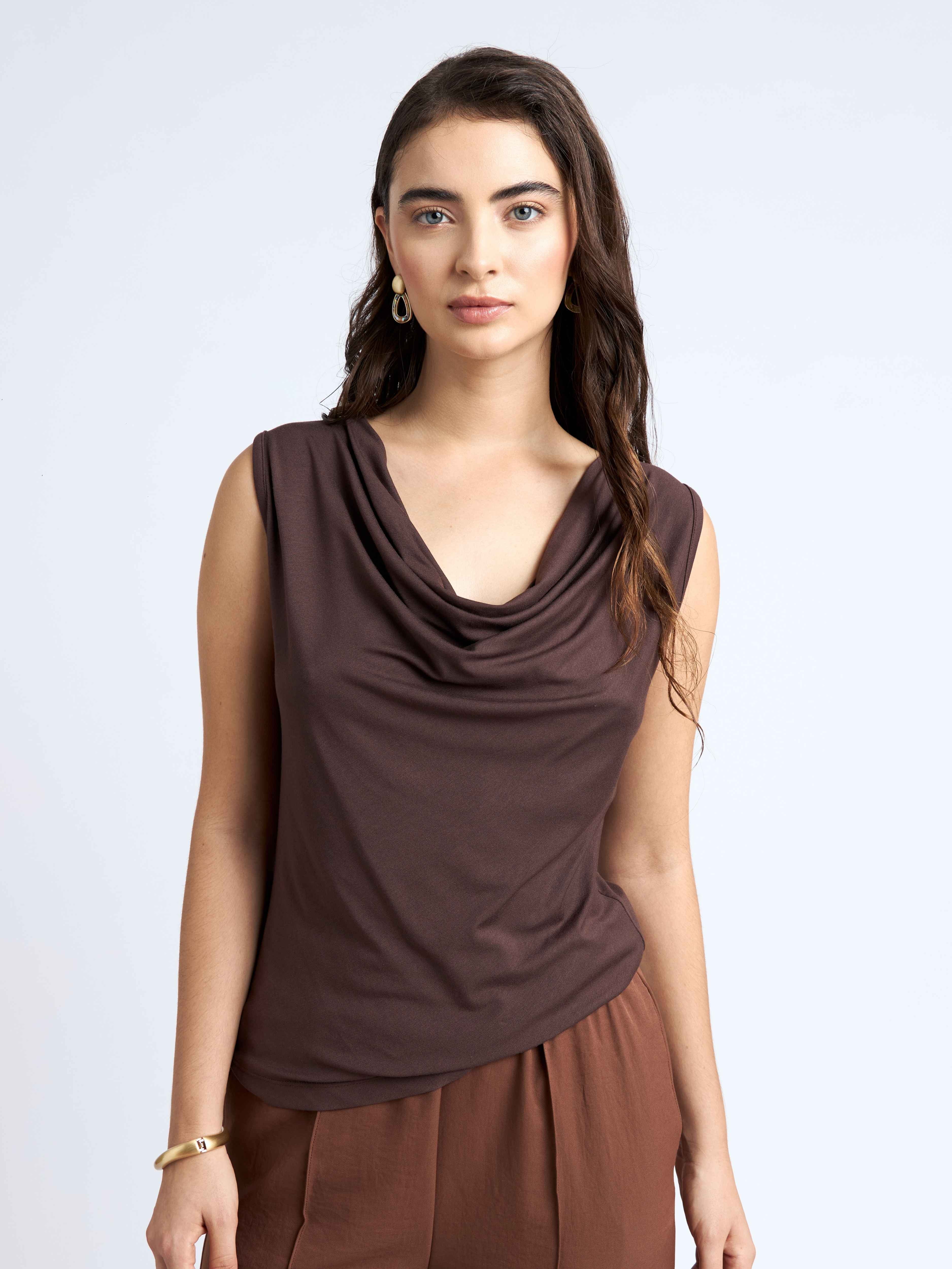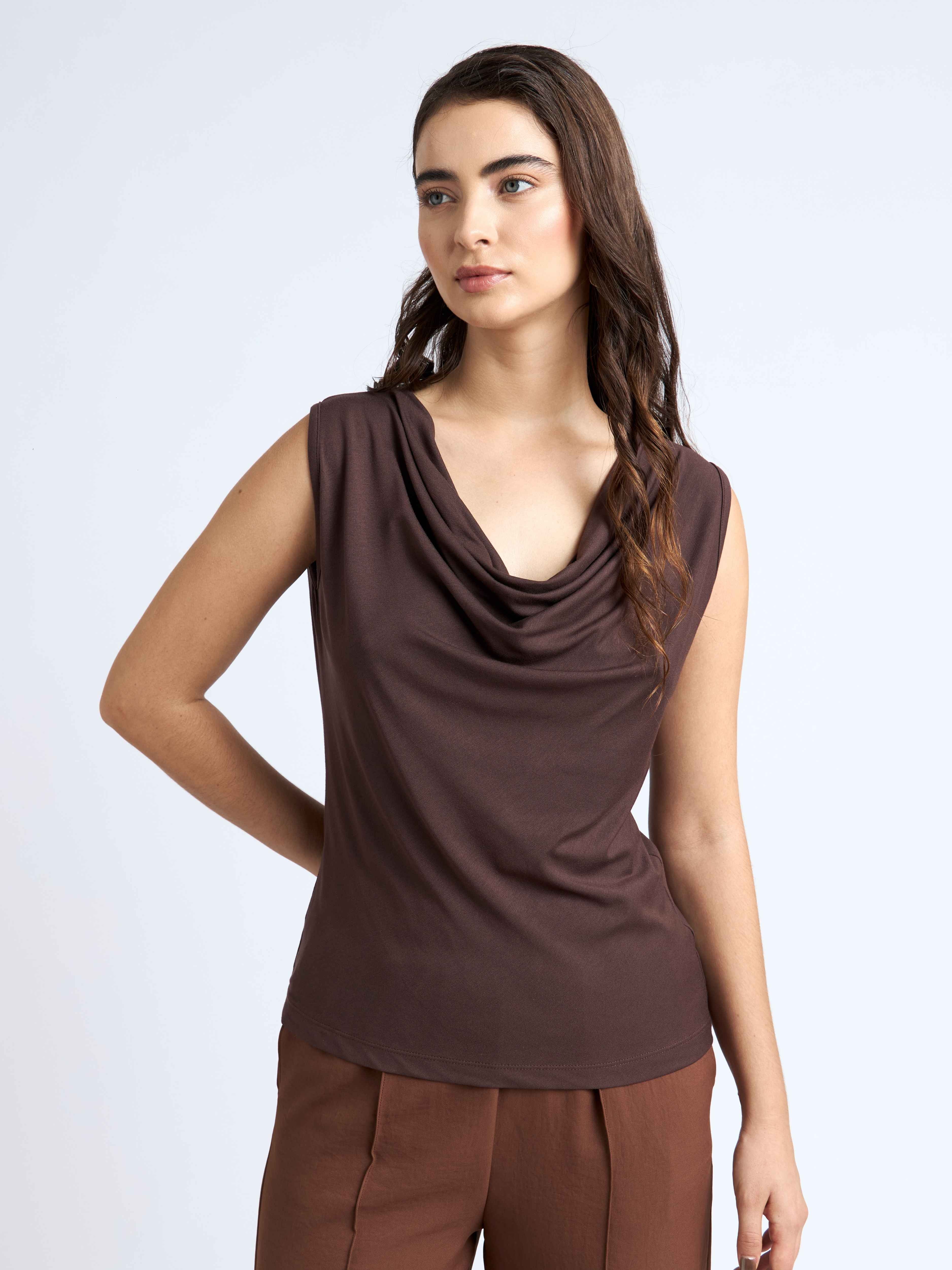 Top sin mangas con escote drapeado y fit regular. Versátil, minimalista y elegante para looks de oficina y casuales.