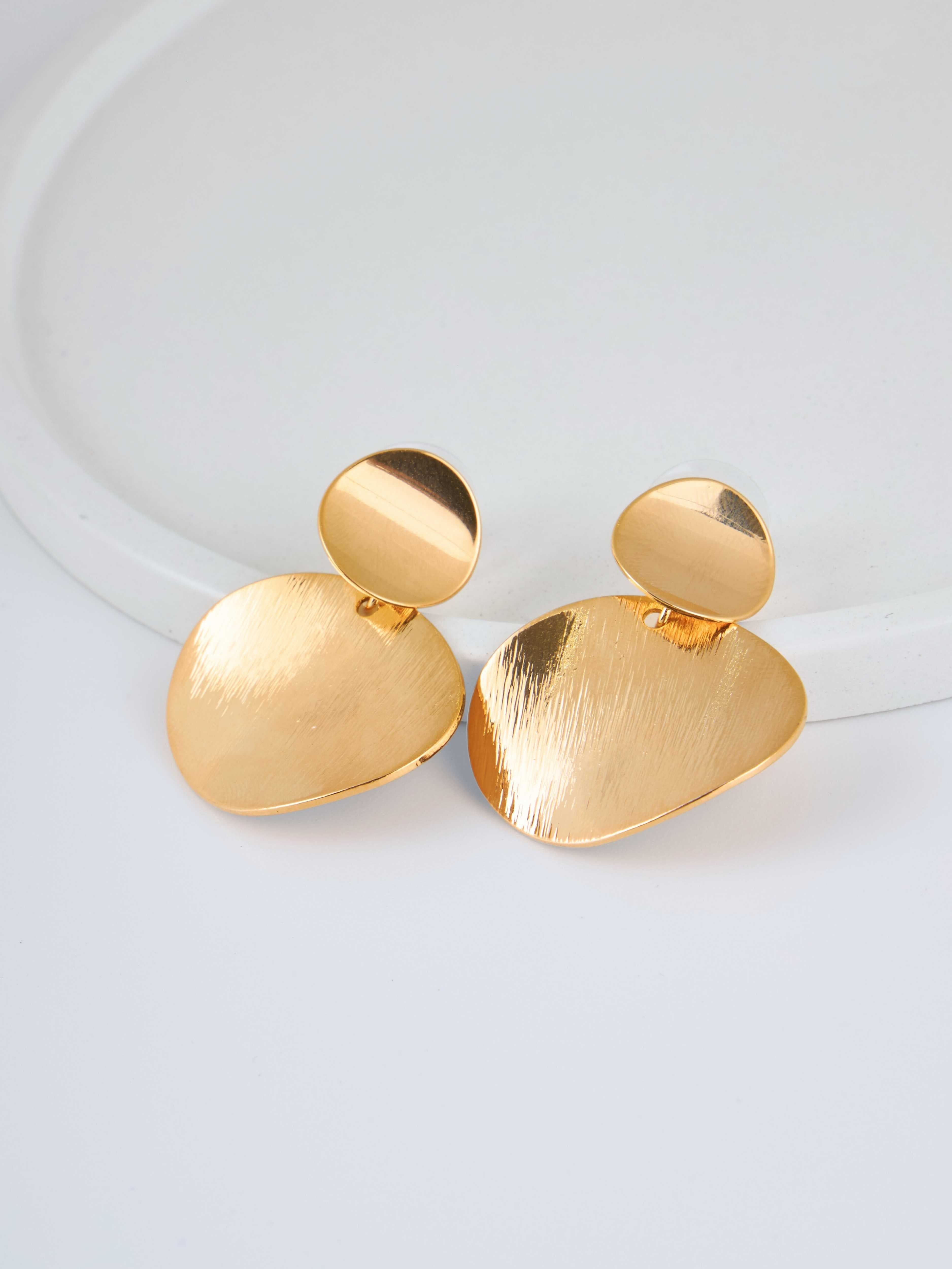 Aretes en forma de gota aplanada con acabado dorado cepillado. Diseño bold y minimalista. Una pieza statement con presencia elegante.